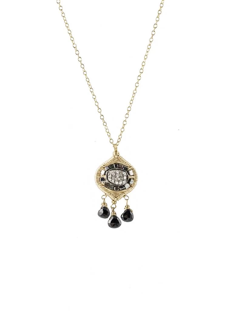 Pave diamonds with black diamond and 14k gold wire wrapped frame and three black spinel dangles on 14k gold chain.