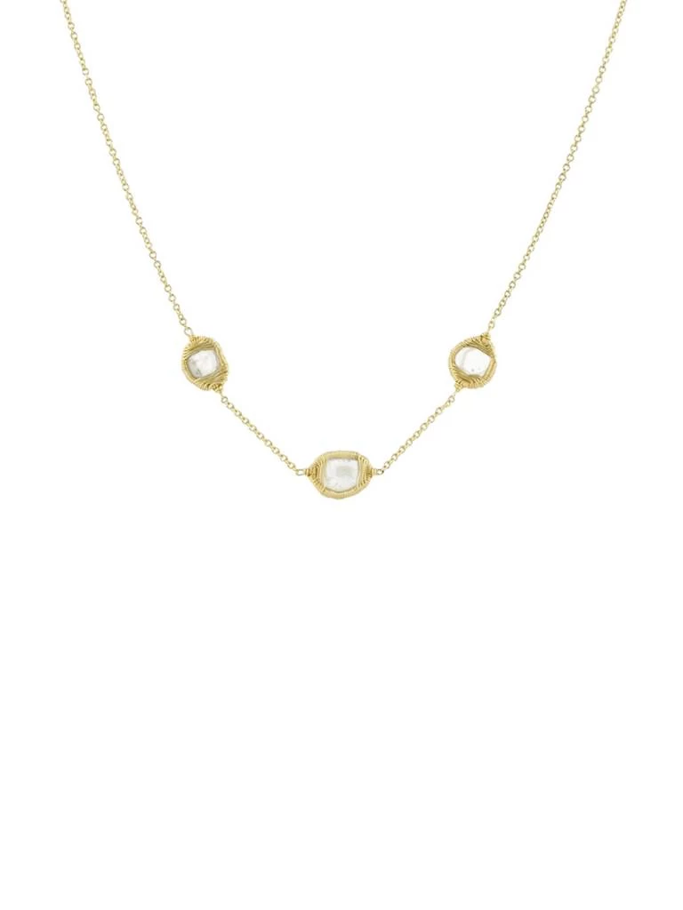 Three sliced diamonds set in 14 karat gold wire-wrapped frames, on 14k chain with lobster clasp closure.