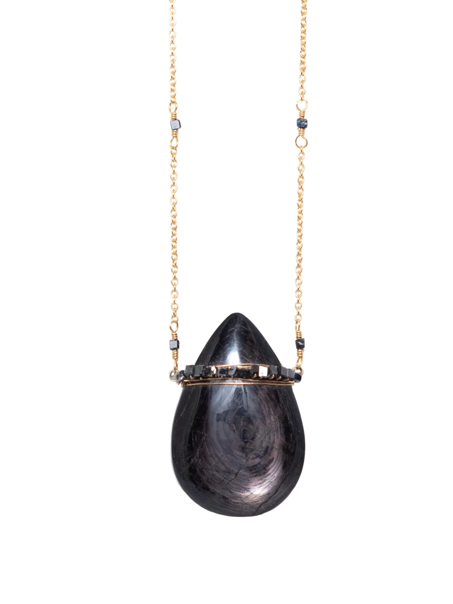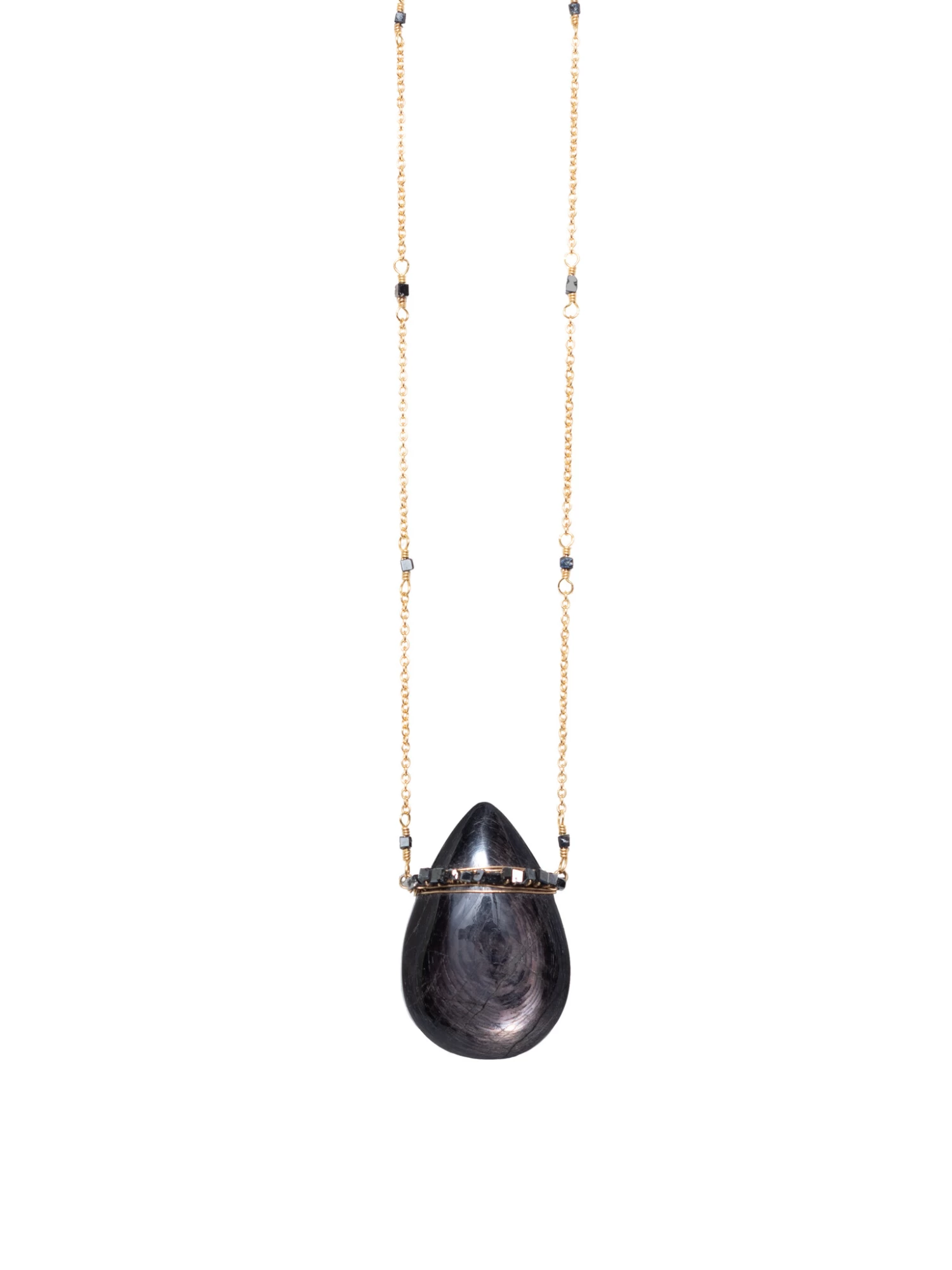 Teardrop shaped diopside stone with diamond details on stone and on 14k gold chain.