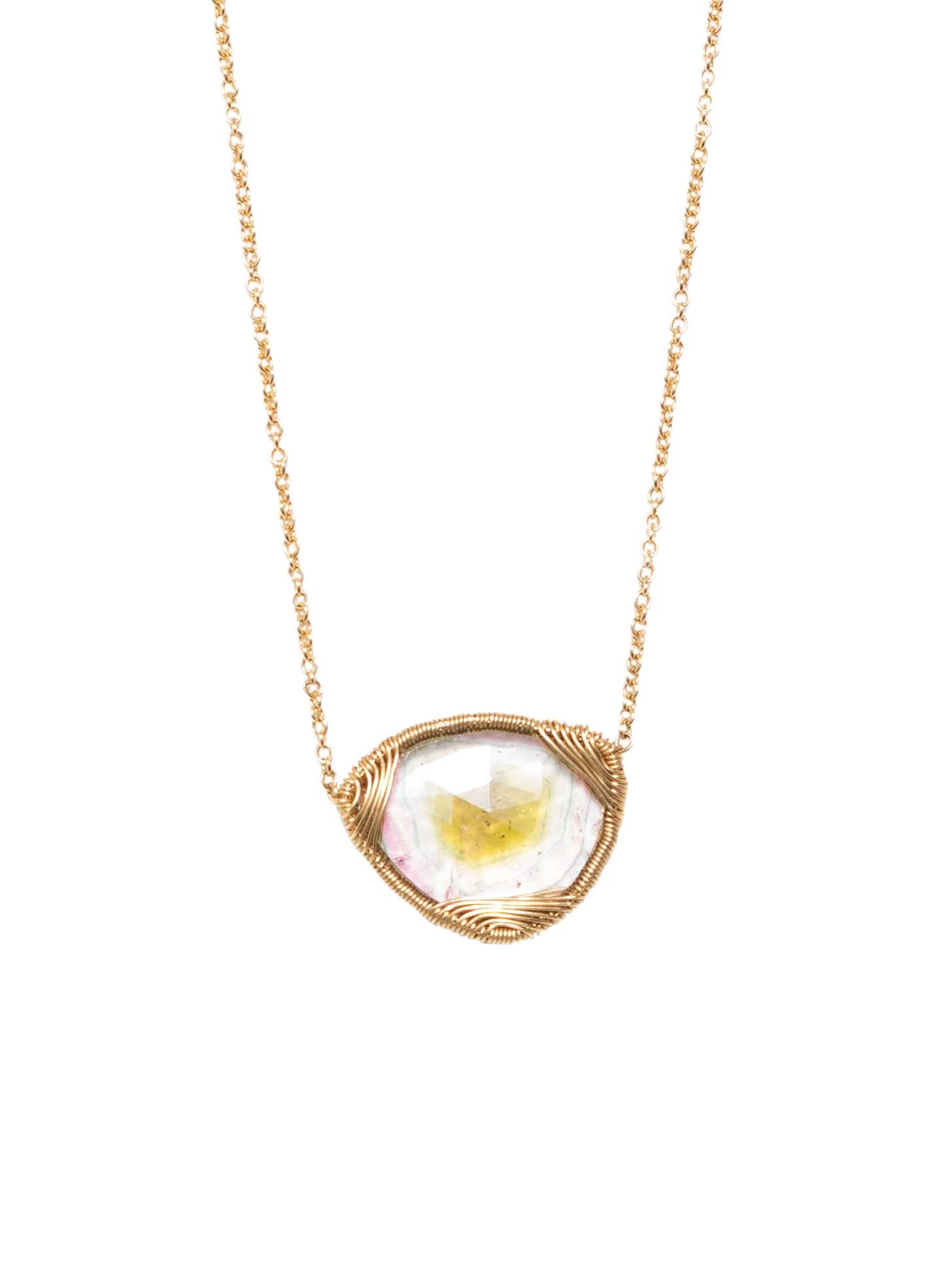 Watermelon tourmaline set in 14 karat gold wire-wrapped frame on 14k chain with lobster clasp closure.