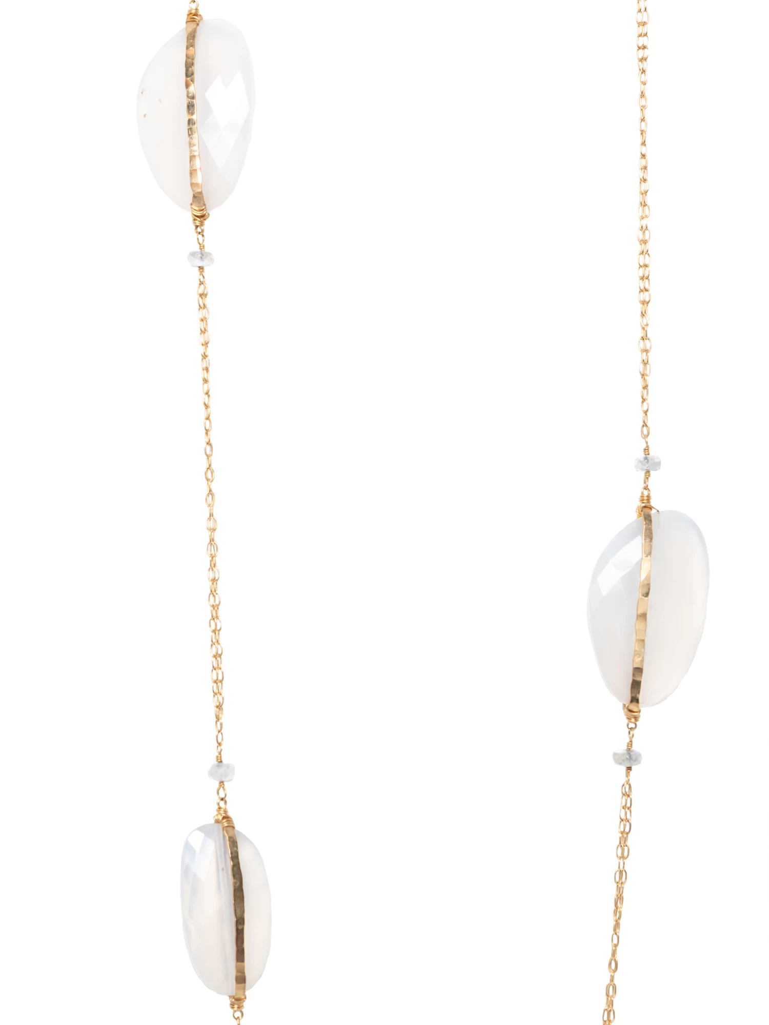 - Each stone has 14k gold wire wrap detail and is attached at both sides to the chain, followed by a small Saloni Moonstone on either side.