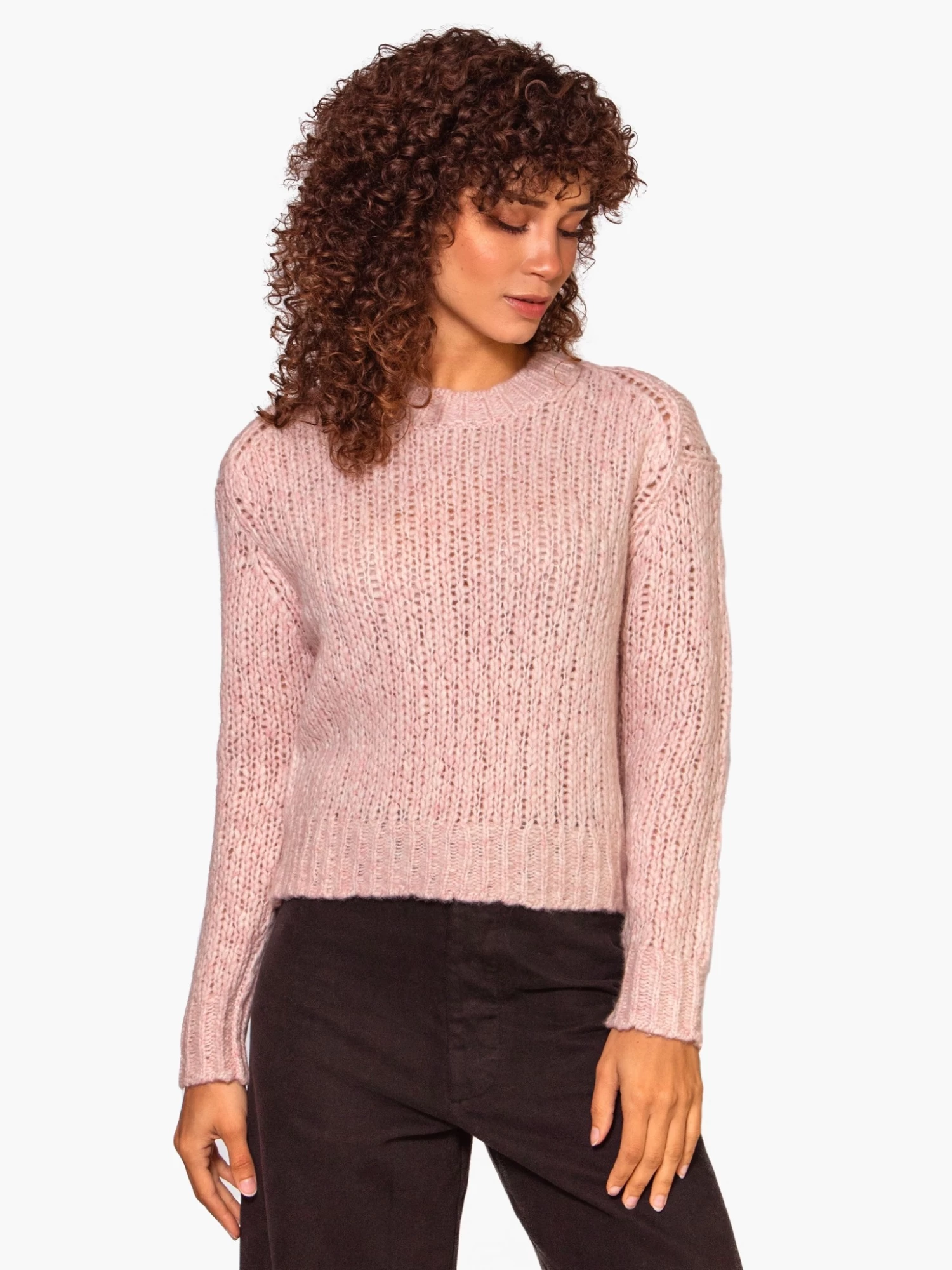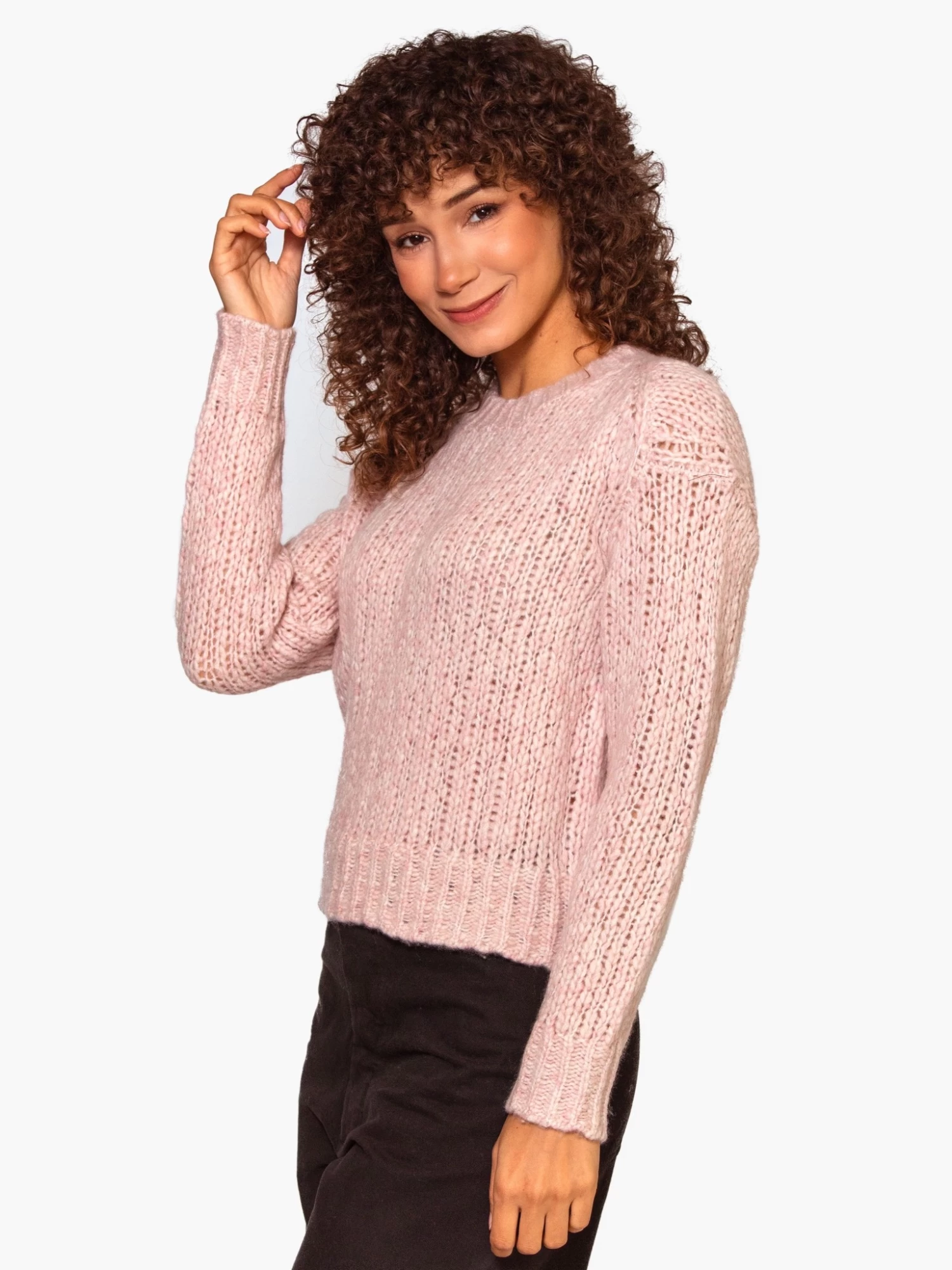 A beautiful cashmere and wool blend sweater in pink, featuring a back, red neckline detail, and grey back.