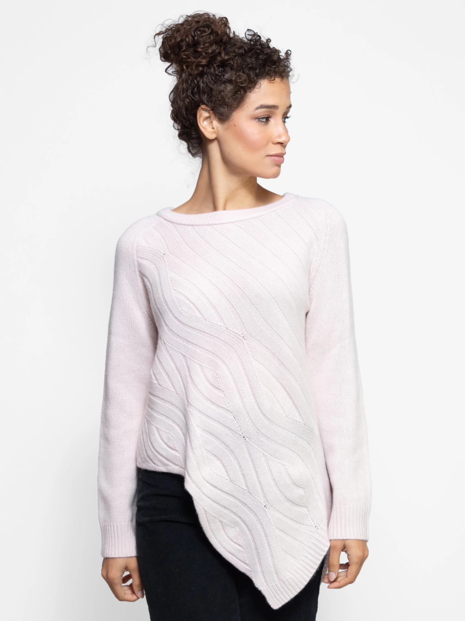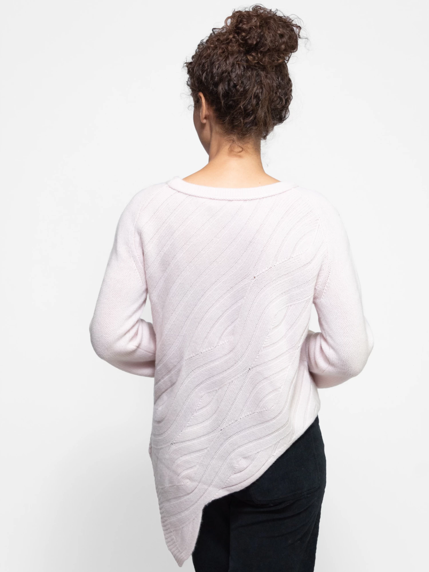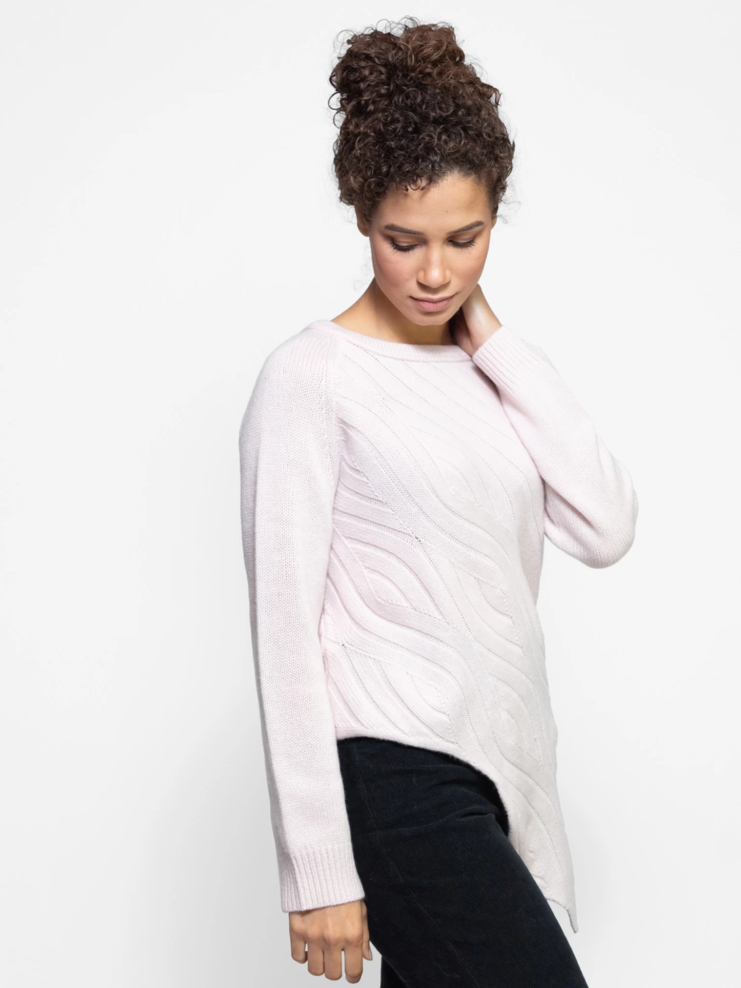 A cashmere sweater with an abstract angled cable knit hem in soft posy pink.