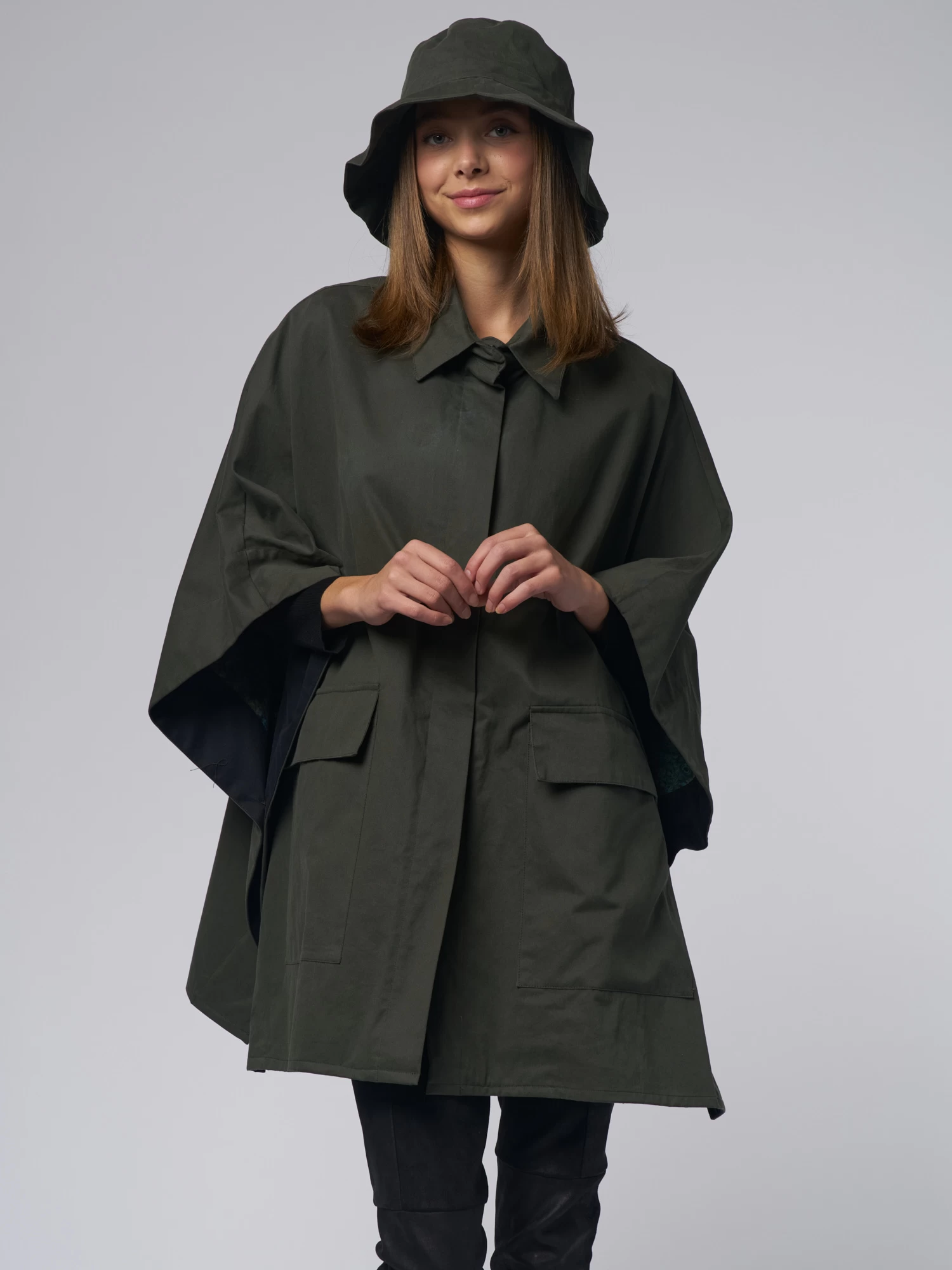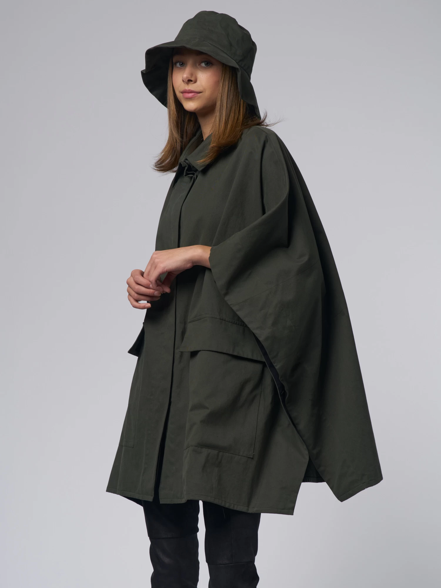 The Cotton Pancho Coat with water-repellent treatment has button closure, front patch pockets, and a matching hat.