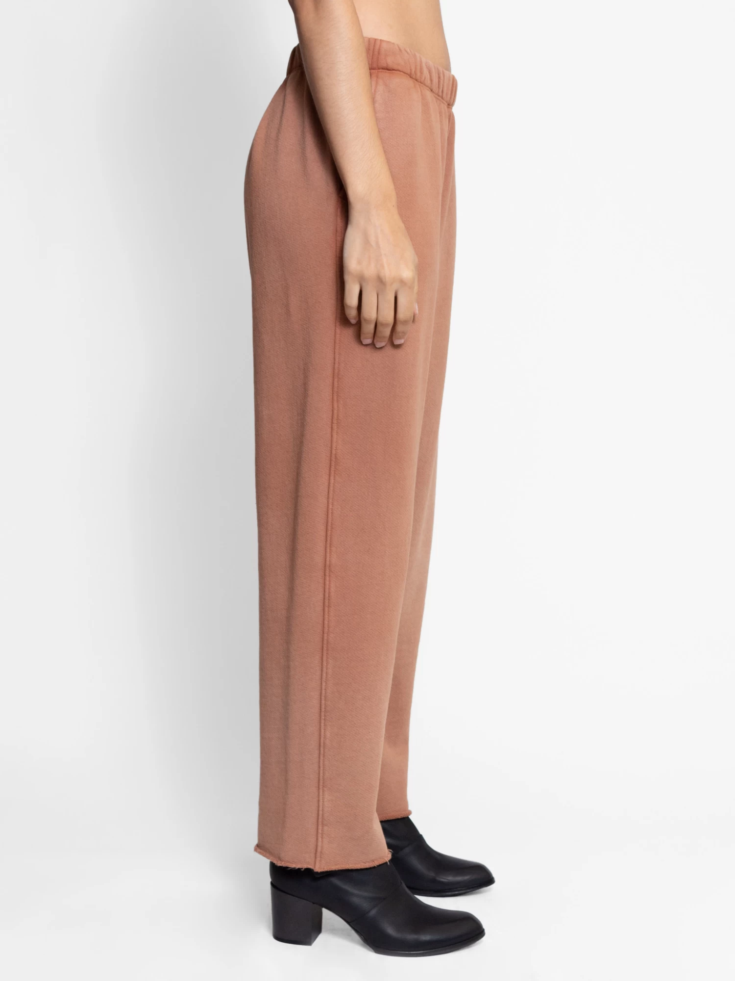 Pull on sweatpant with an elasticated waistband, side seam pockets, and a raw hem in muted light brown terra fleece.