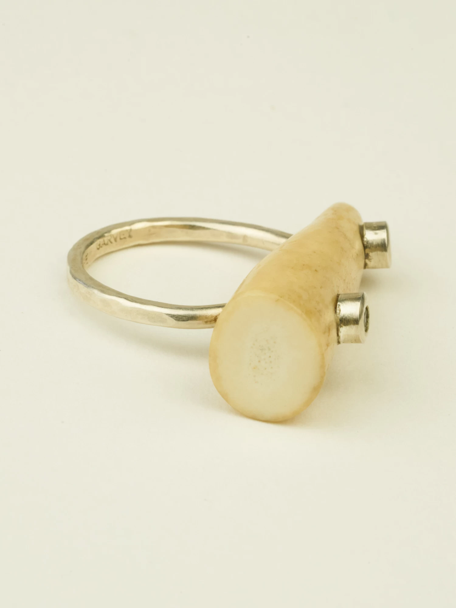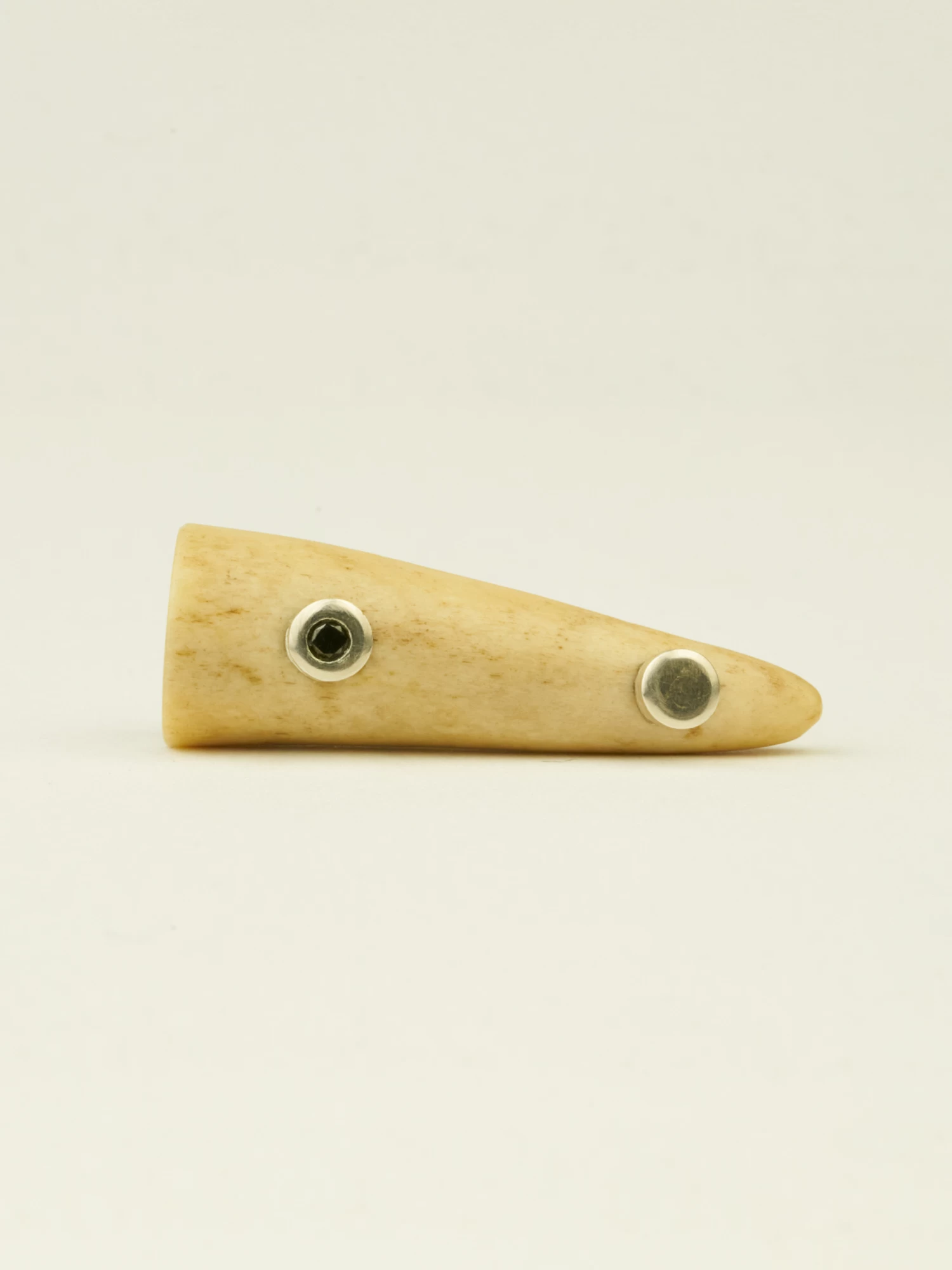 A naturally shed antler with a sterling silver band and black diamond nail head.