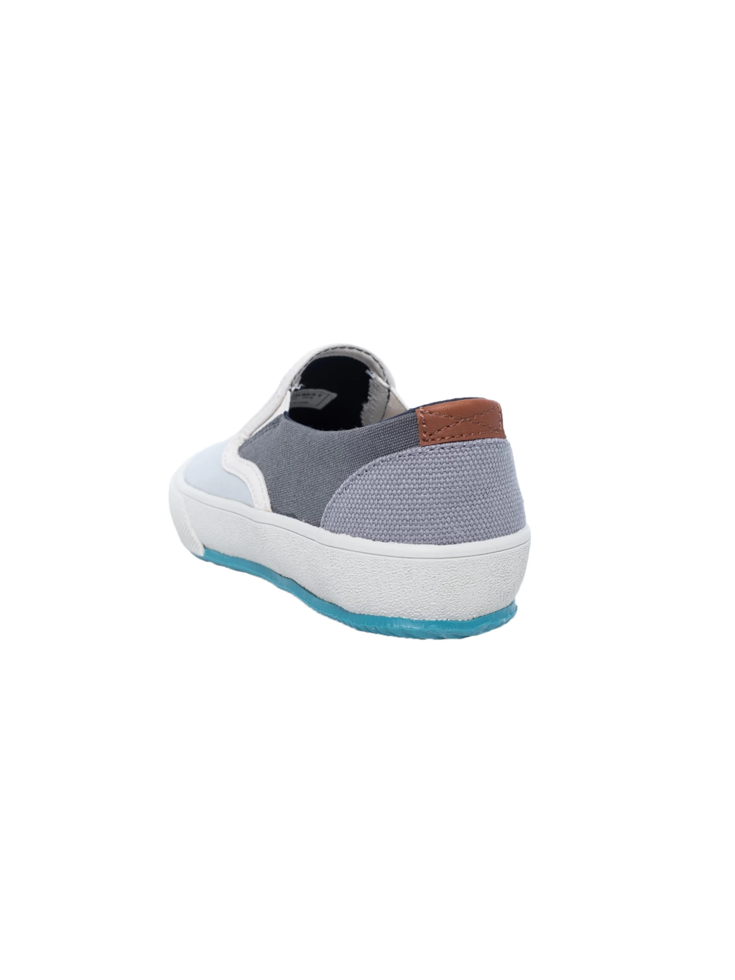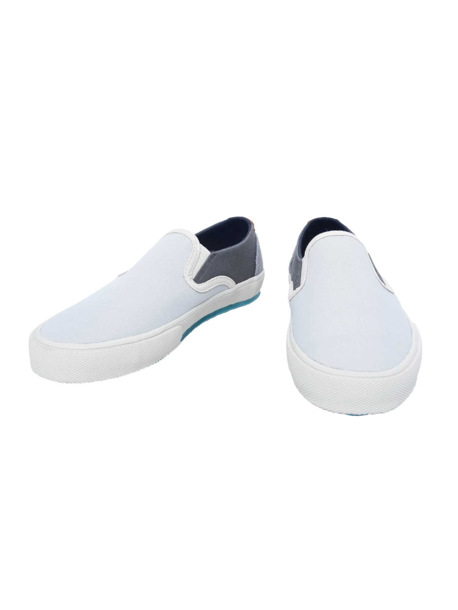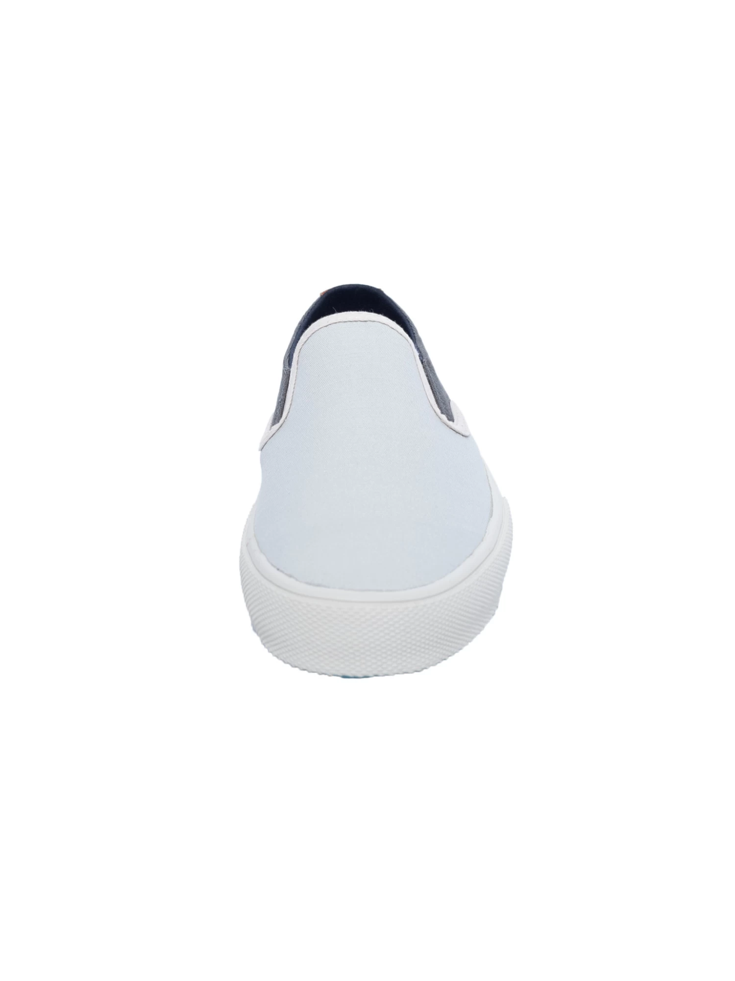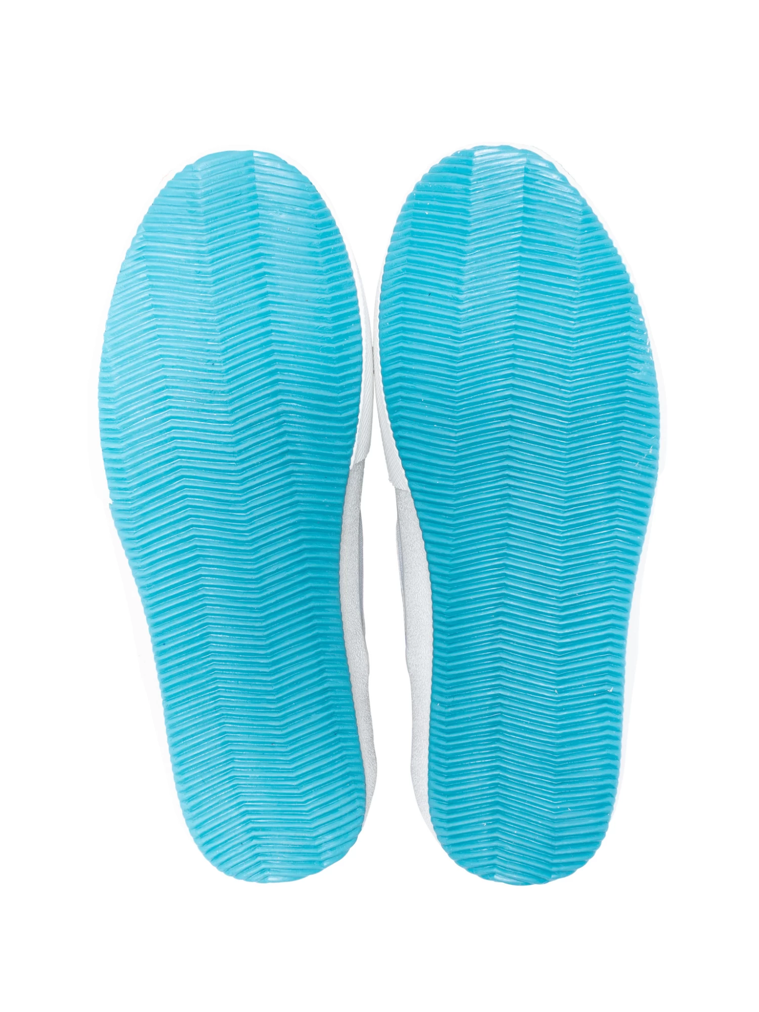 A lightweight, slip-on sneaker with a light blue canvas body and a textured, turquoise, rubber sole.