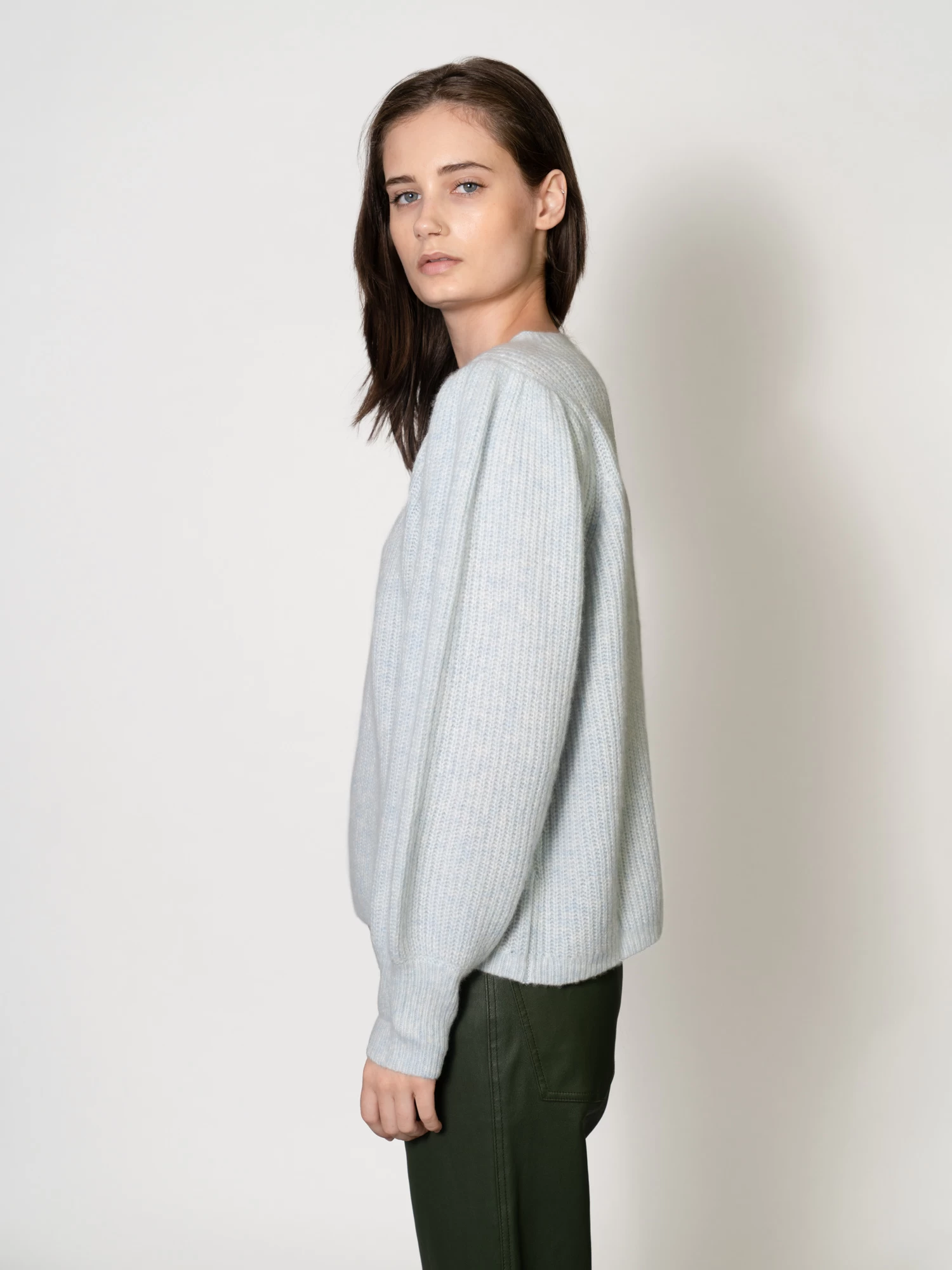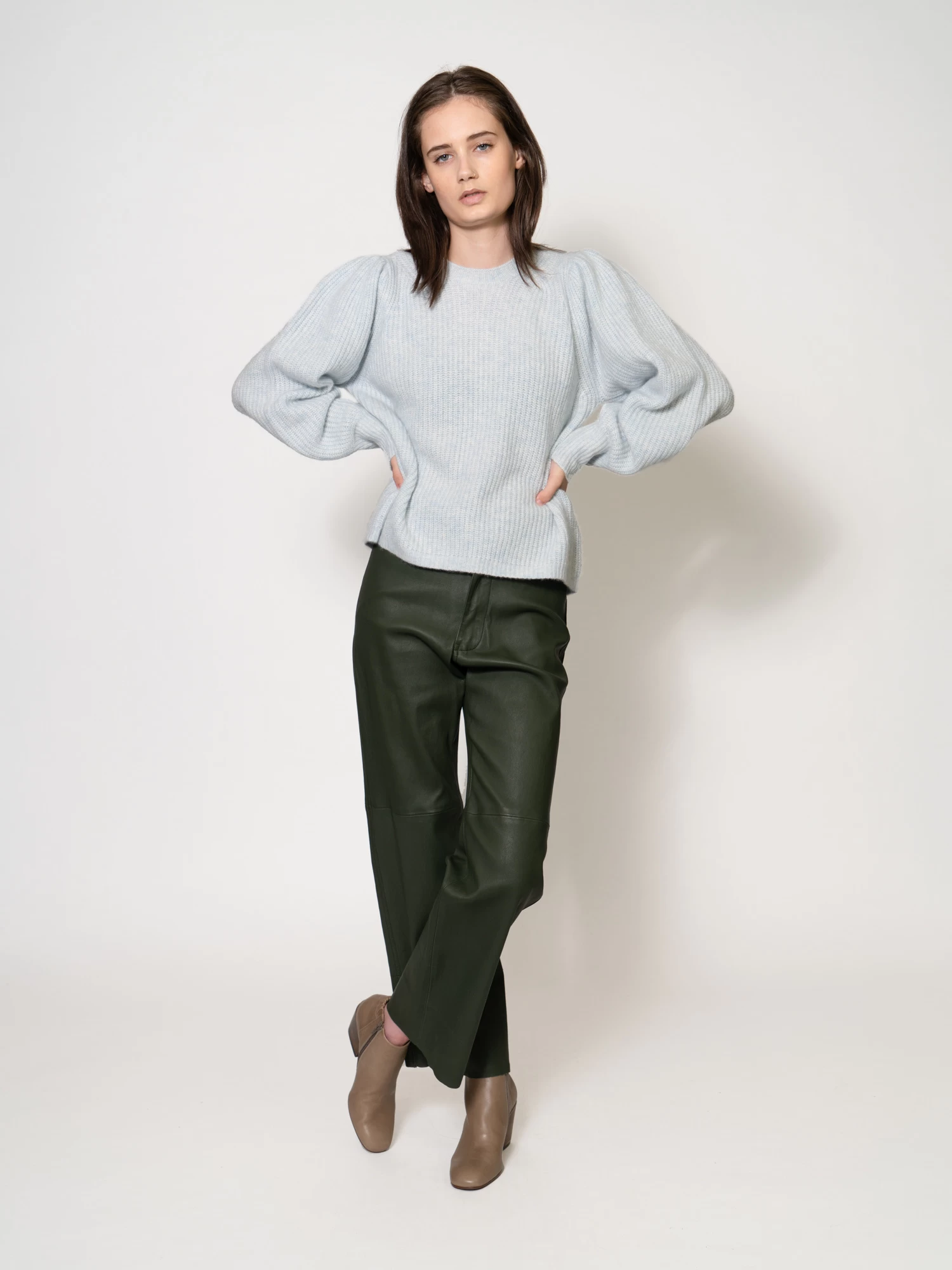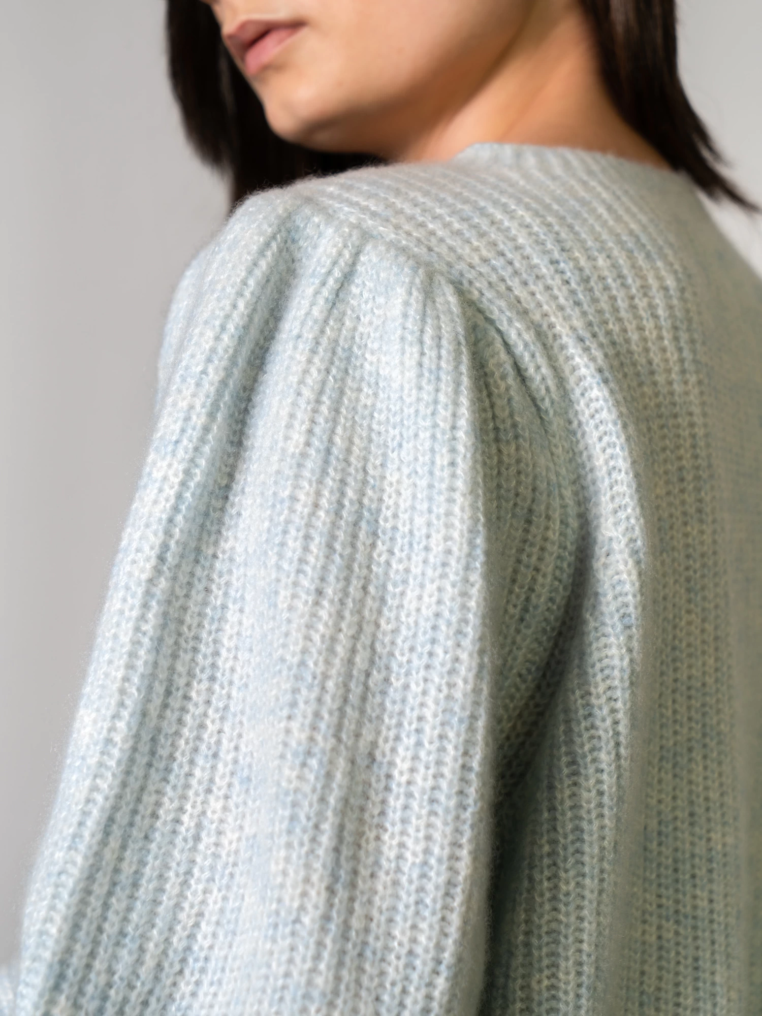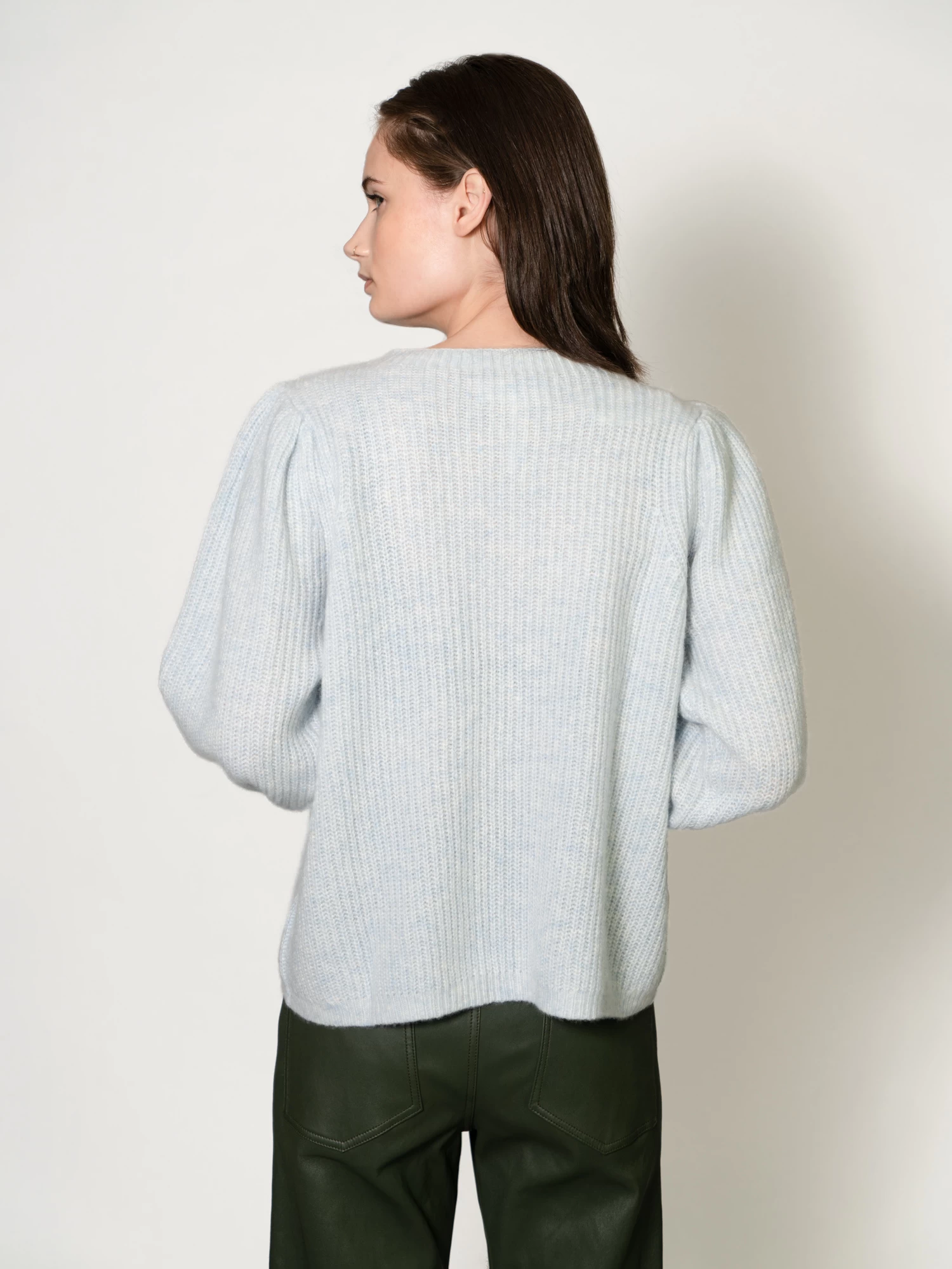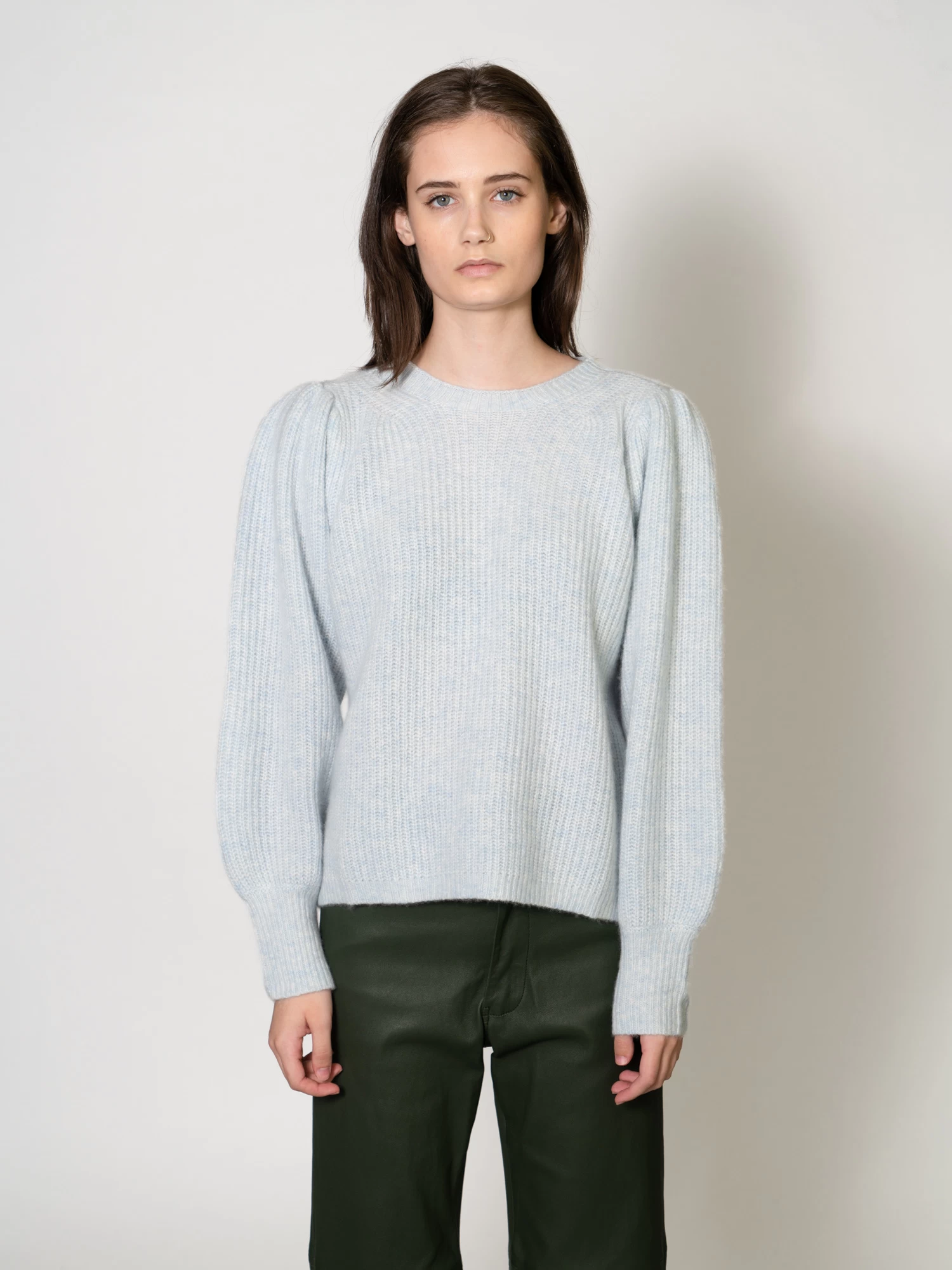 Crew neckline, puff sleeve, a rib-knit, and blend of cashmere and silk sweater.