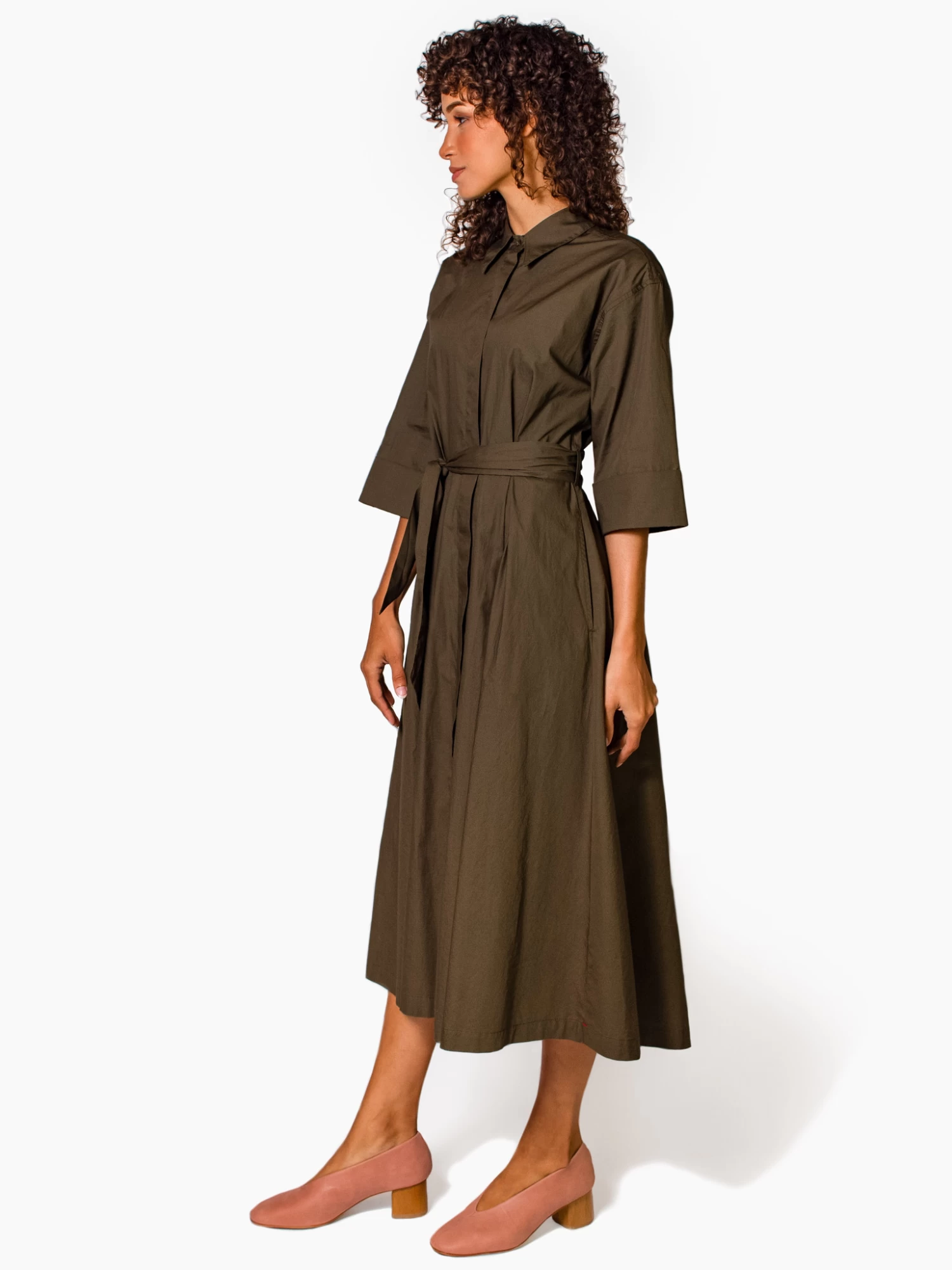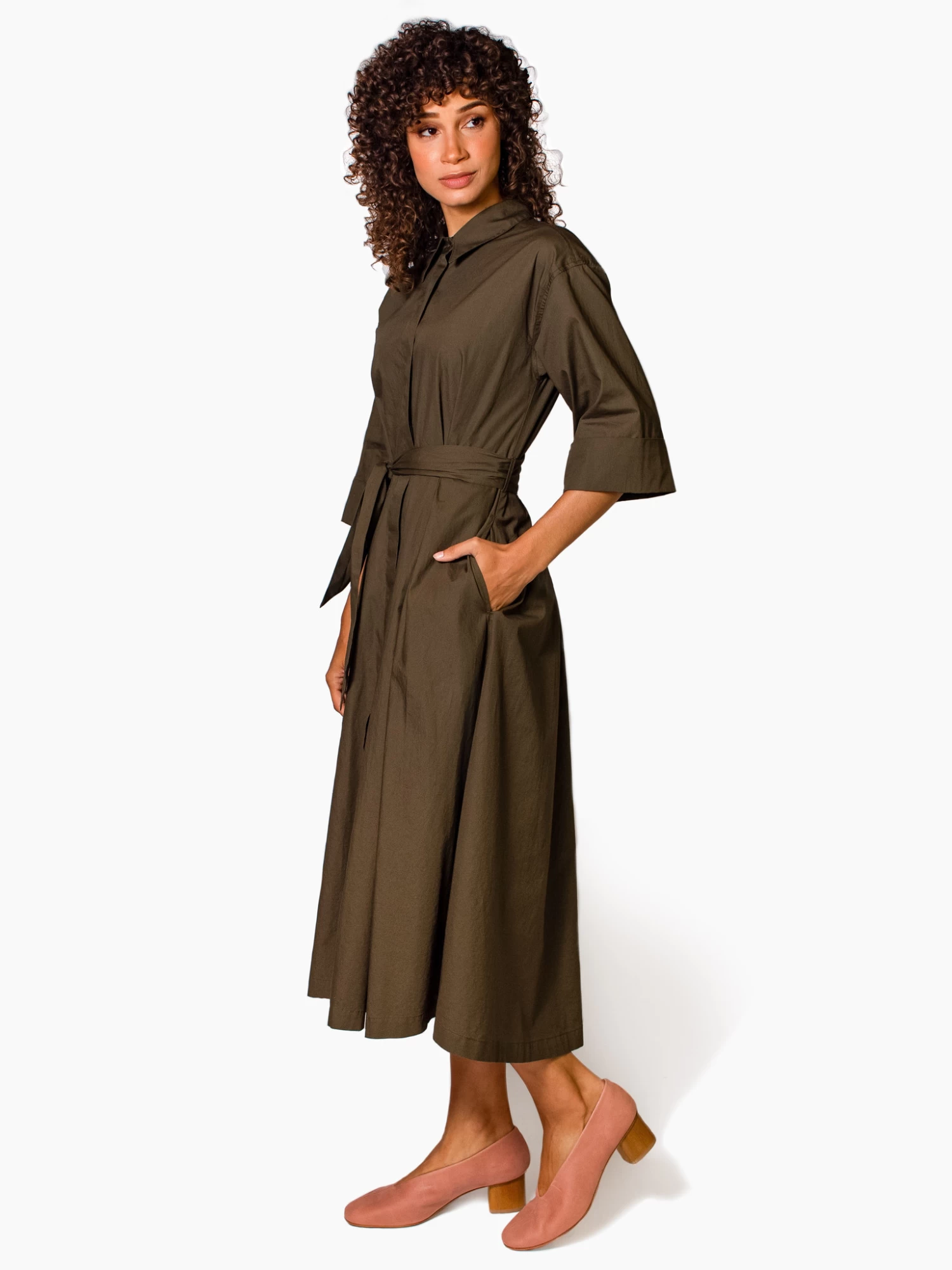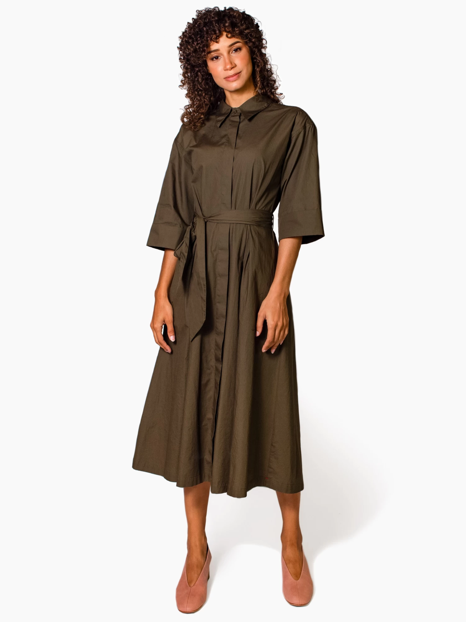 Stunning button down dress with an adjustable self-tie belt and two pockets.