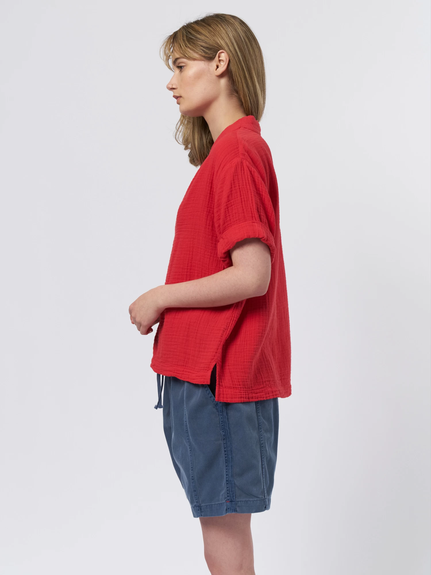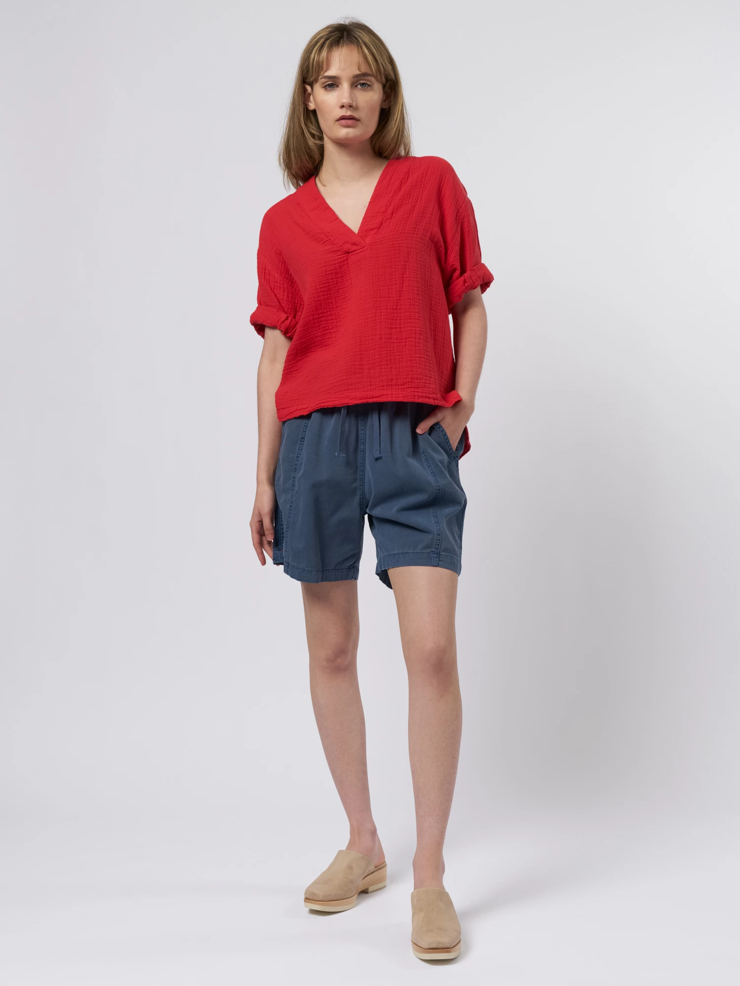 The oversized top in Chelsea gauze top has a deep V-neck and rolled sleeves.