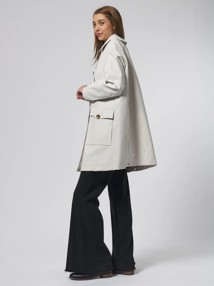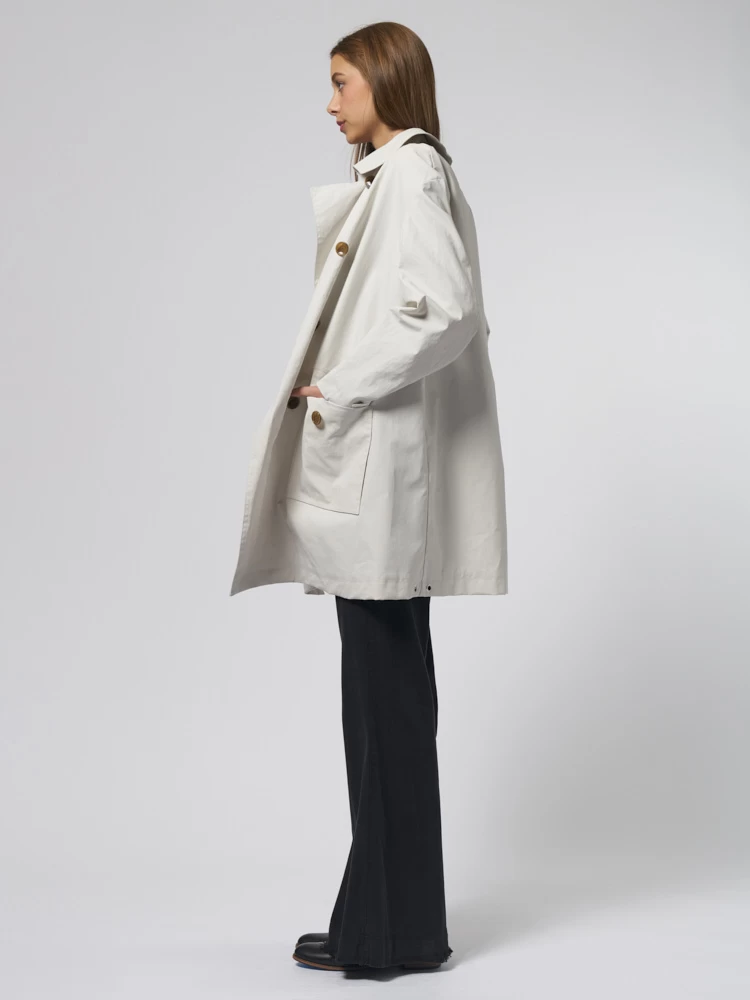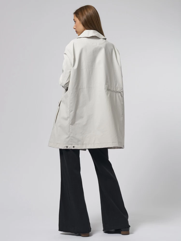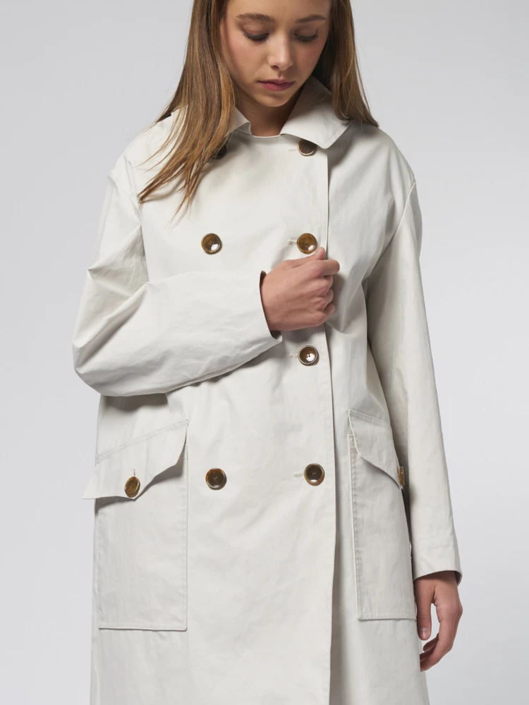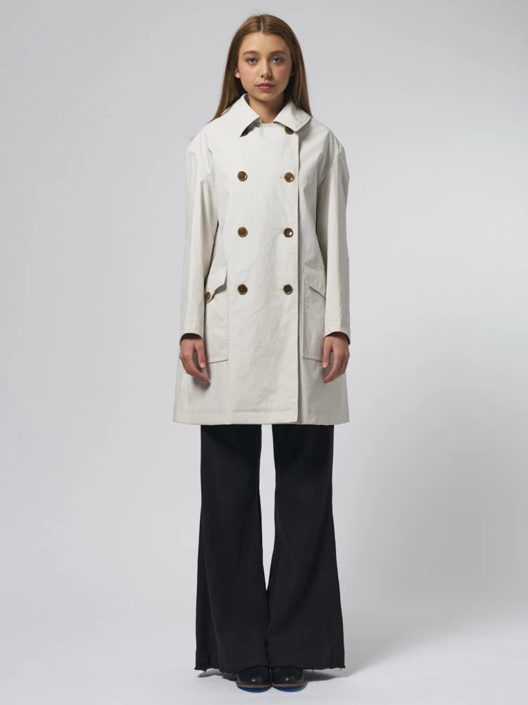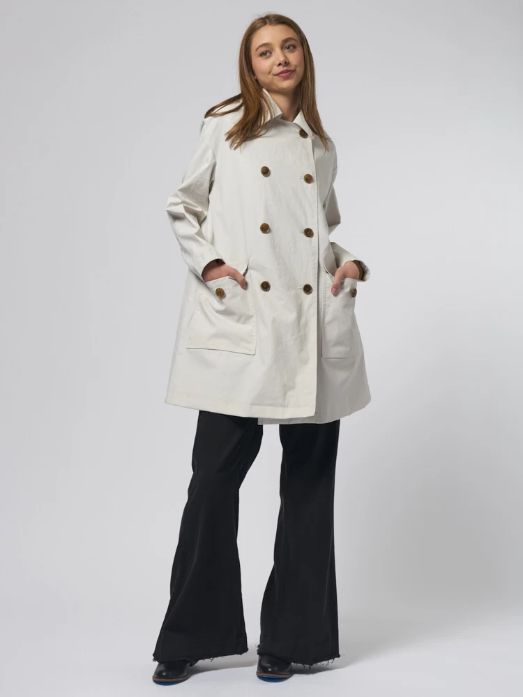 Knee-length double-breasted coat with, two front pockets, and a zippered back pocket.