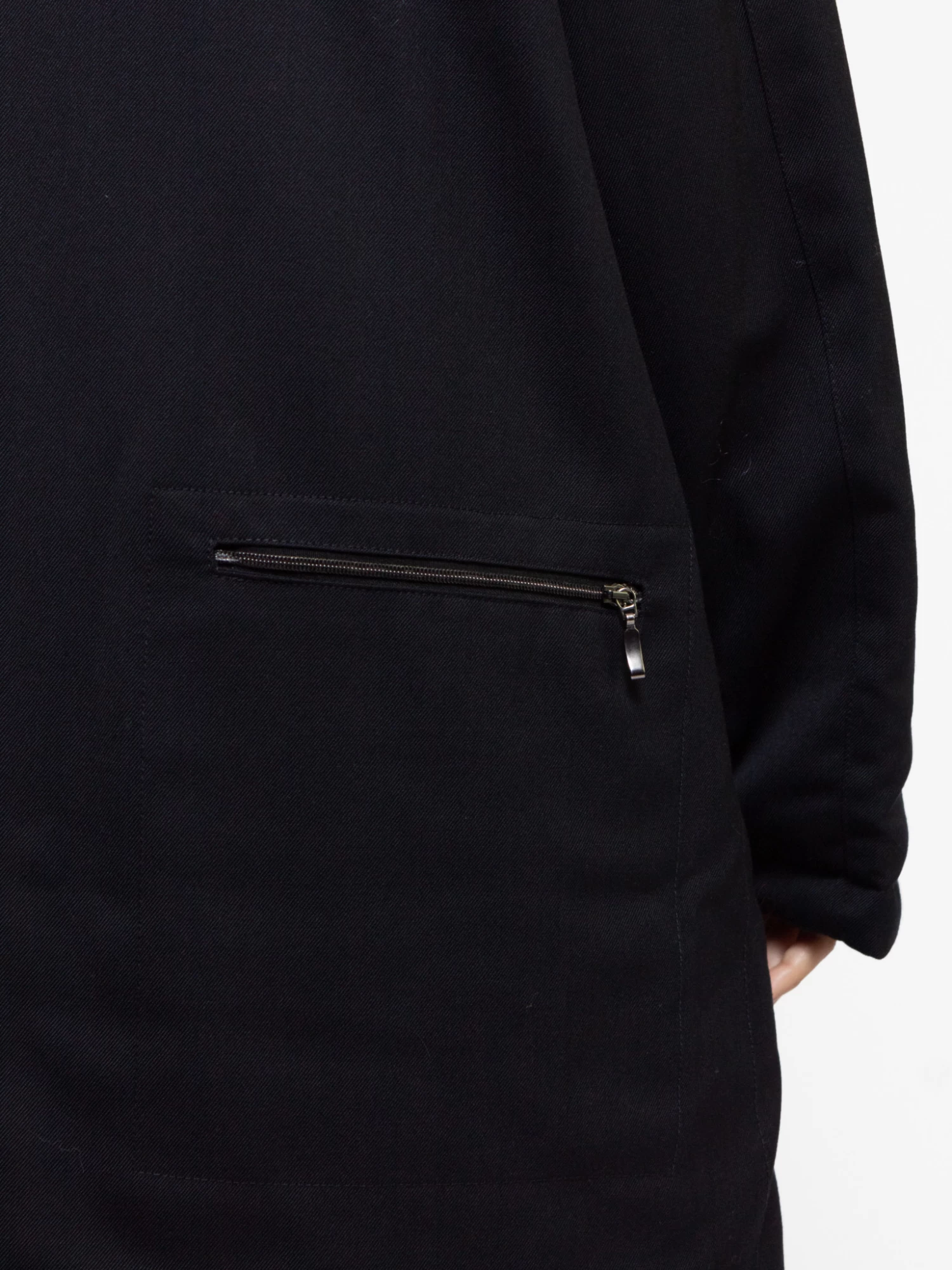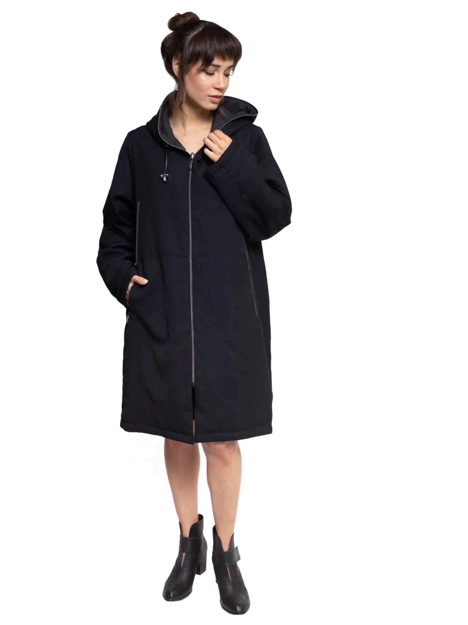 A mid length, reversible rain coat with a zipper front, padded lining, hood, front pockets, and a zippered back pocket.