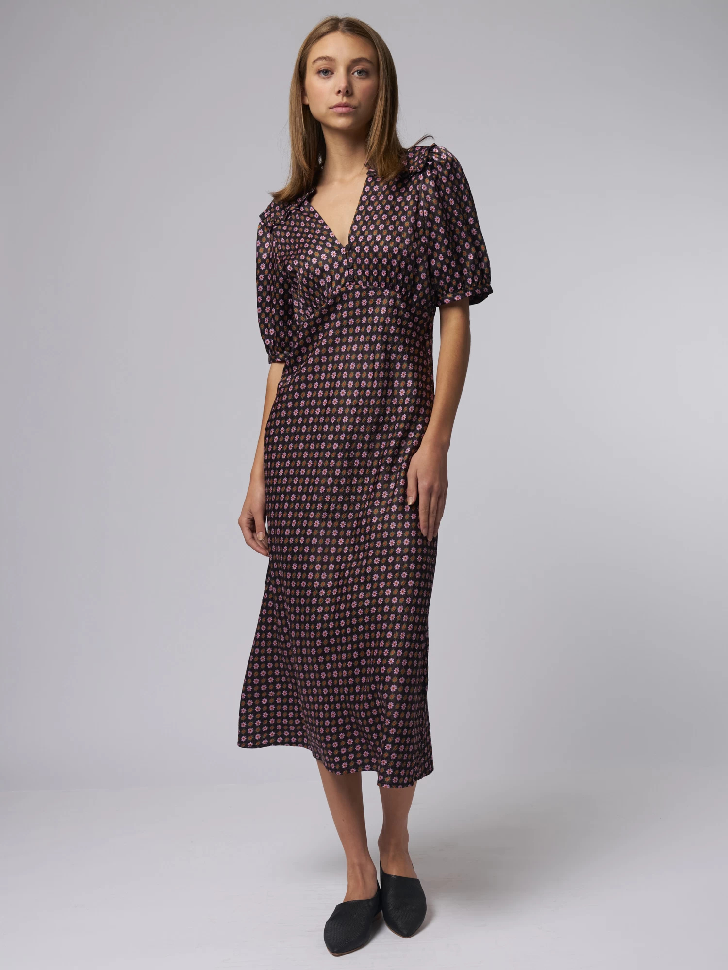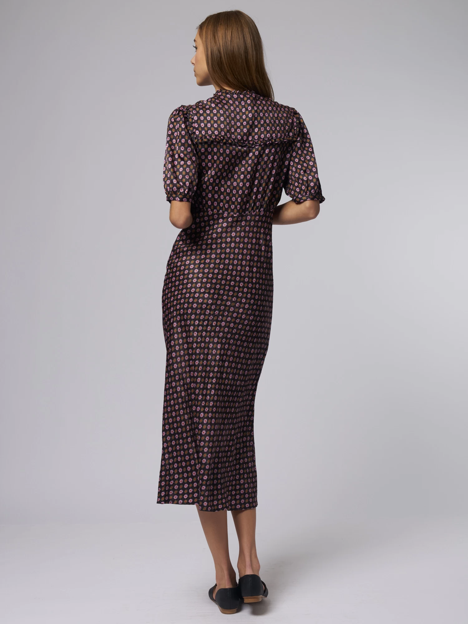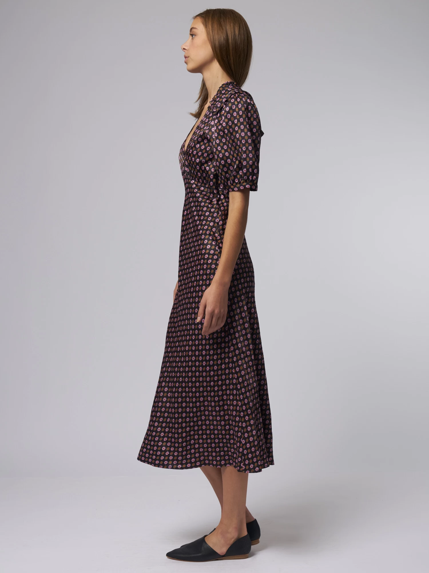 The mid-length bias-cut dress has a deep V-neck and puff sleeves with ruffle detail