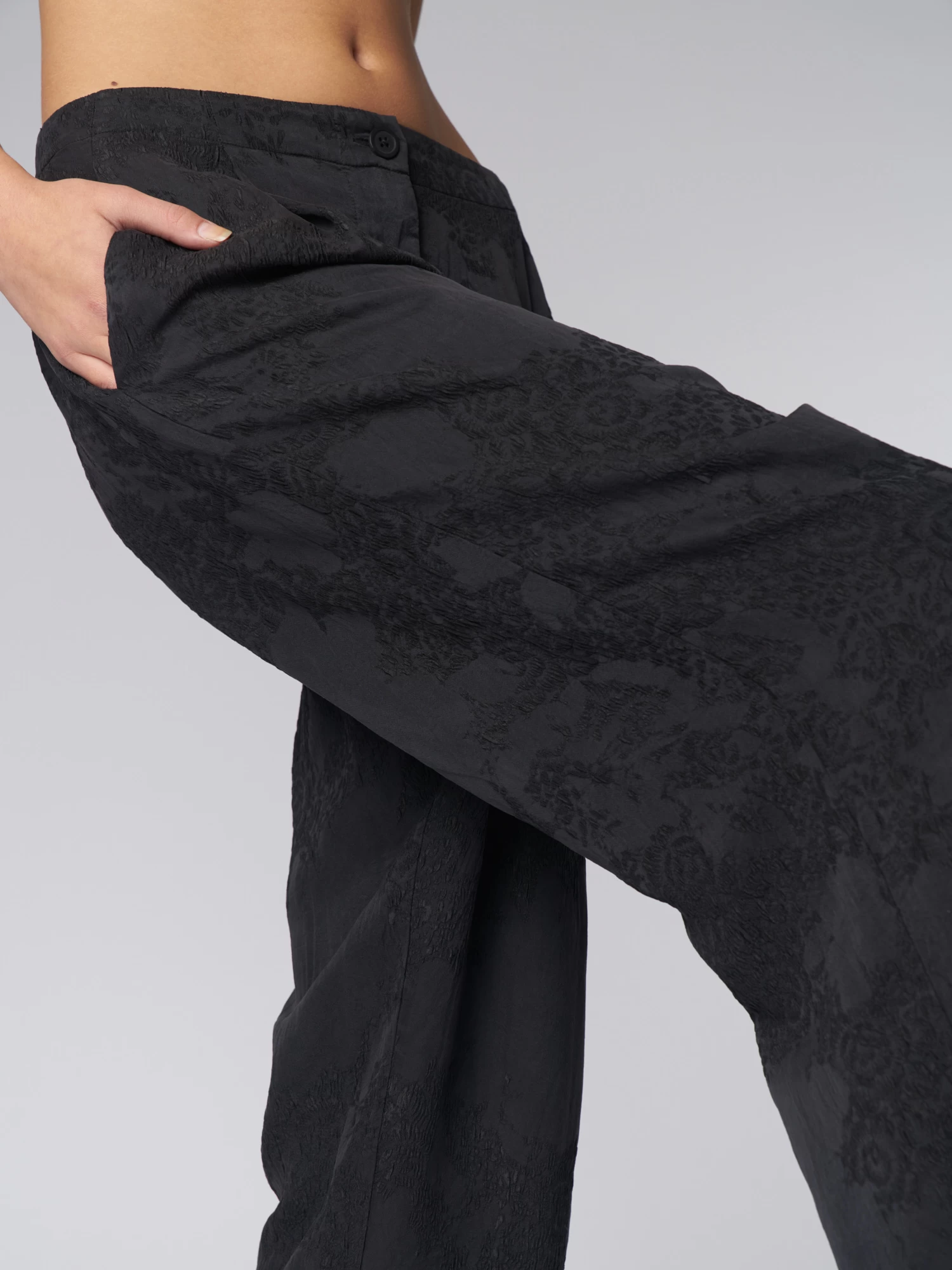 Very comfortable pant in solid floral jacquard has straight loose legs with side pockets