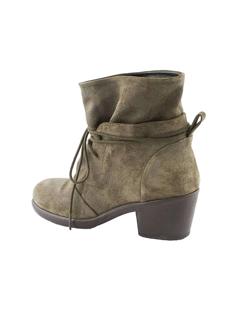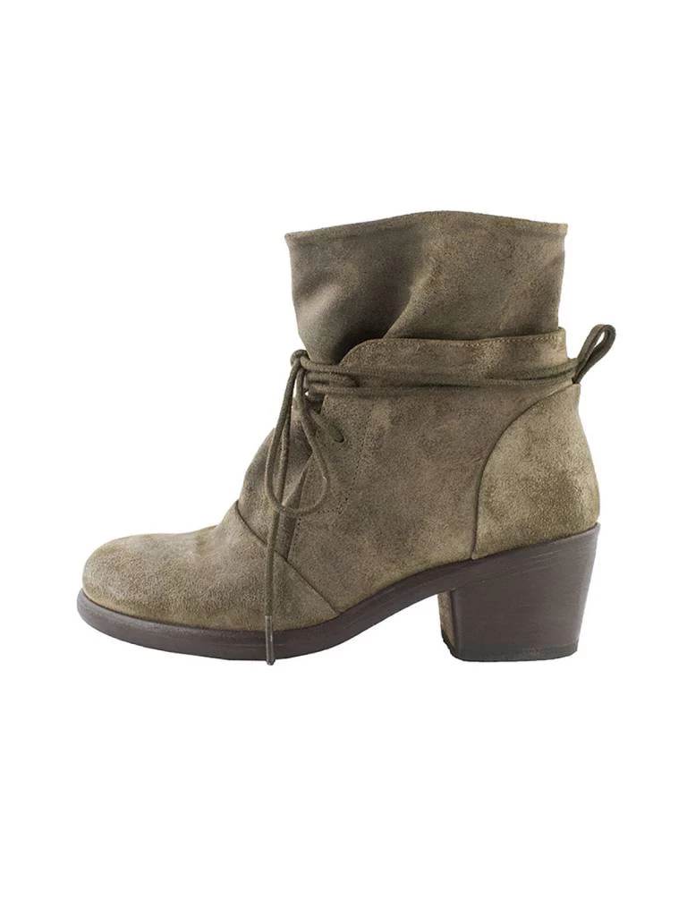 A textured suede ankle bootie with relaxed fit around ankle, multi-wrap tie front closure, and pull tab on back.