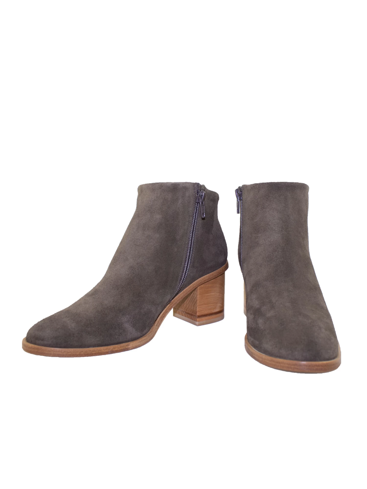 A suede bootie that reaches right below the ankle with a solid wood base, and is fully lined with soft shearling.