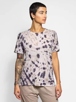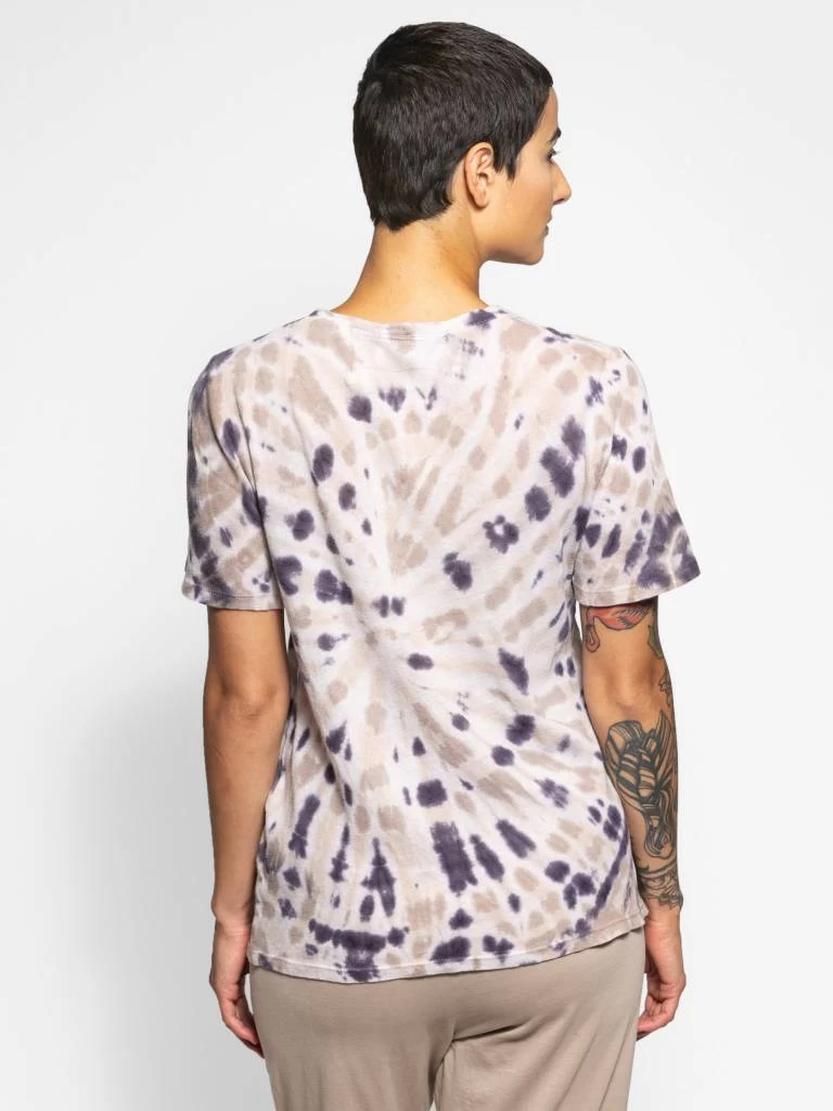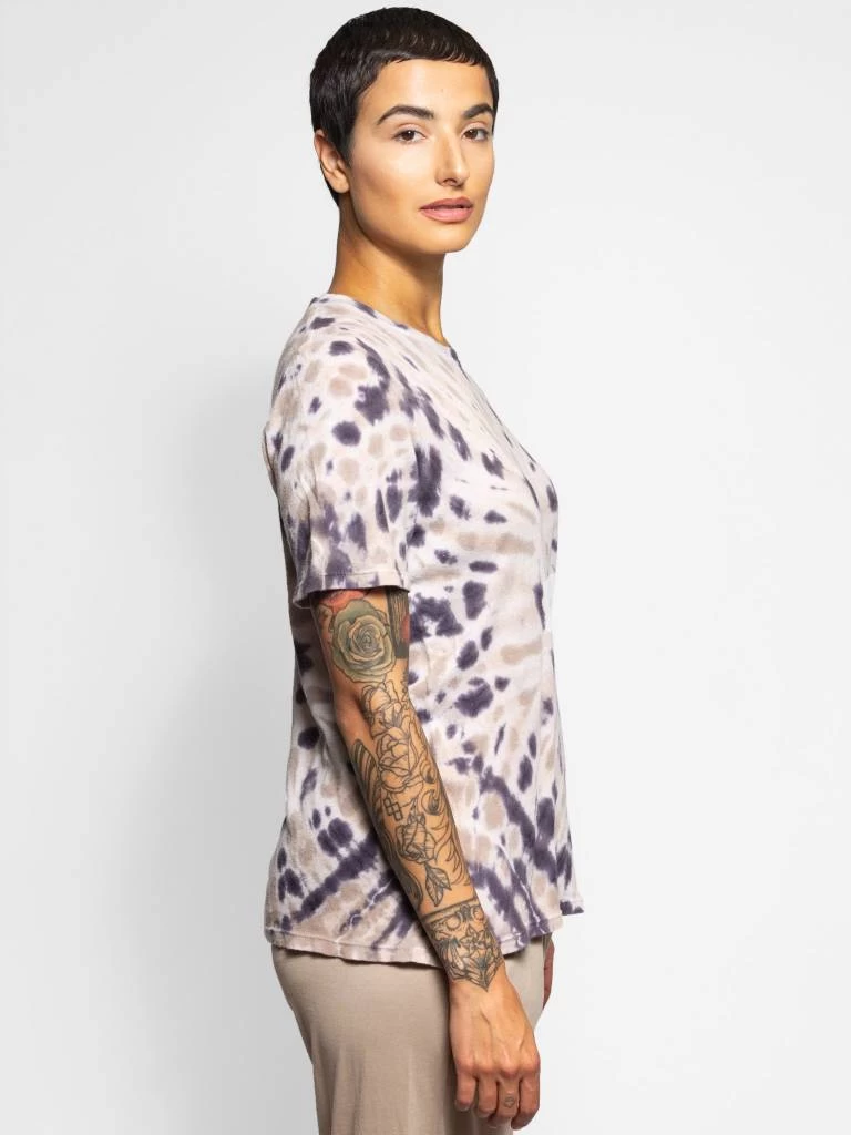 A short sleeve, crew neck jersey tee featuring a hand dyed sand dollar tie dye design.