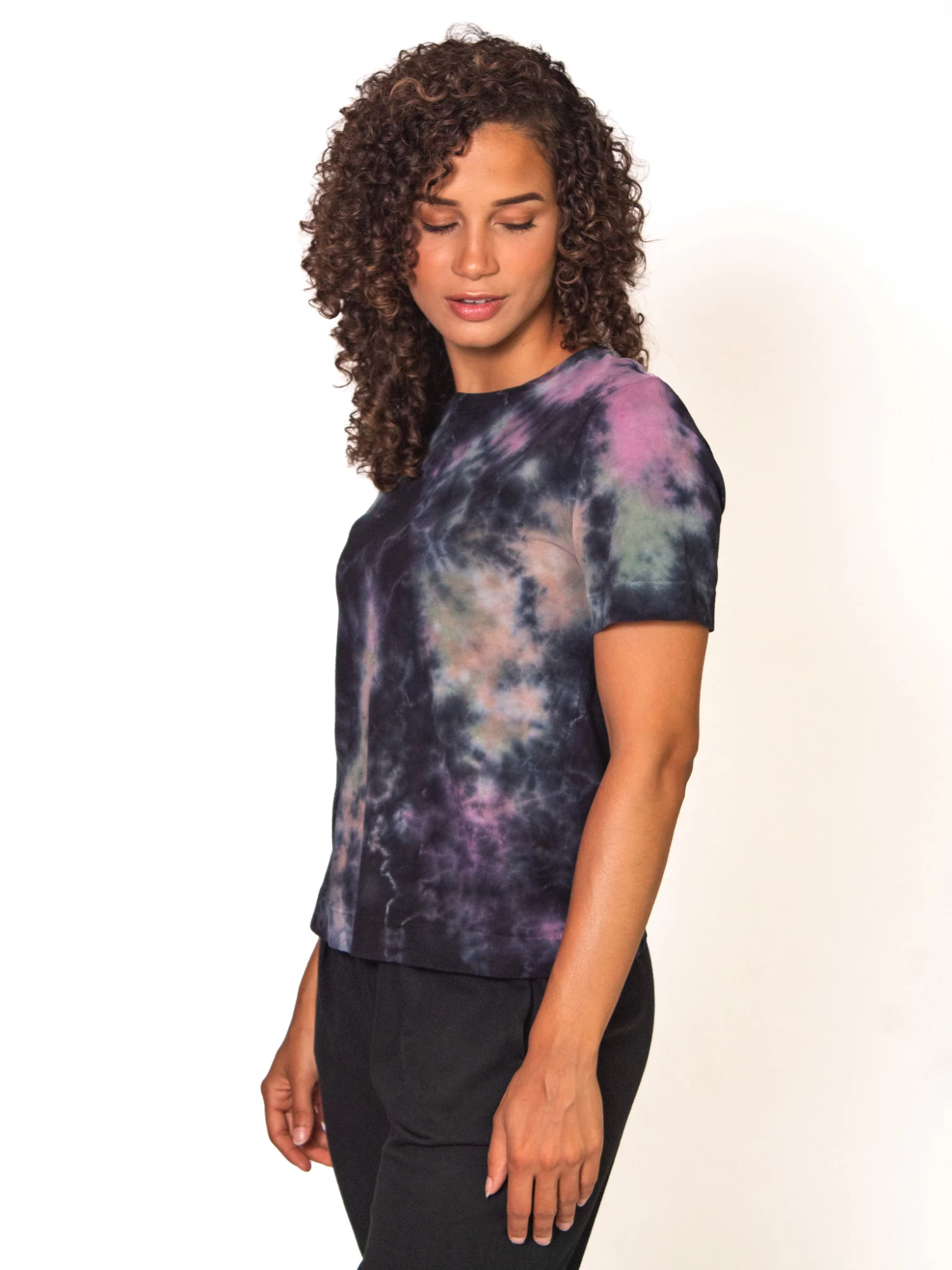 Classic jersey boy tee in a hand-dyed nebula tie-dye. Slimmer through the bust and kicks out at the shoulder. It’s casual and comfortable.