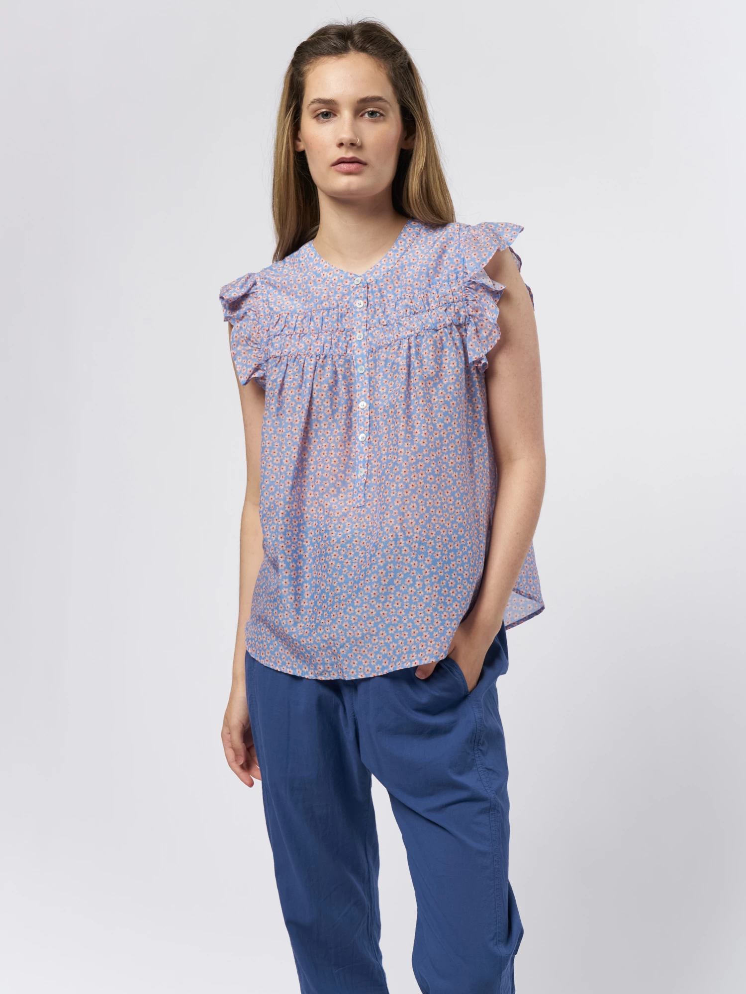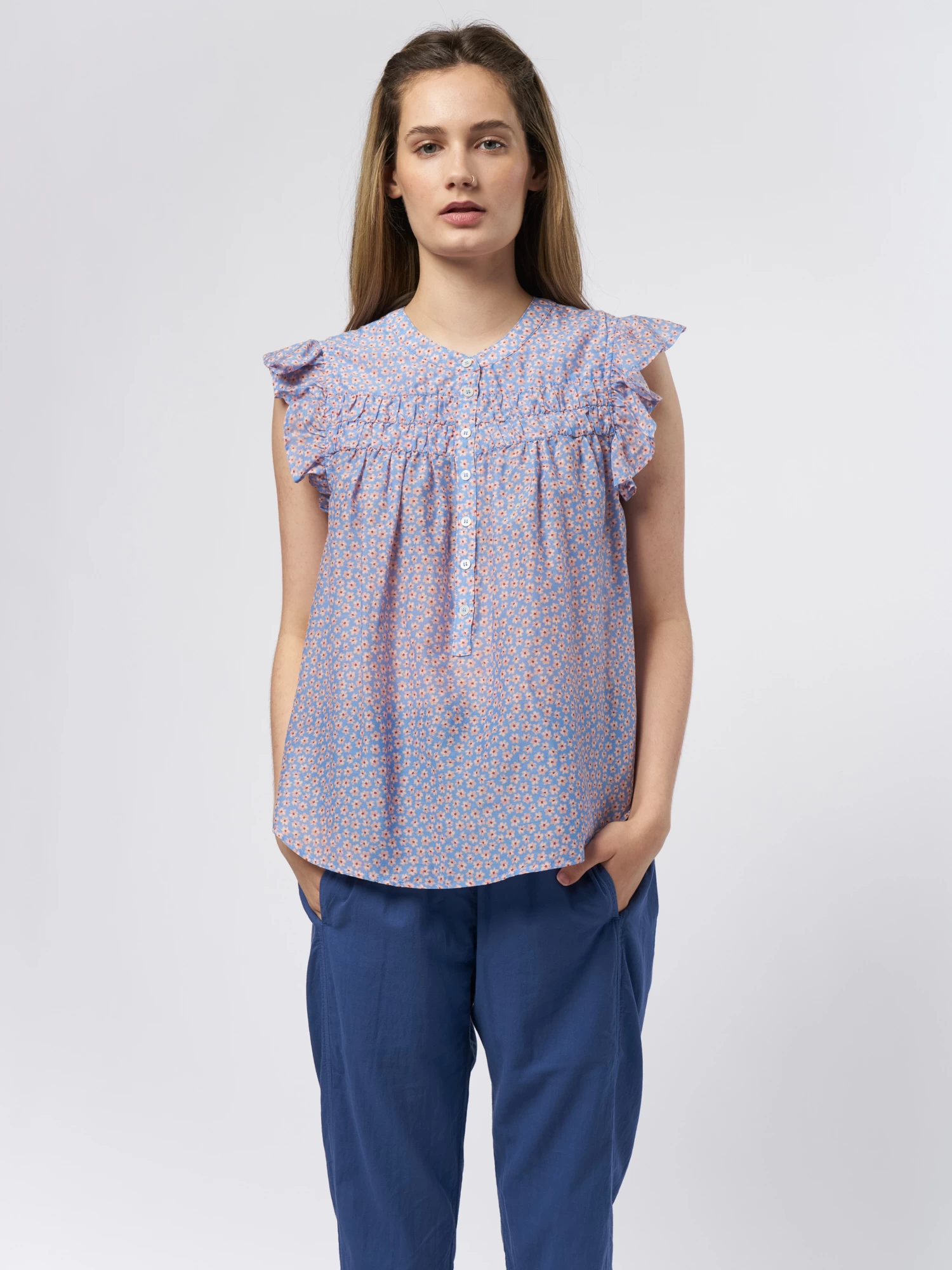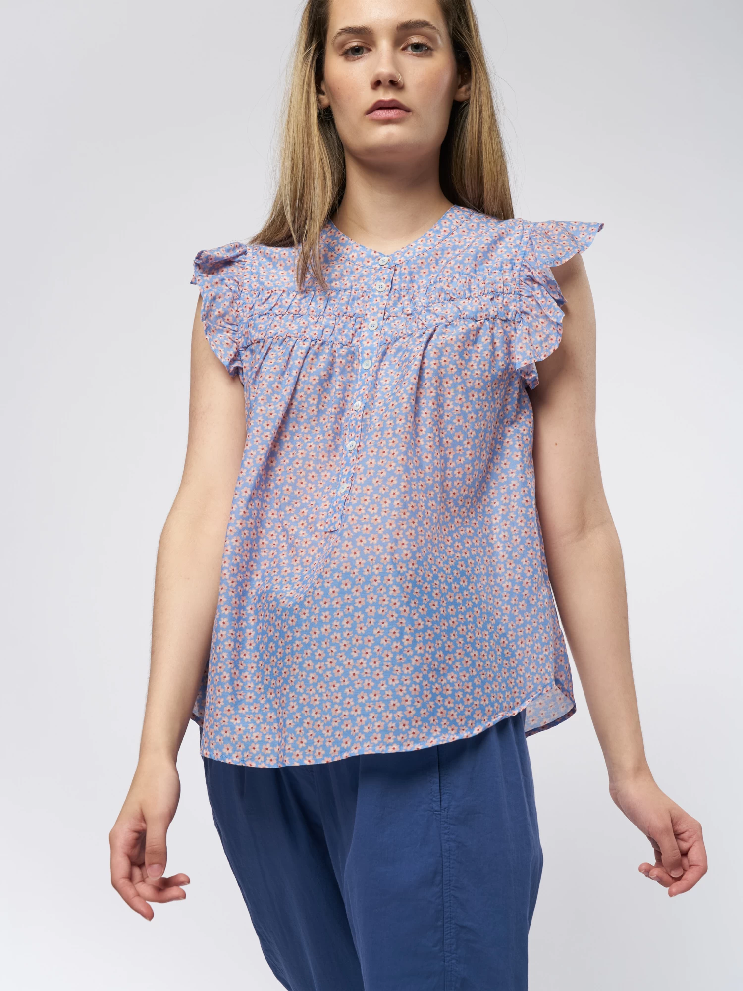 An easy popover in Poppi Cotton Silk Voile with a round neck, button placket, ruffled flutter sleeves, front yoke, and shirttail high low hem.