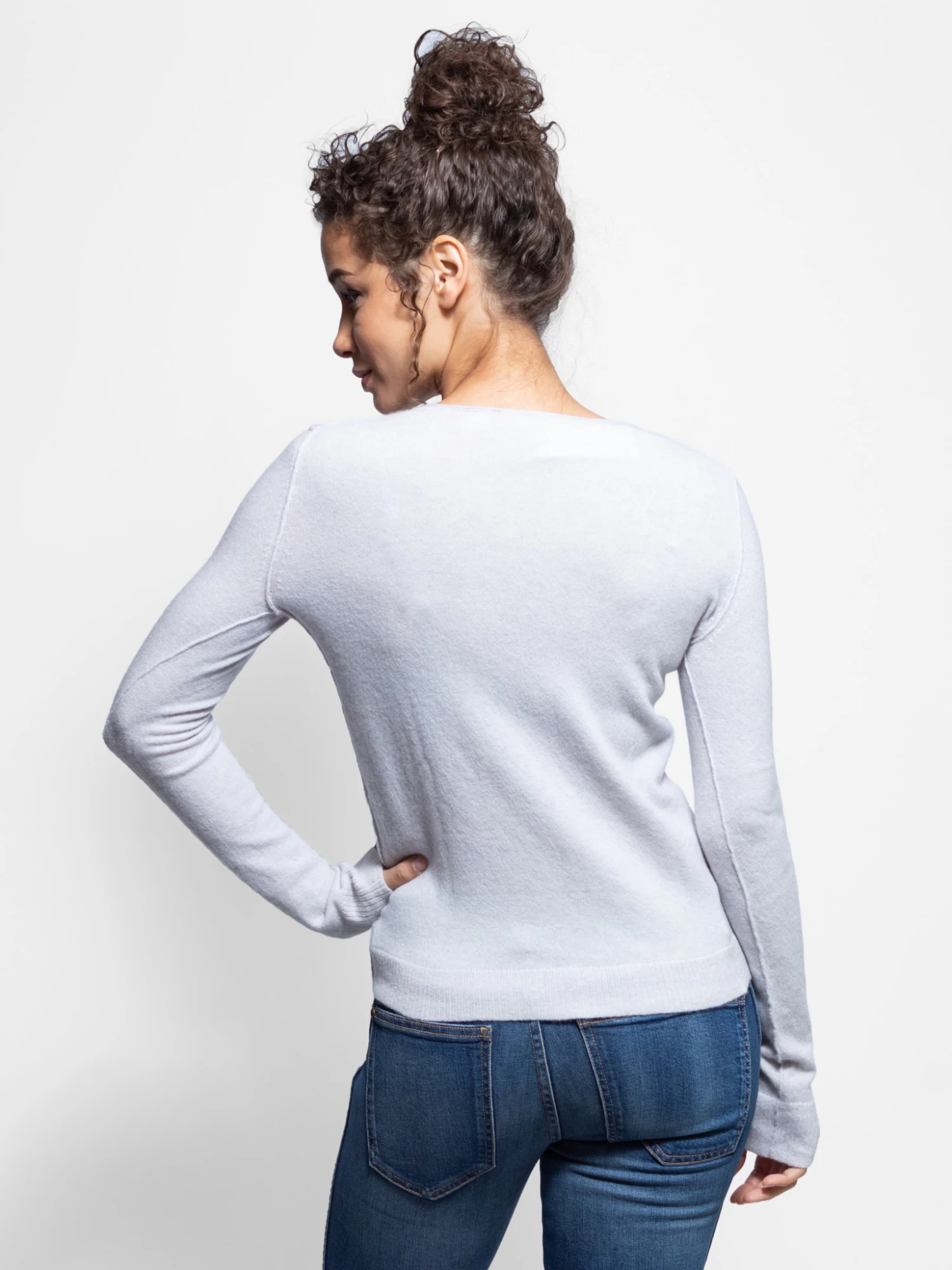 A fitted cashmere blend sweater with button detail at neck and a notch at front hem.