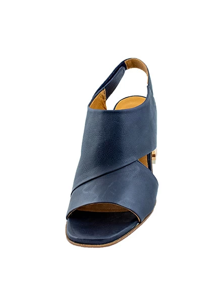 Elegant open-toed bootie with an asymmetric folded seam and keyhole opening with solid wood block-heel with tonal inlay.