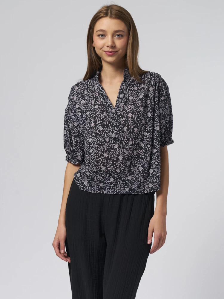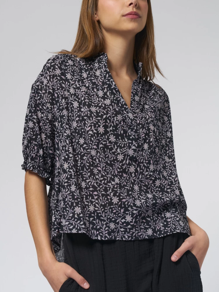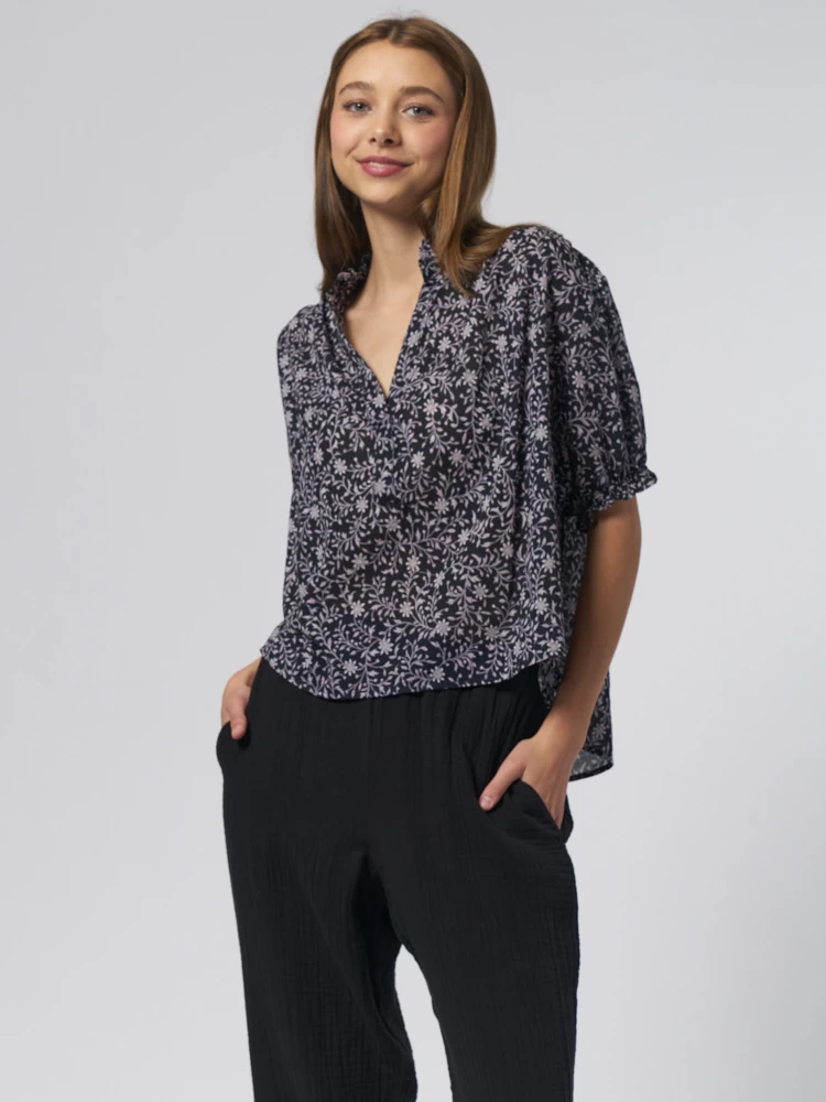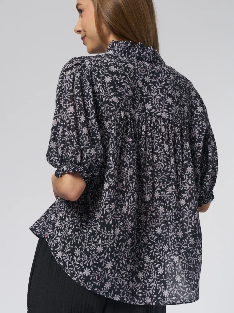 An easy popover top with ruffled V-neck and sleeve cuffs, back pleats, and a high-low shirttail hem.