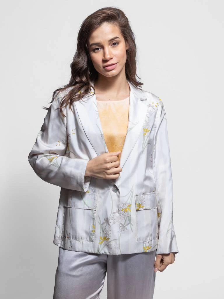 Lined, floral stripe kimono silk, cargo blazer with a single breasted button closure and two front patch pockets.