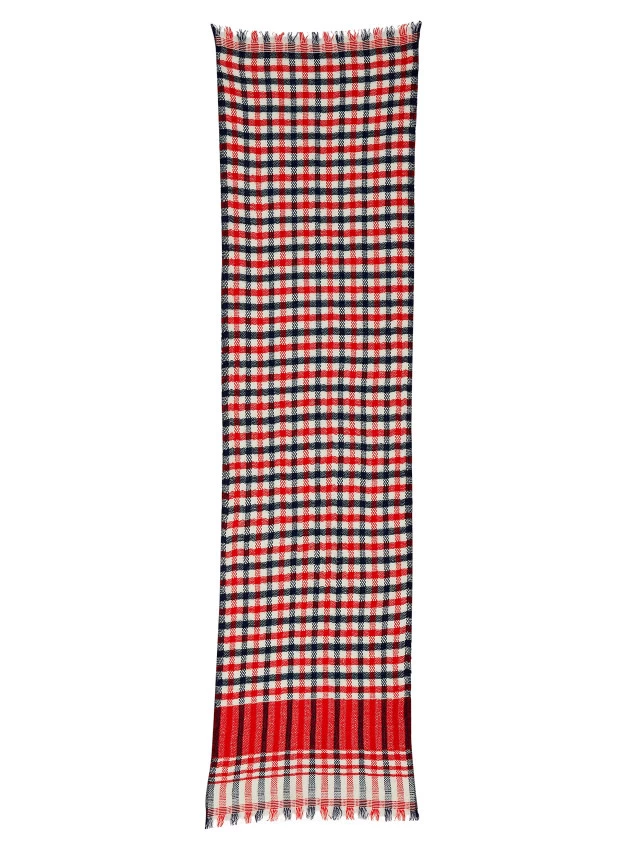 A wool scarf with a plaid, mat weave and fringed edges in red, white, and blue.
