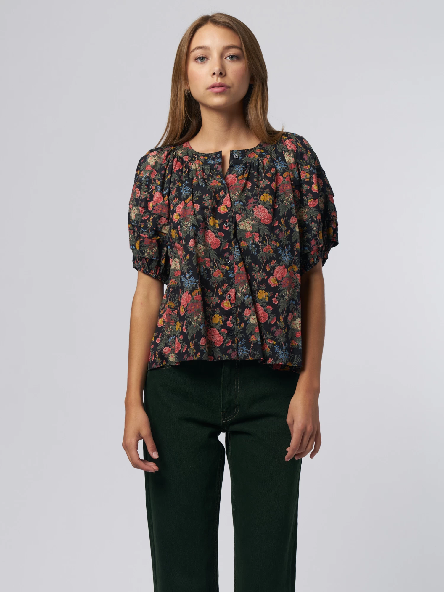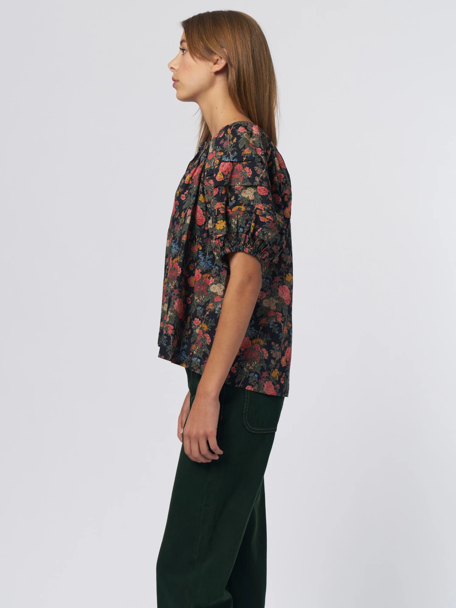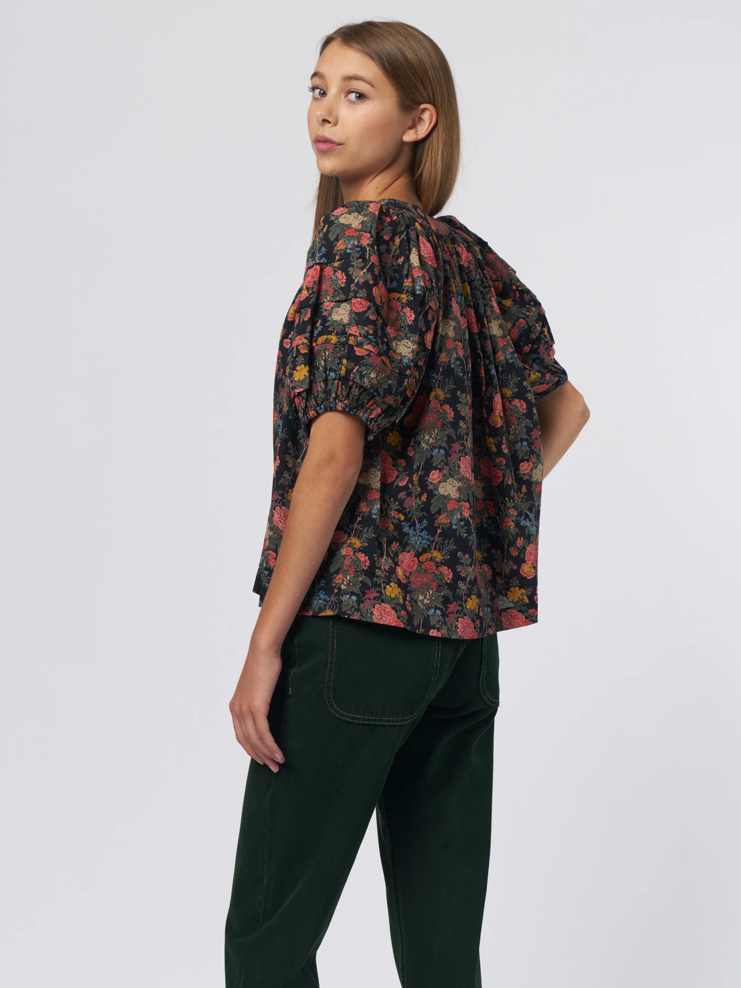 It has tiered elbow-length sleeves that are finished with elastic for an exaggerated silhouette, and delicate pin-tucks add detail to the bodice.