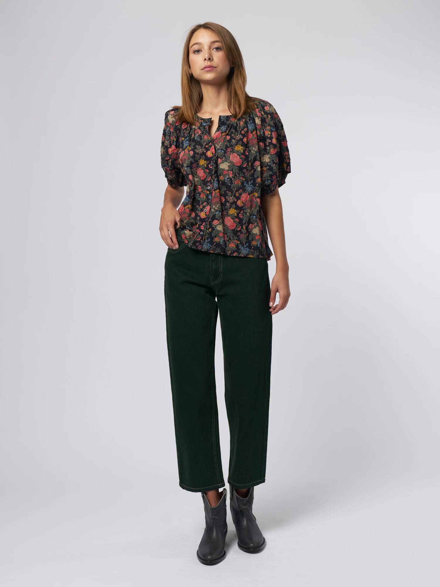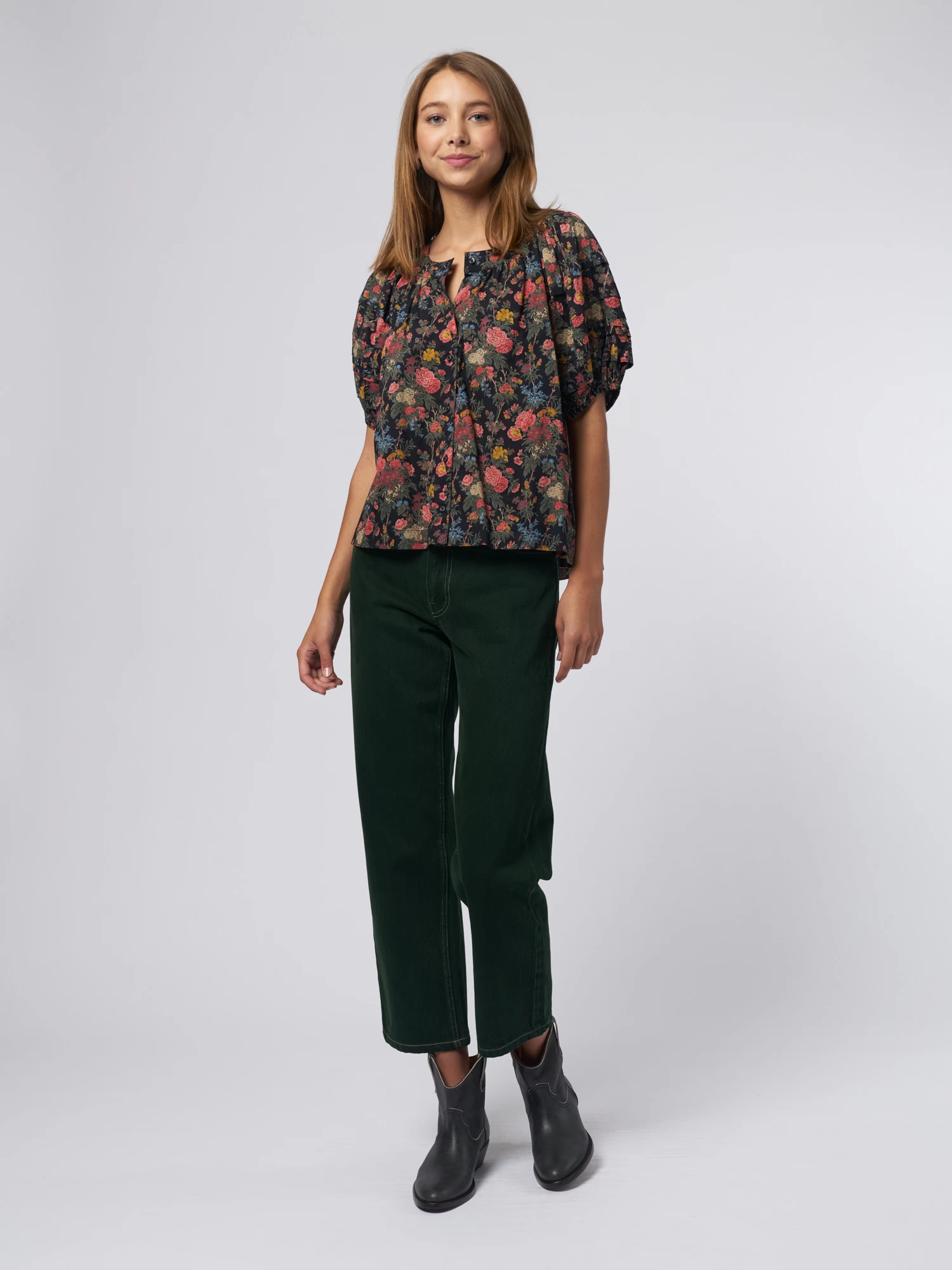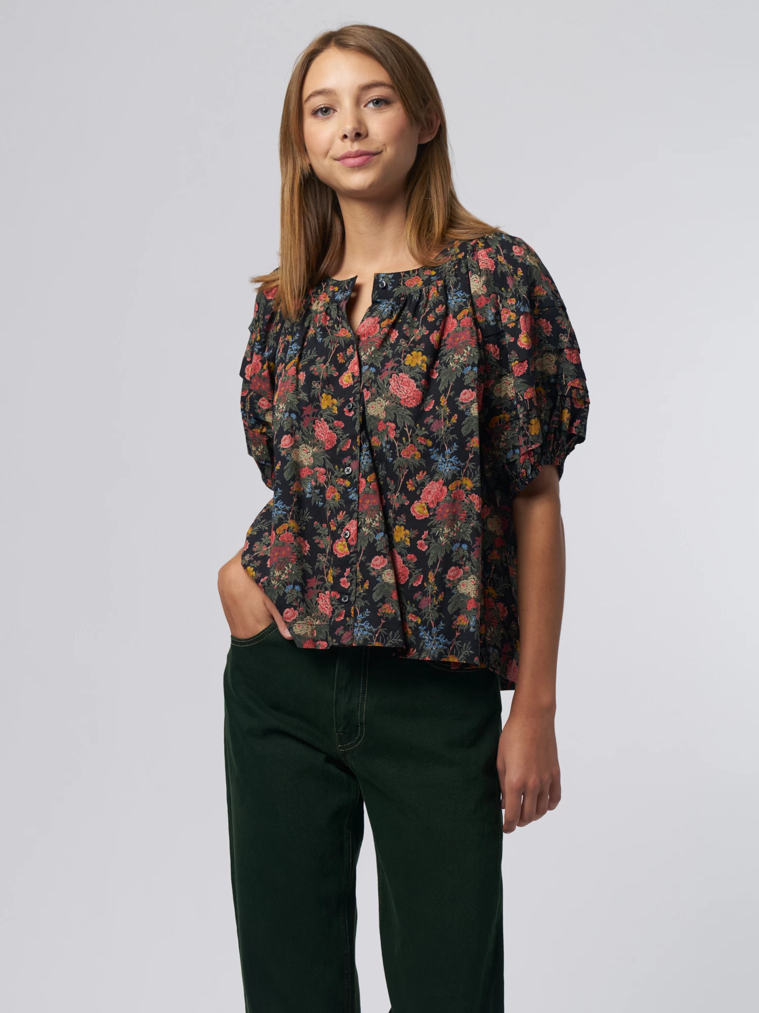 It has tiered elbow-length sleeves that are finished with elastic for an exaggerated silhouette, and delicate pin-tucks add detail to the bodice.
