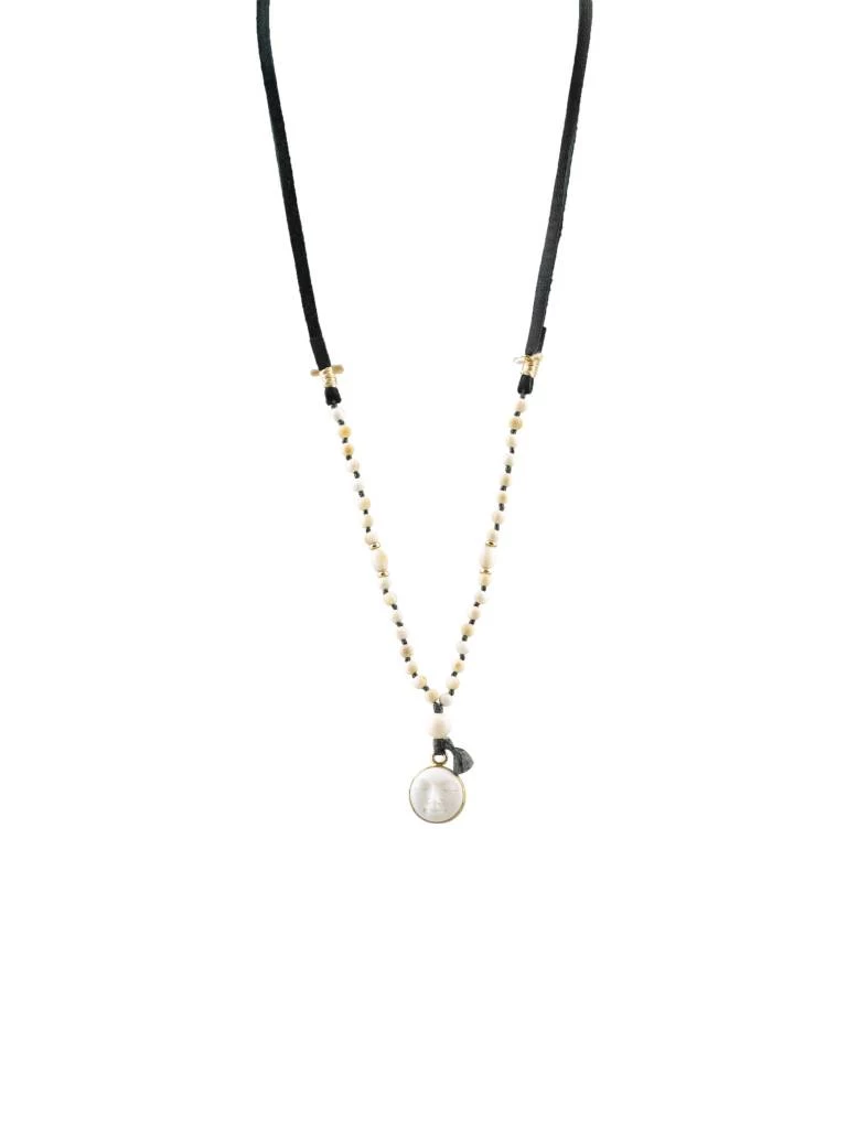 A leather, beaded necklace with a moonface charm and gold bezel.