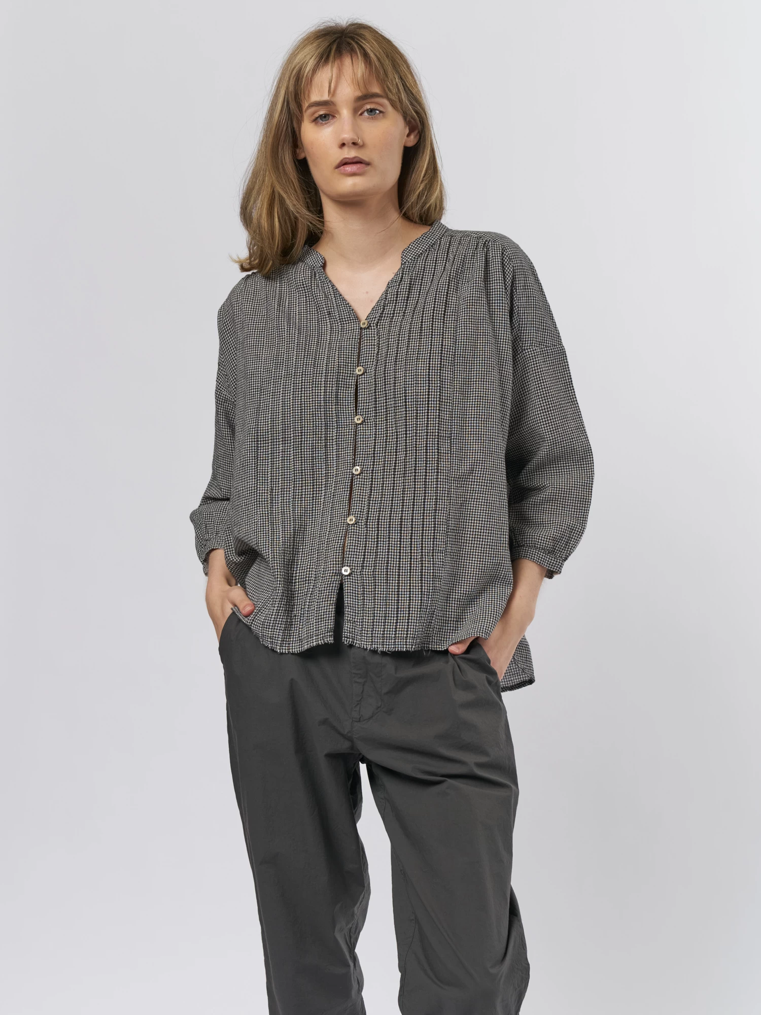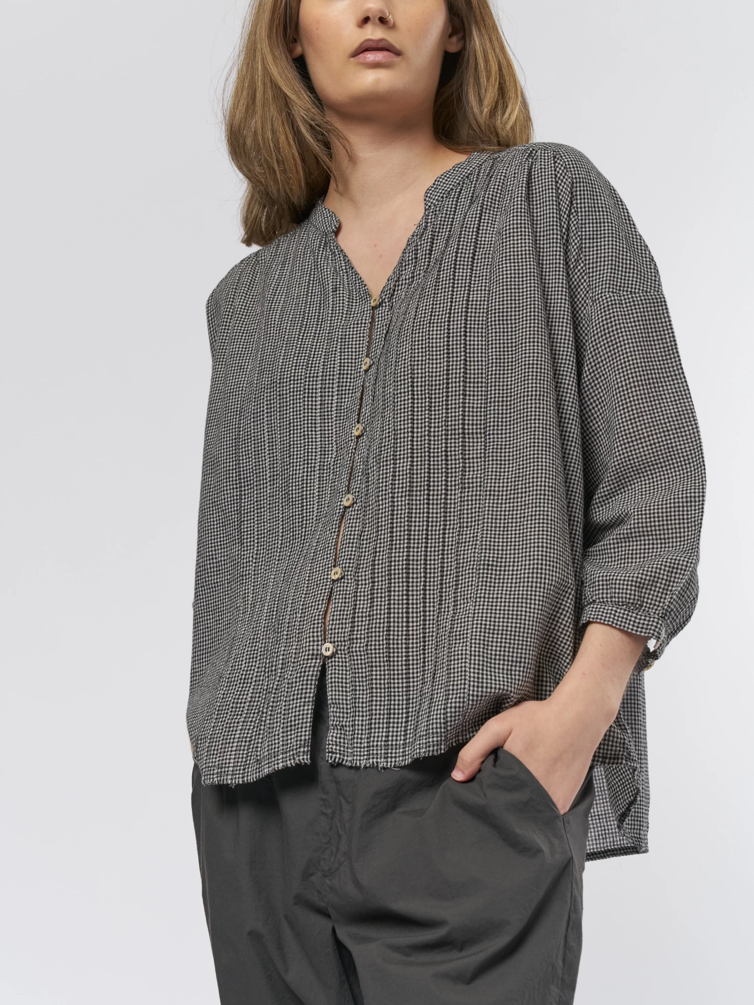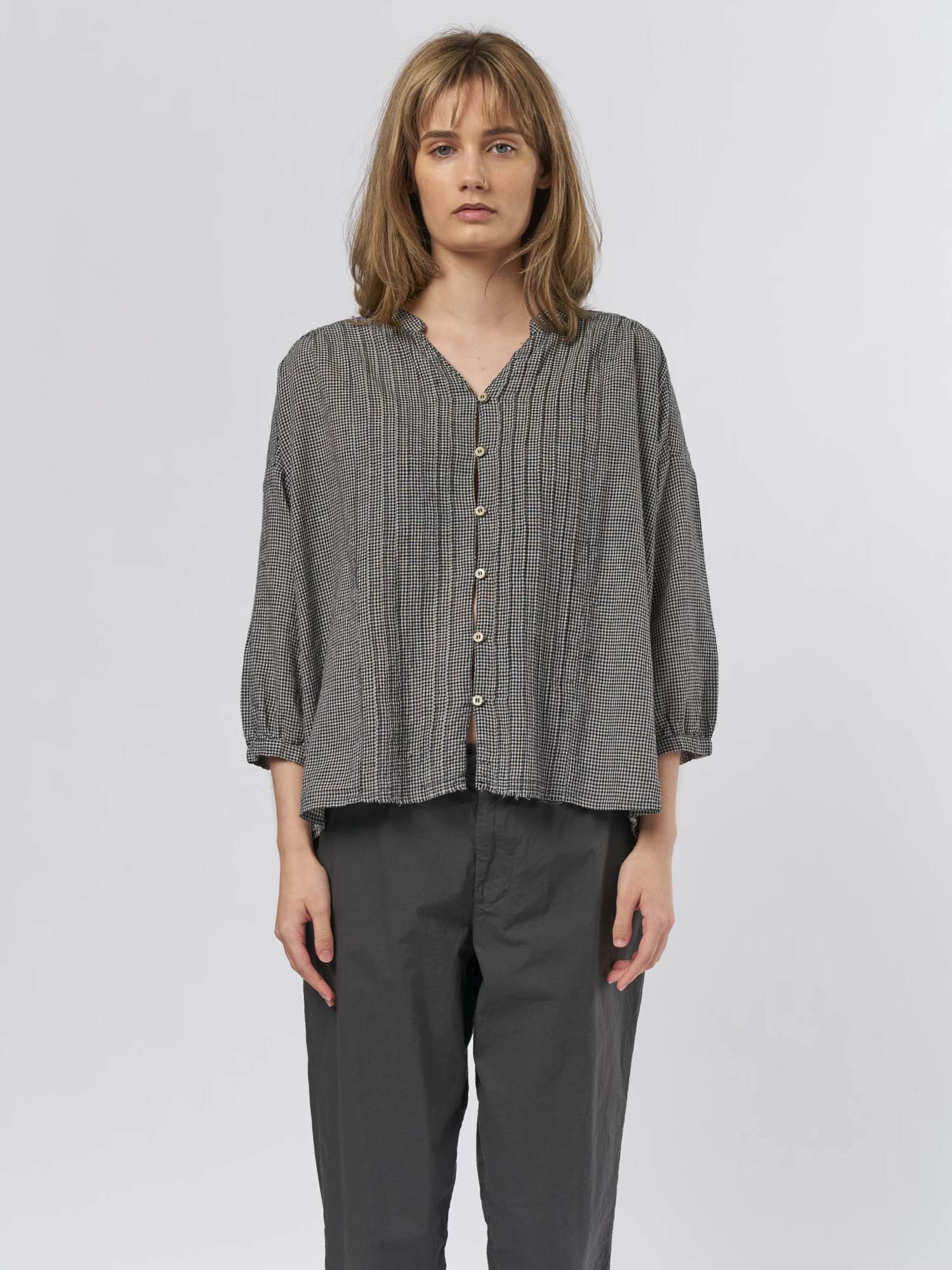 A flat collar cotton shirt with a button front in check.