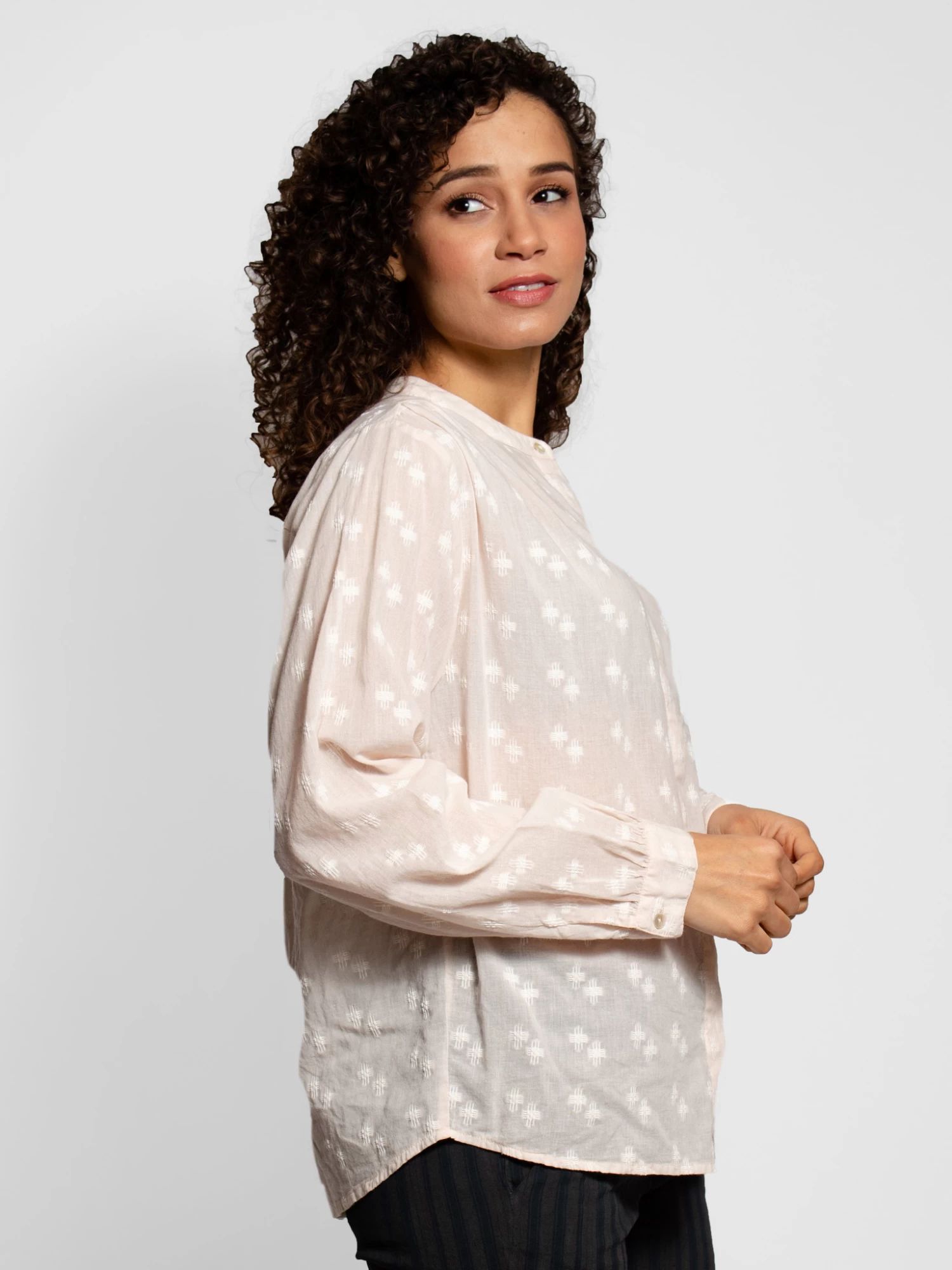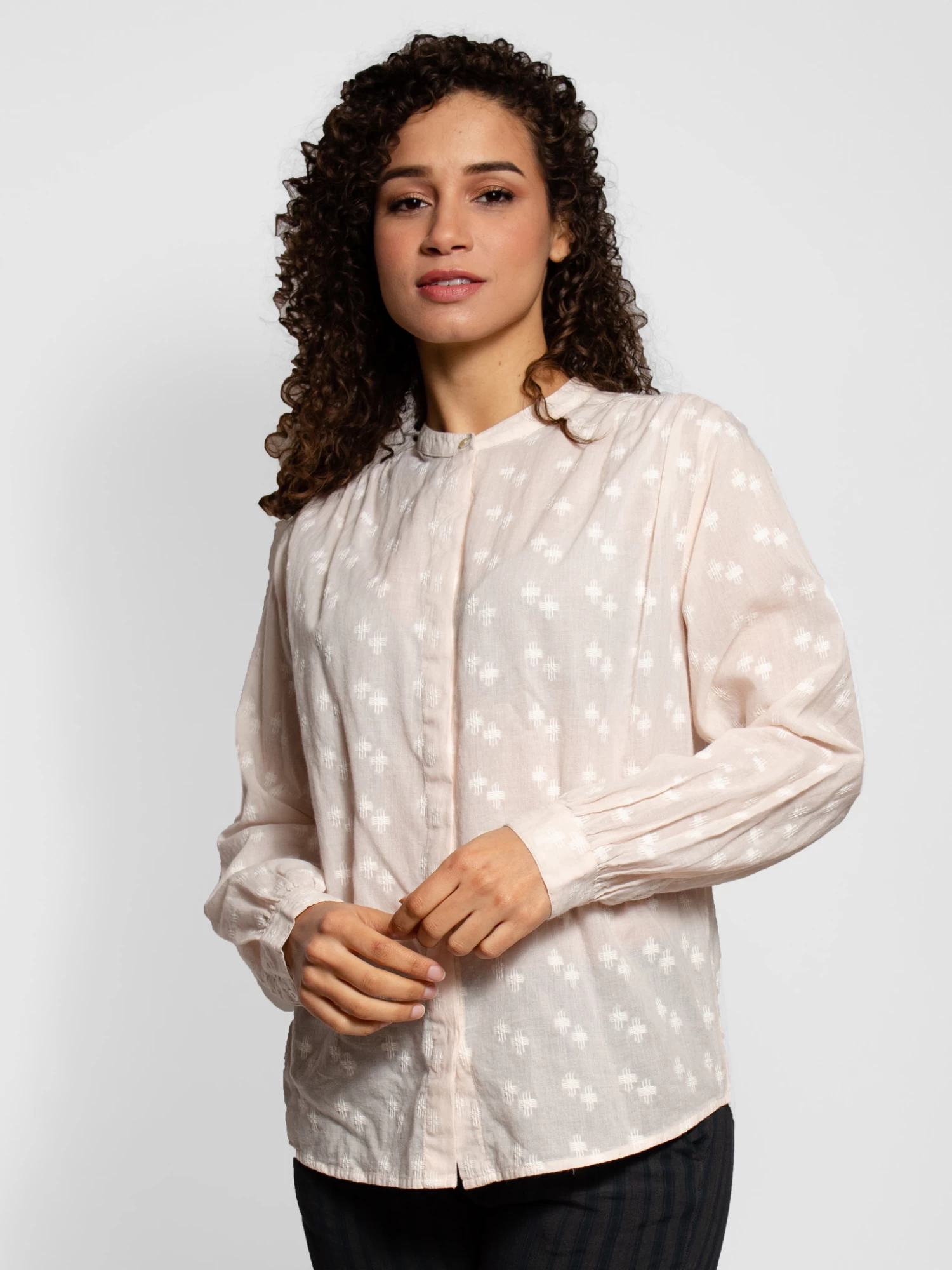 Long sleeve, hidden button down shirt with a covered placket and button cuffs in a geometric jacquard cotton.