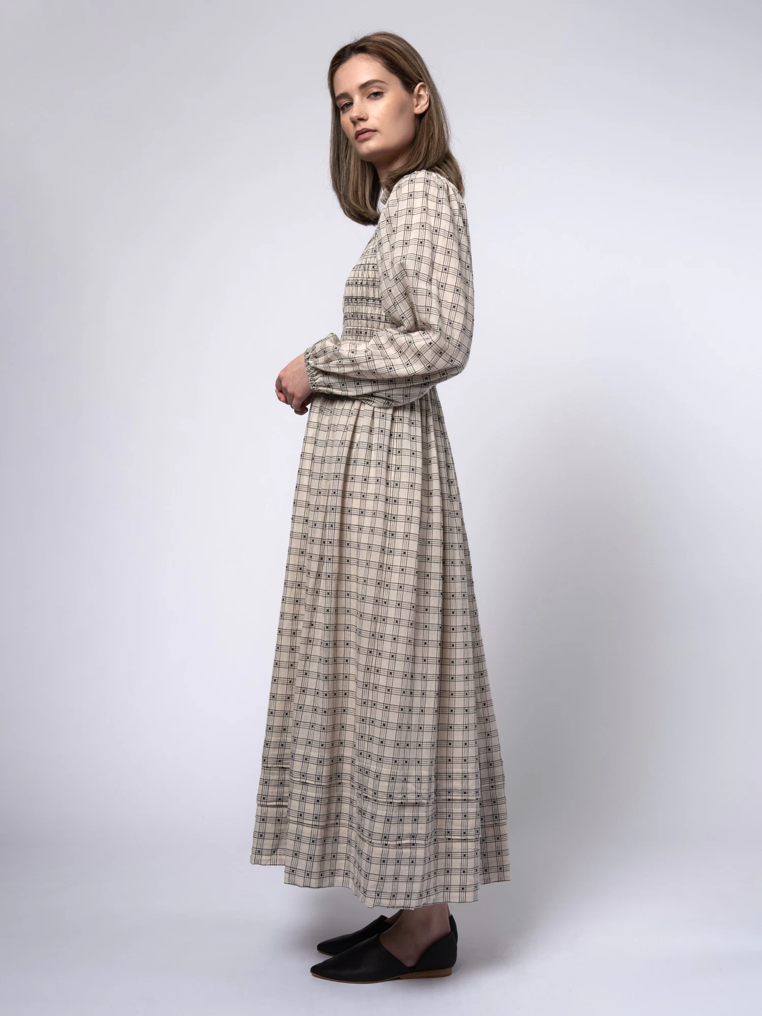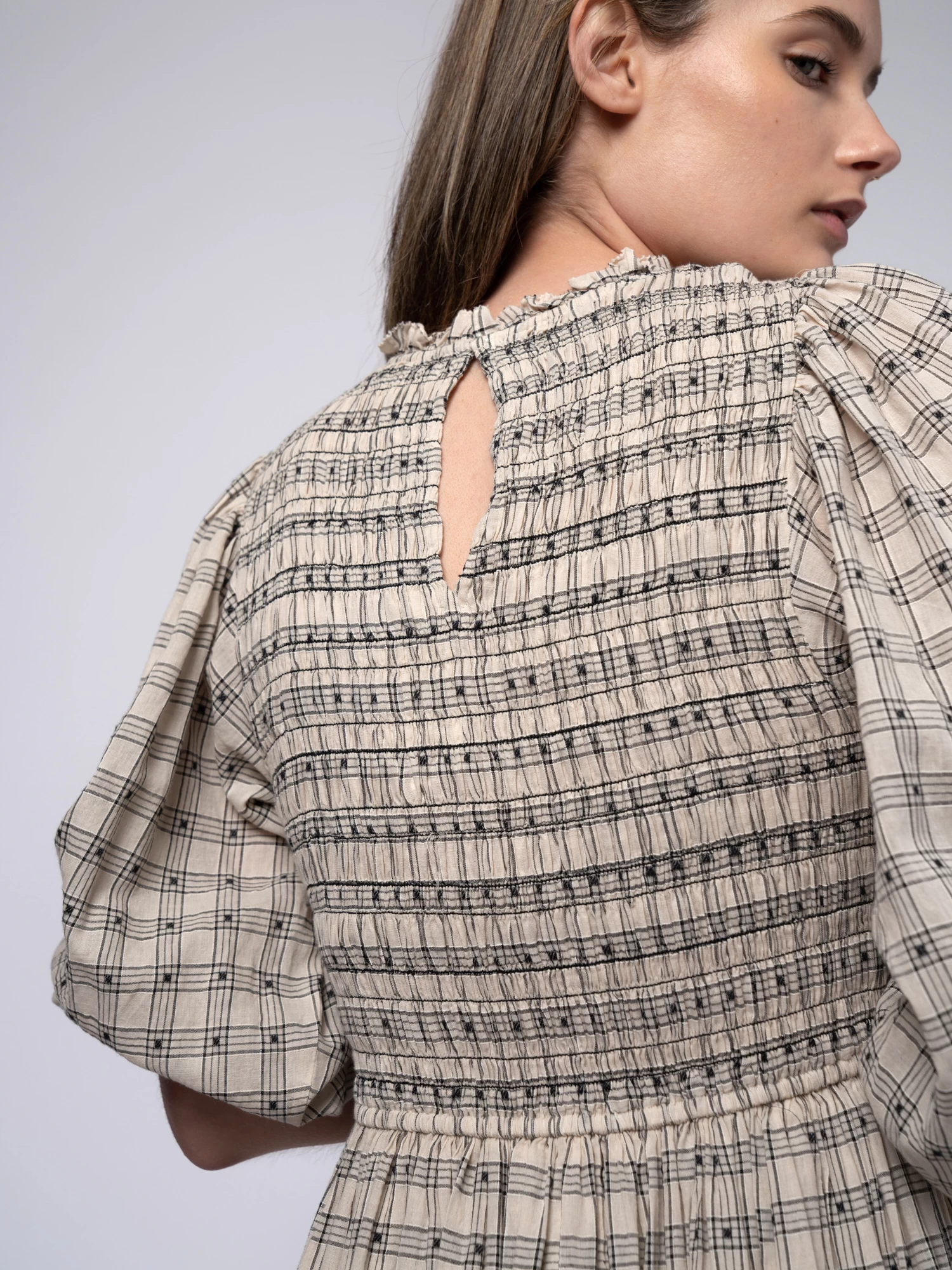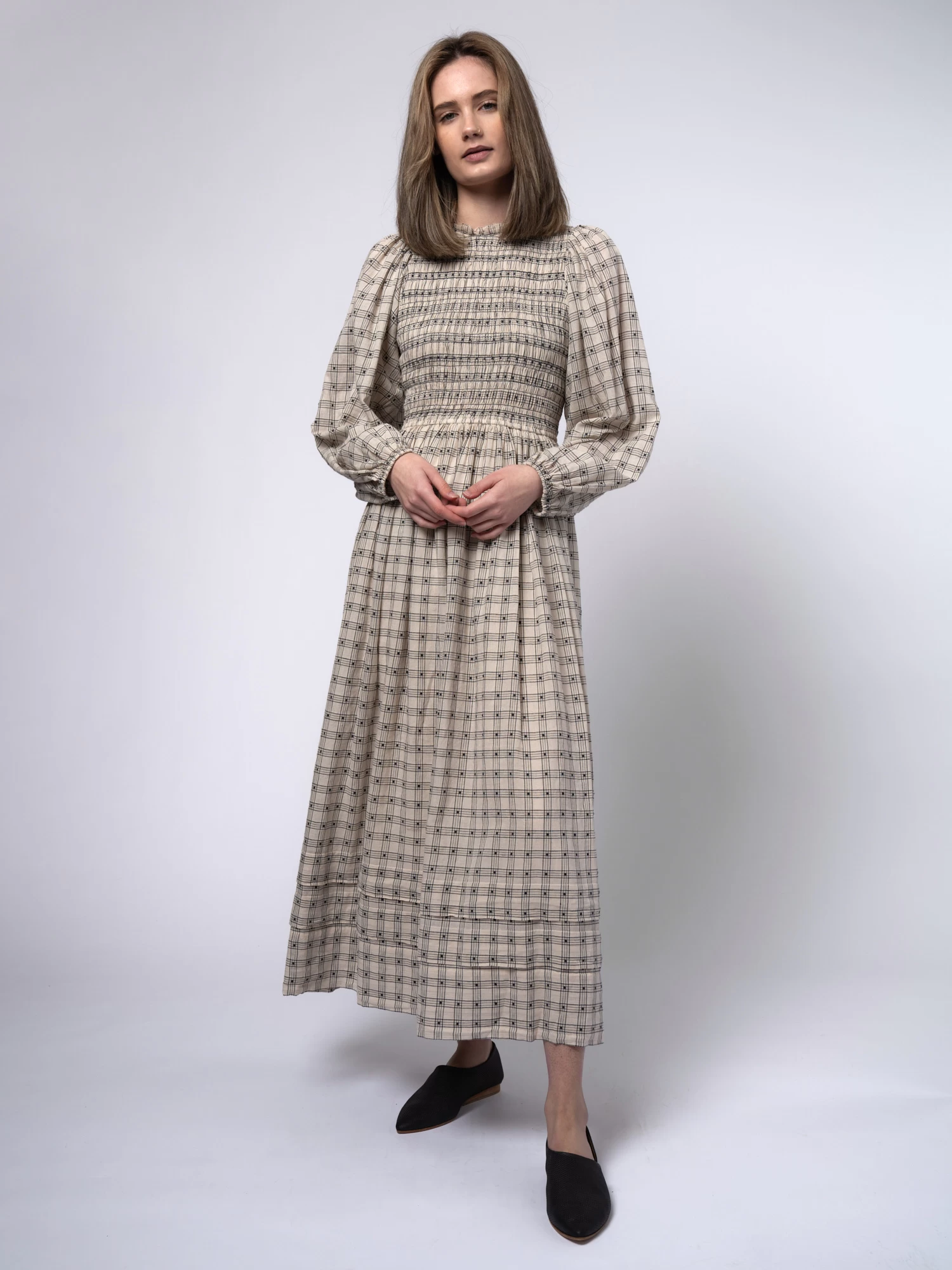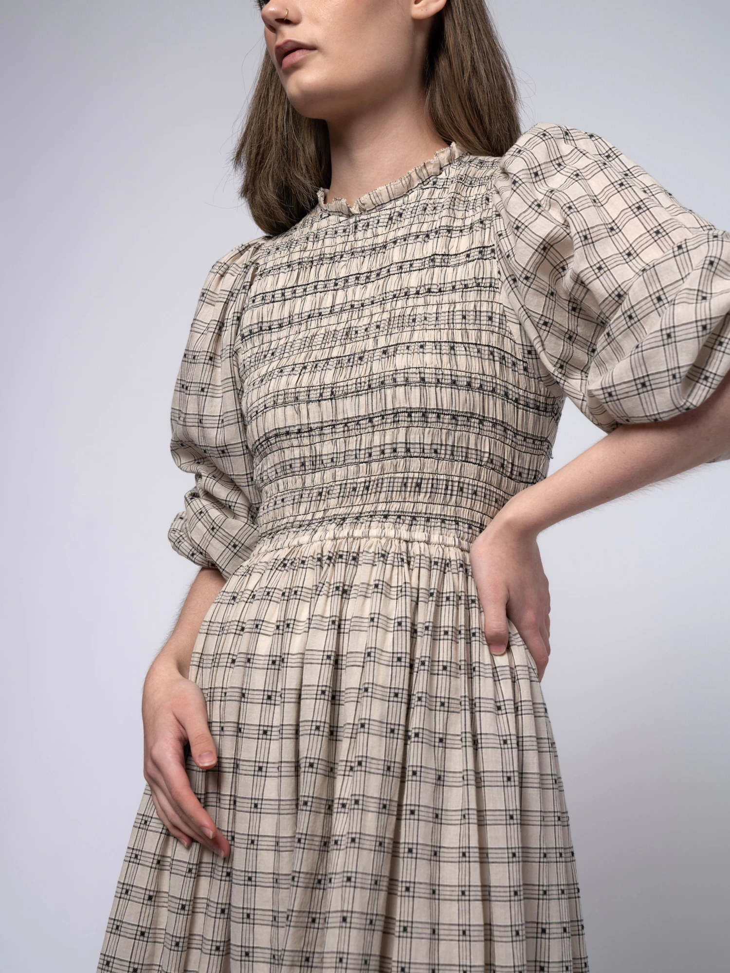 The soft cotton dress has a flattering elasticized smocked bodice fitted through the waist, blouson puff sleeves to the wrist, and a midi-length skirt with a feminine silhouette.