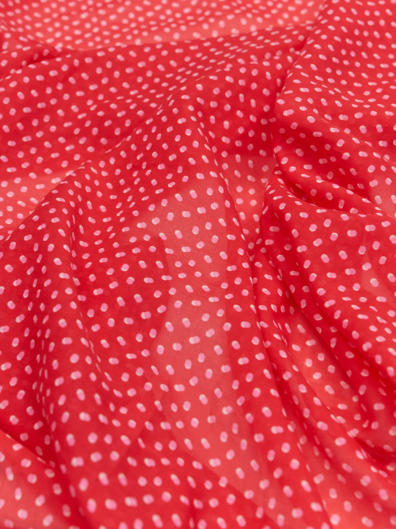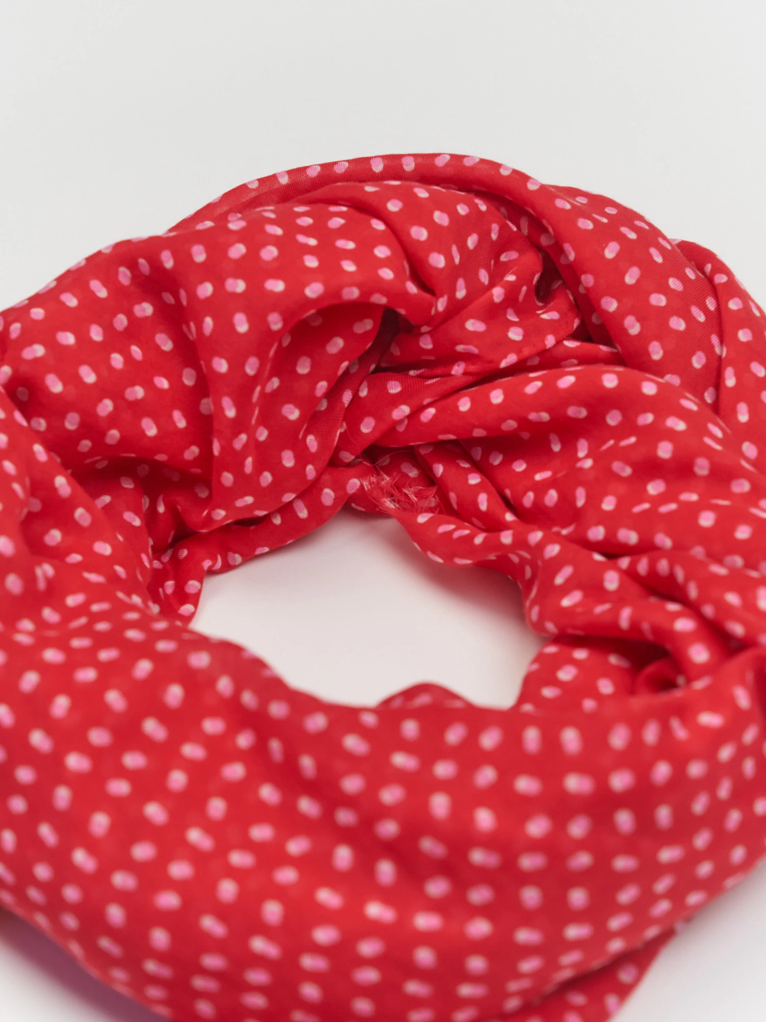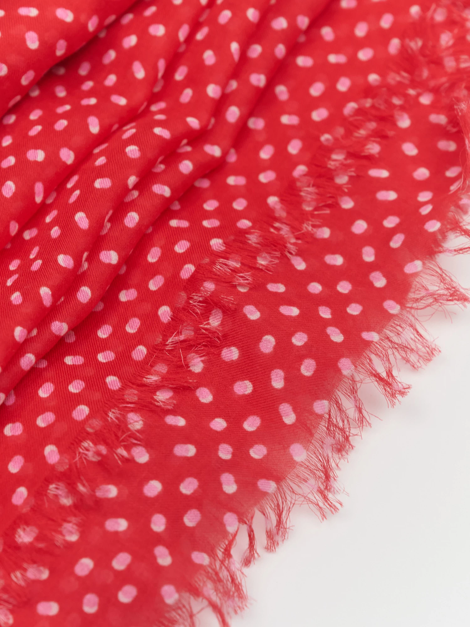 Pink and white dots print cotton scarf on a red background with fringed edges.