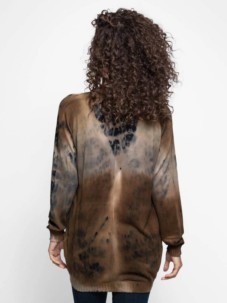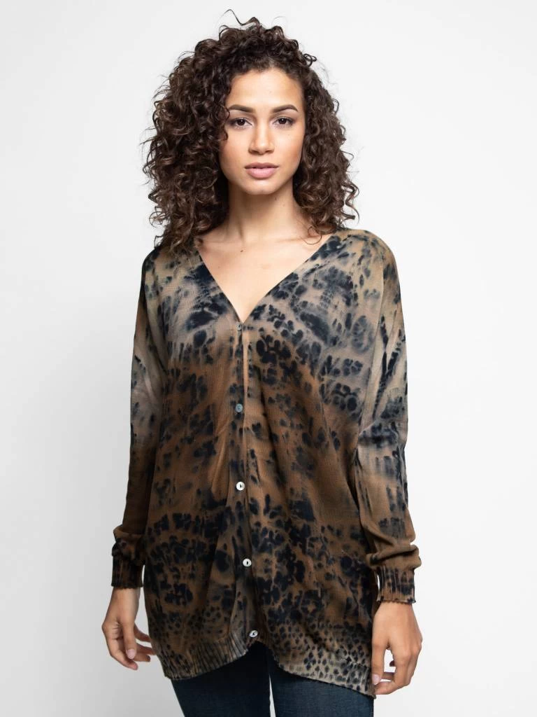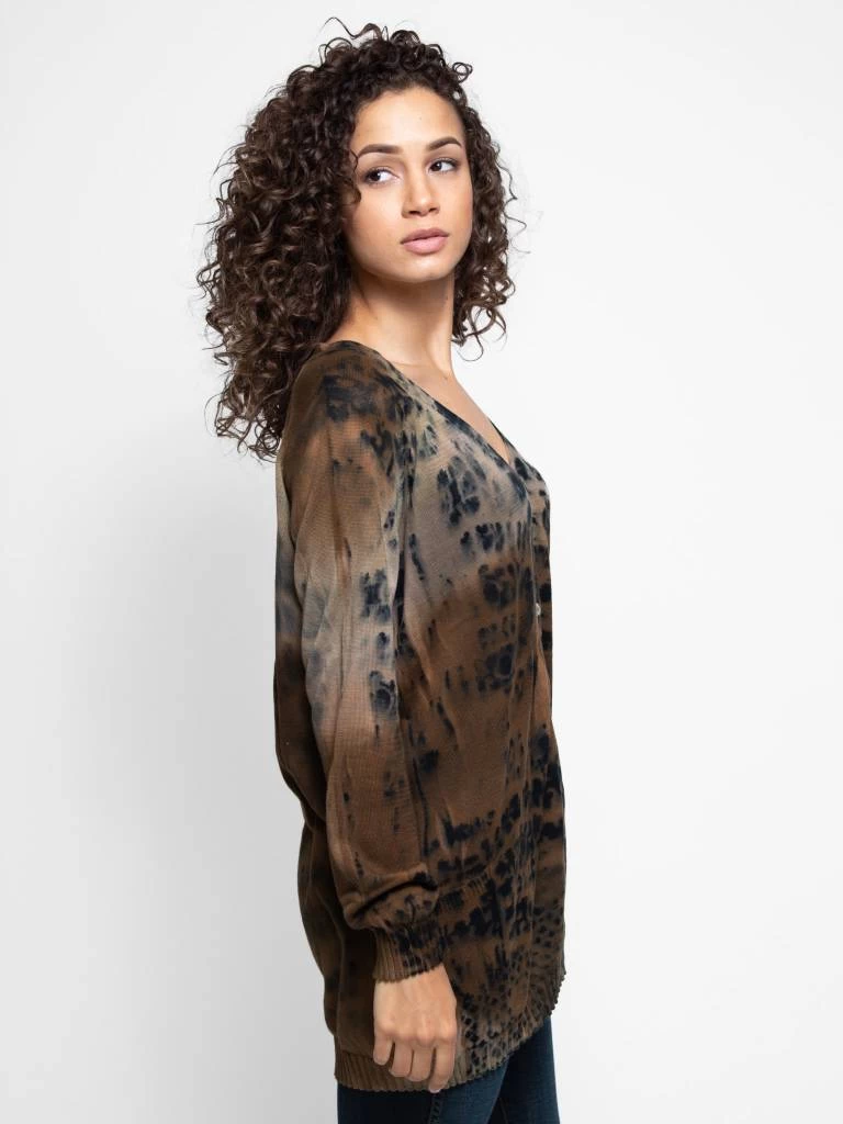 Long sleeve v-neck cardigan with two side pockets, button front closure, and vintage print throughout.