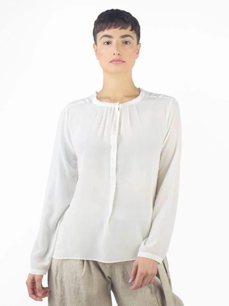 A lightweight shirt with a button placket, round neckline, and soft pleated details.