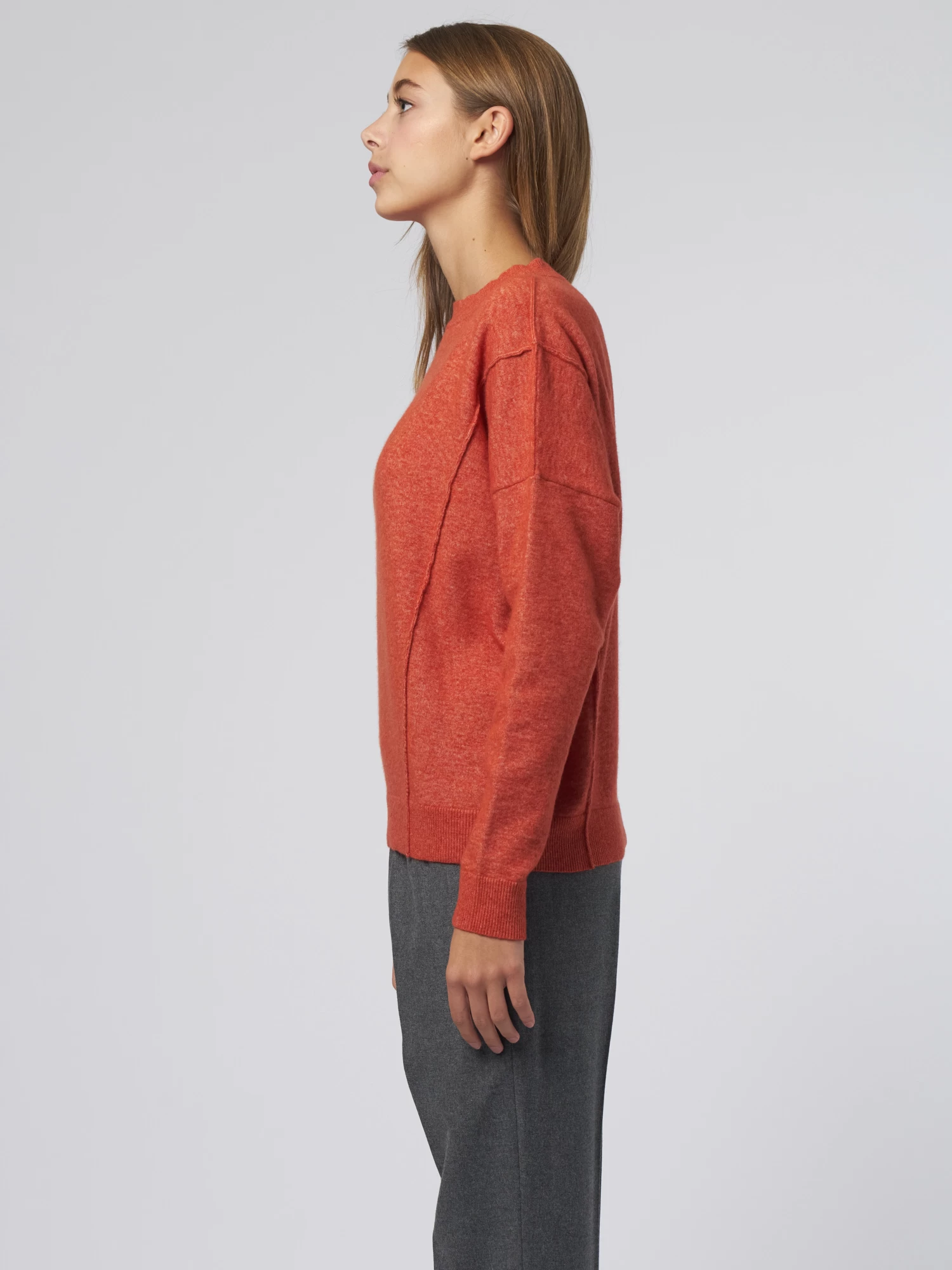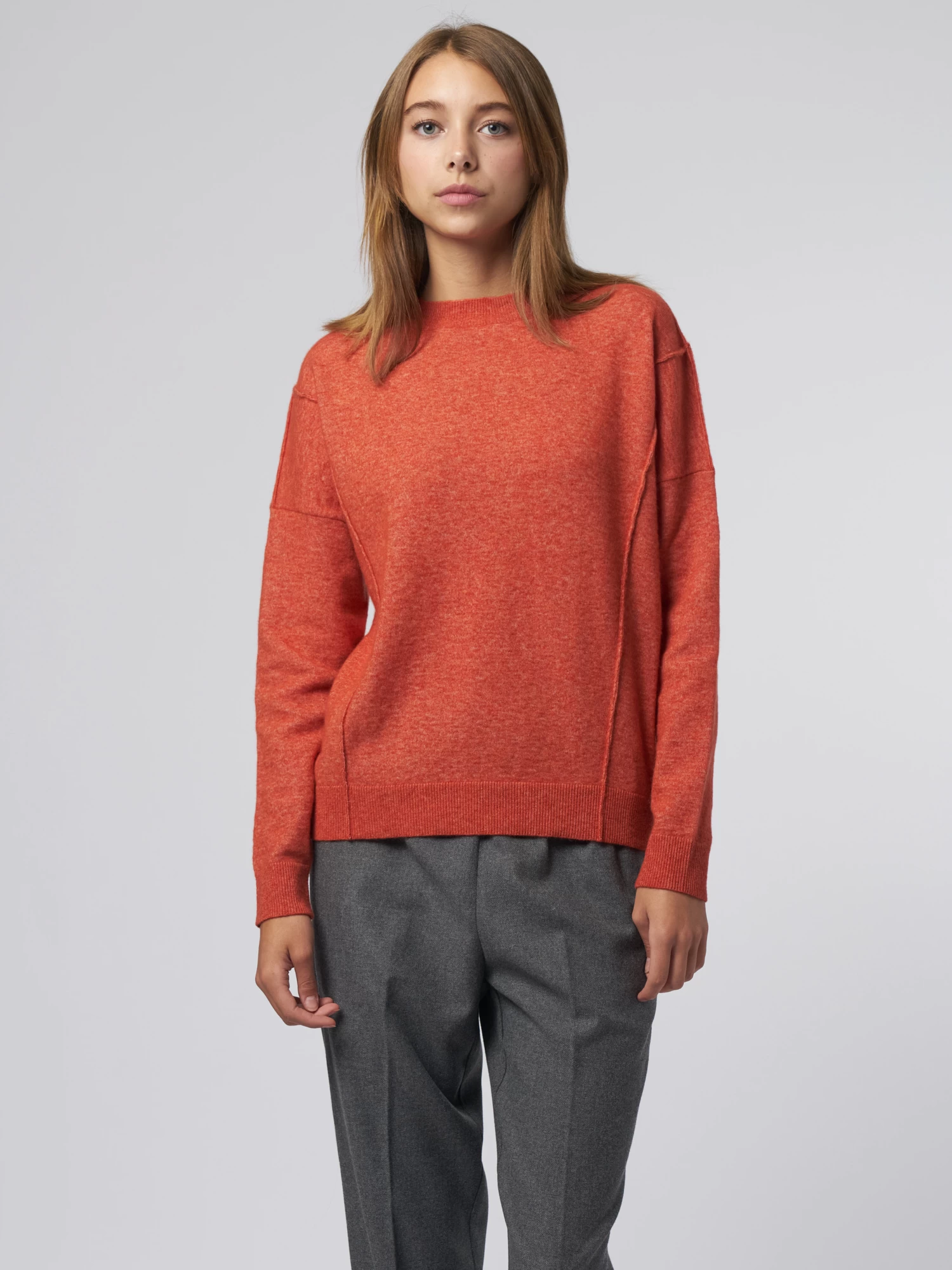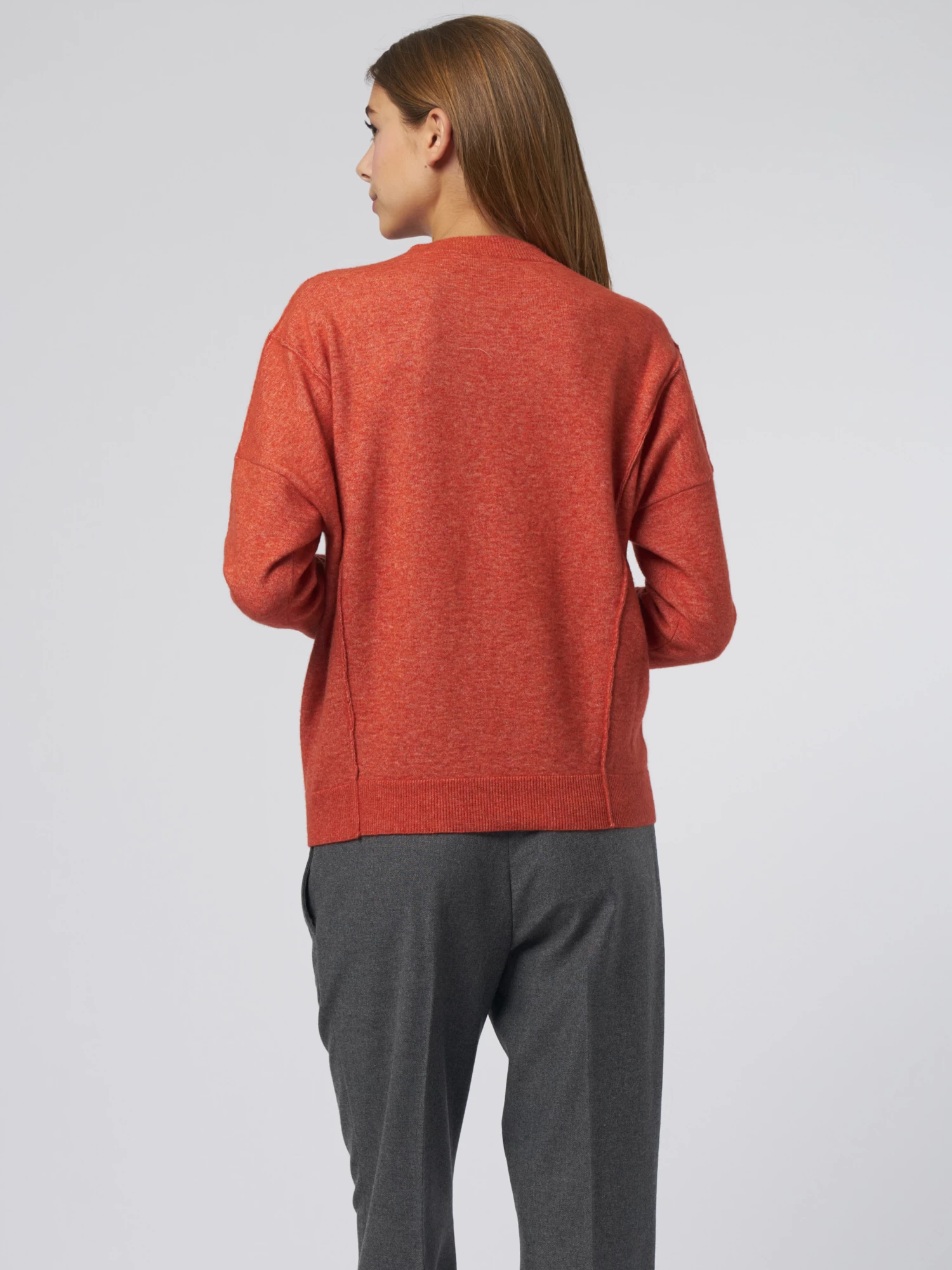 Merino wool sweater has a slight drop shoulder with visible stitching.