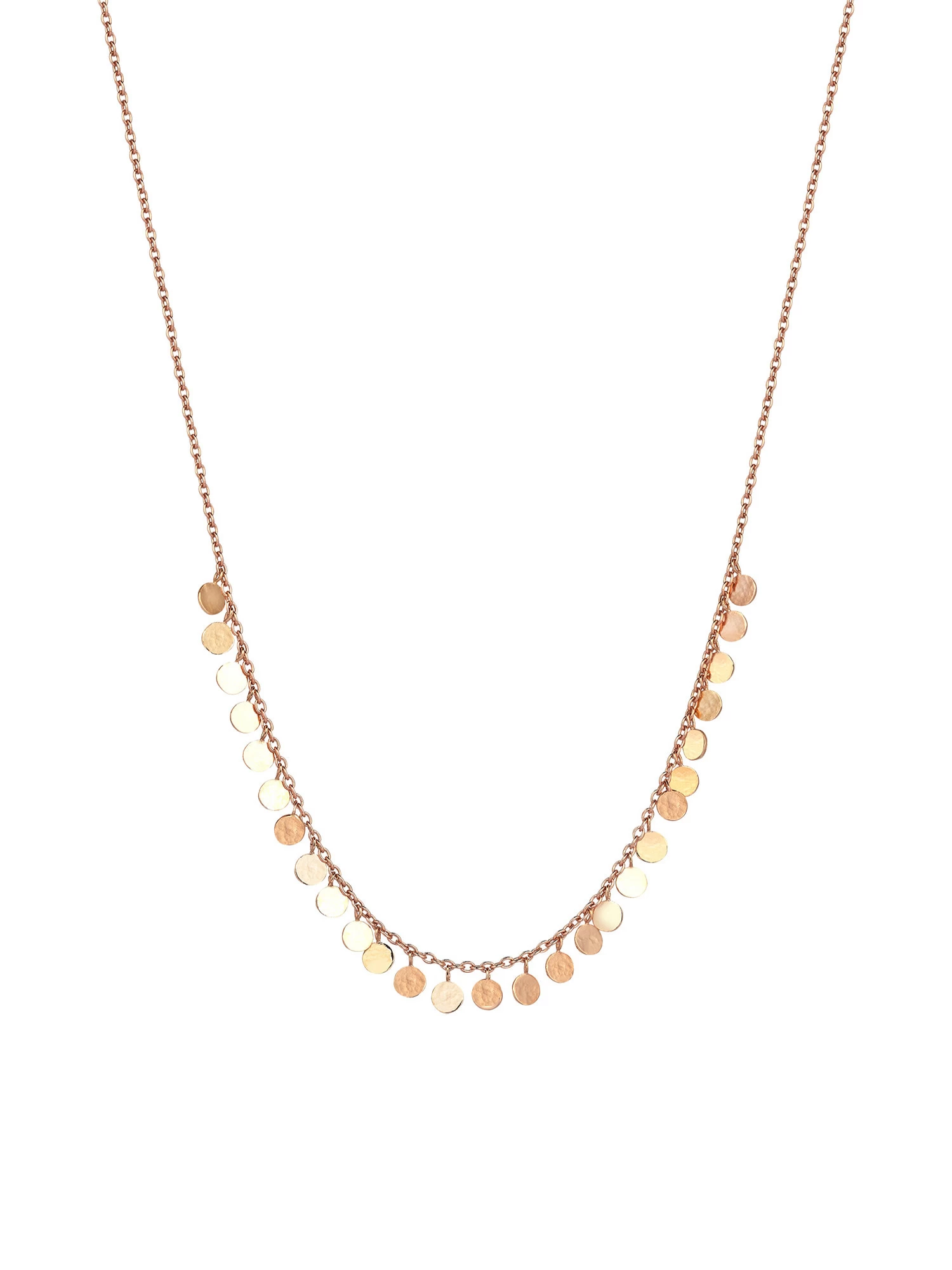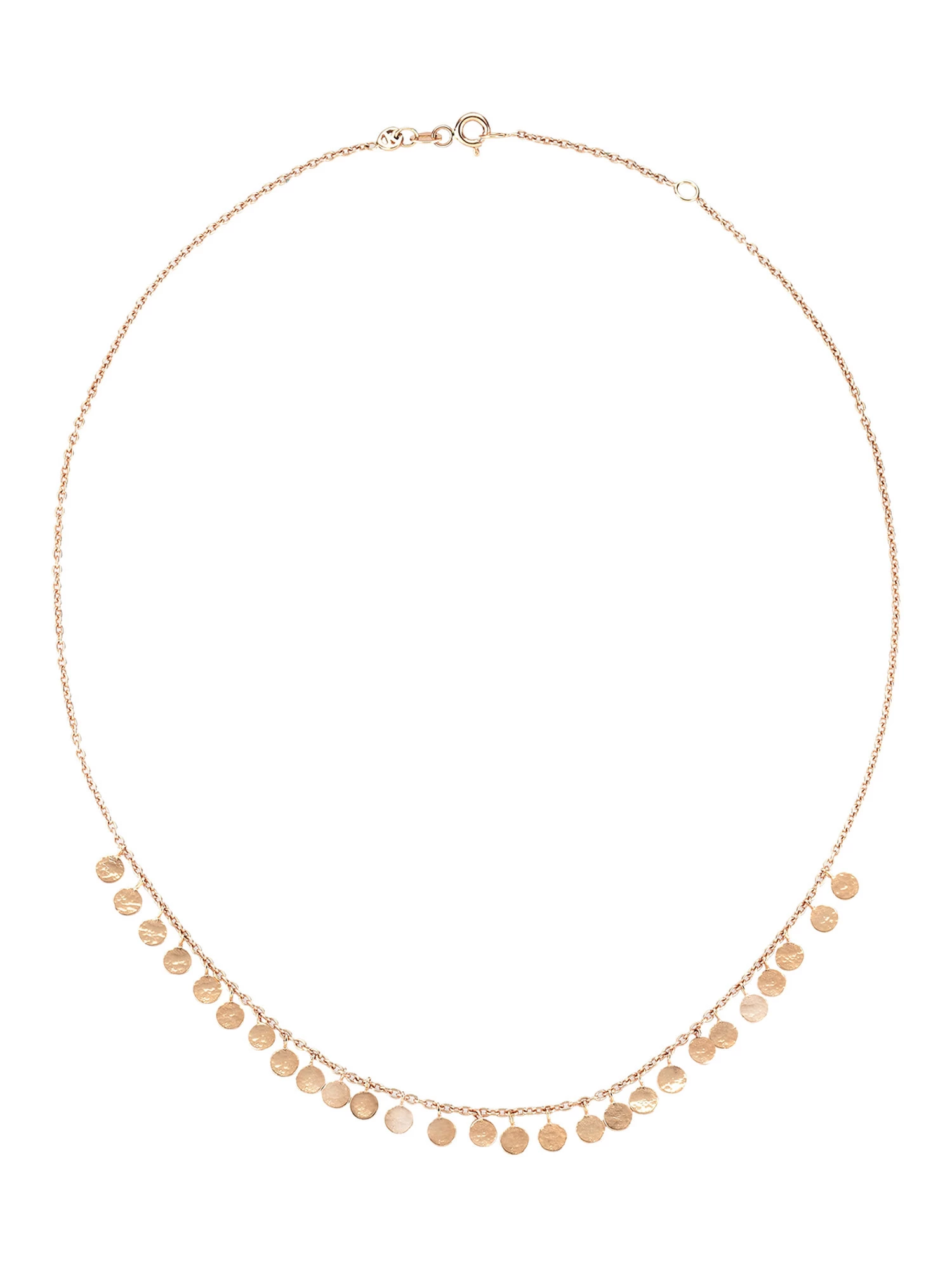 A delicate 18″ adjustable length chain necklace features small hammered circular discs in 14K rose gold.
