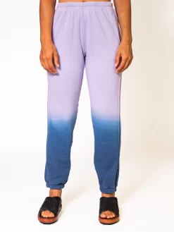 The slouch pant worn on the hip with a loose elastic cuff and a drop rise in Violet Blue Ombre dip dye.