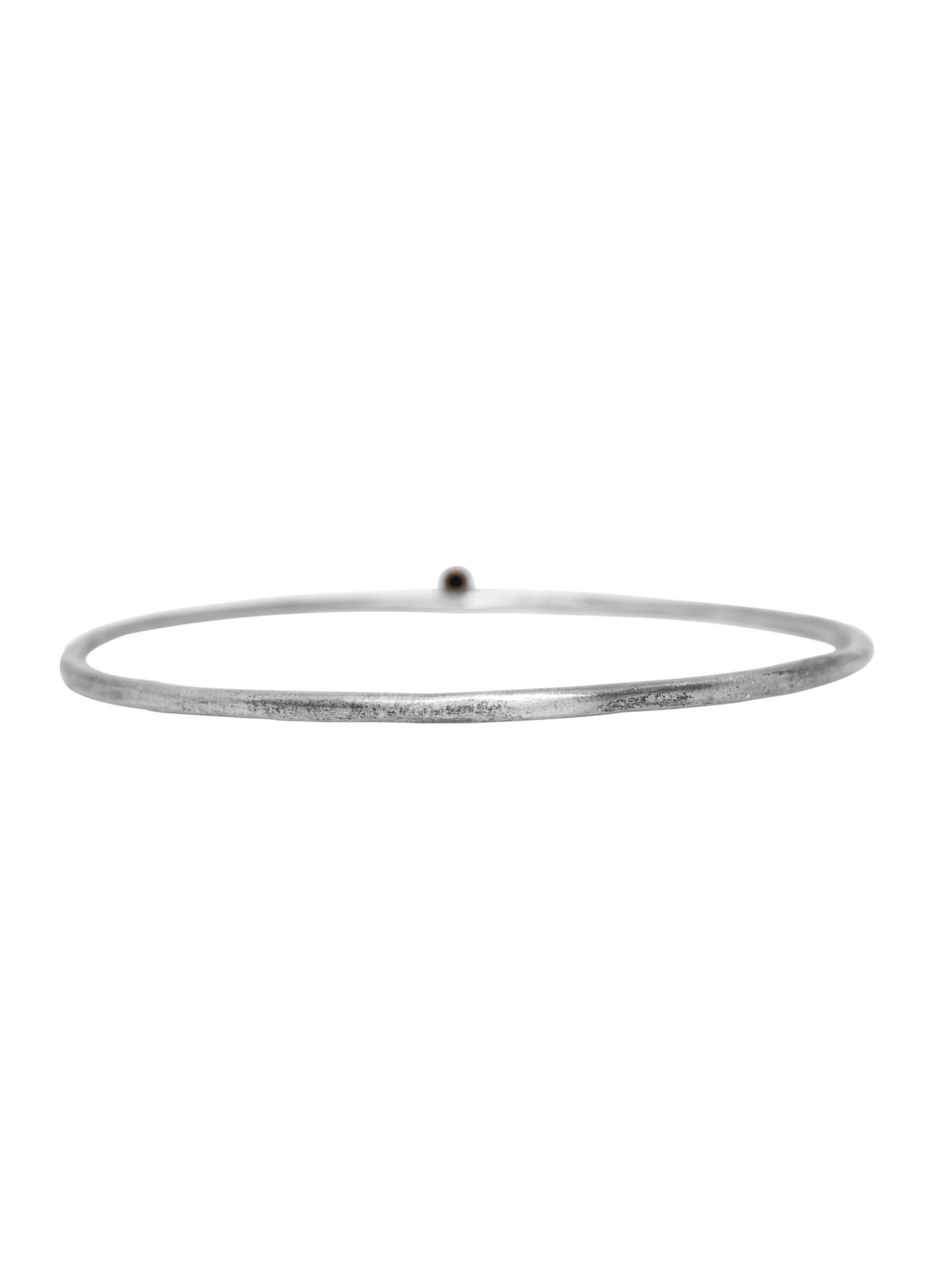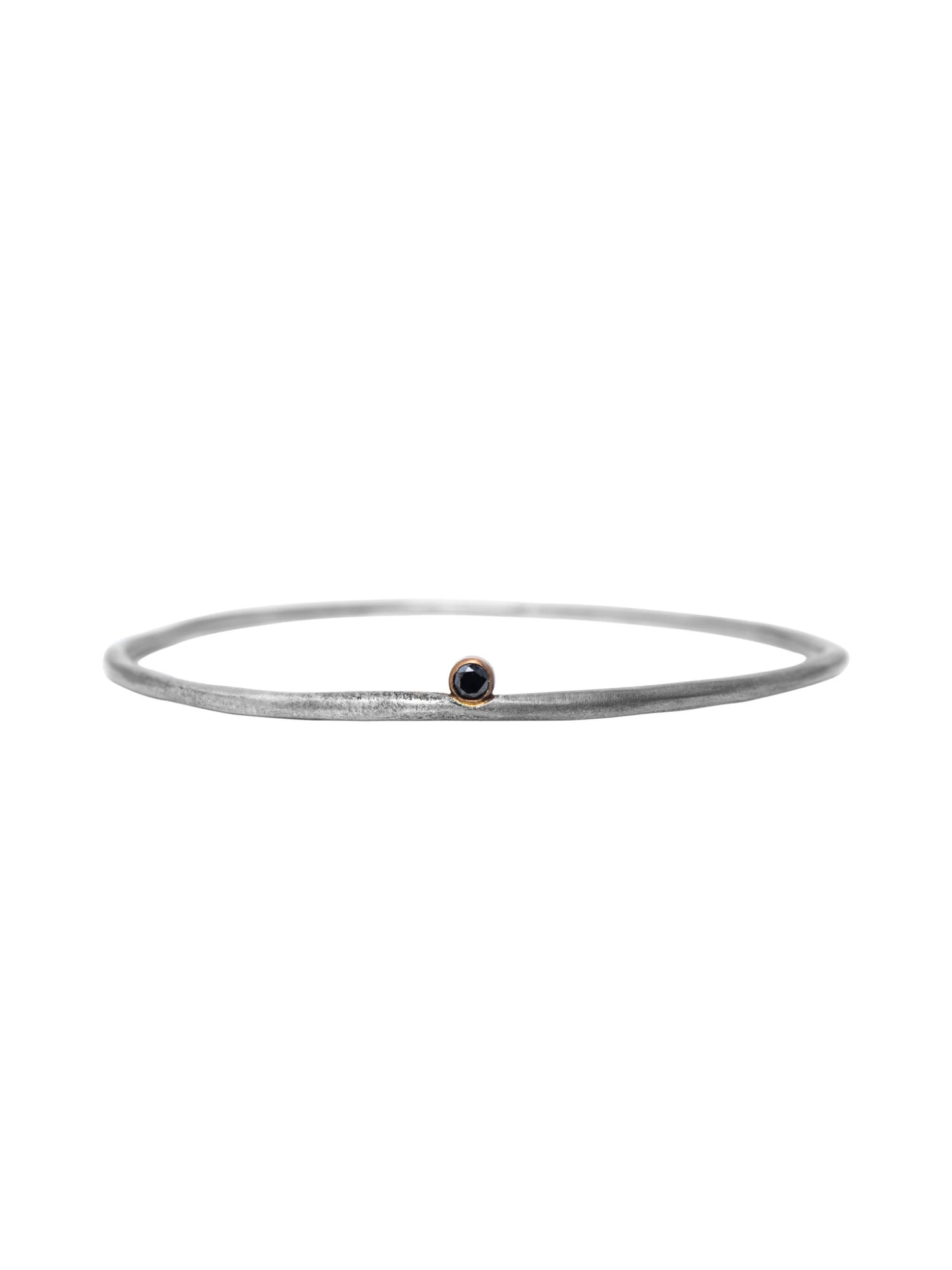 A simple sterling silver bangle bracelet with one small black diamond set in gold.