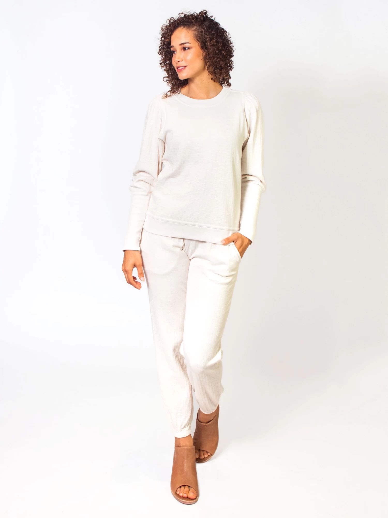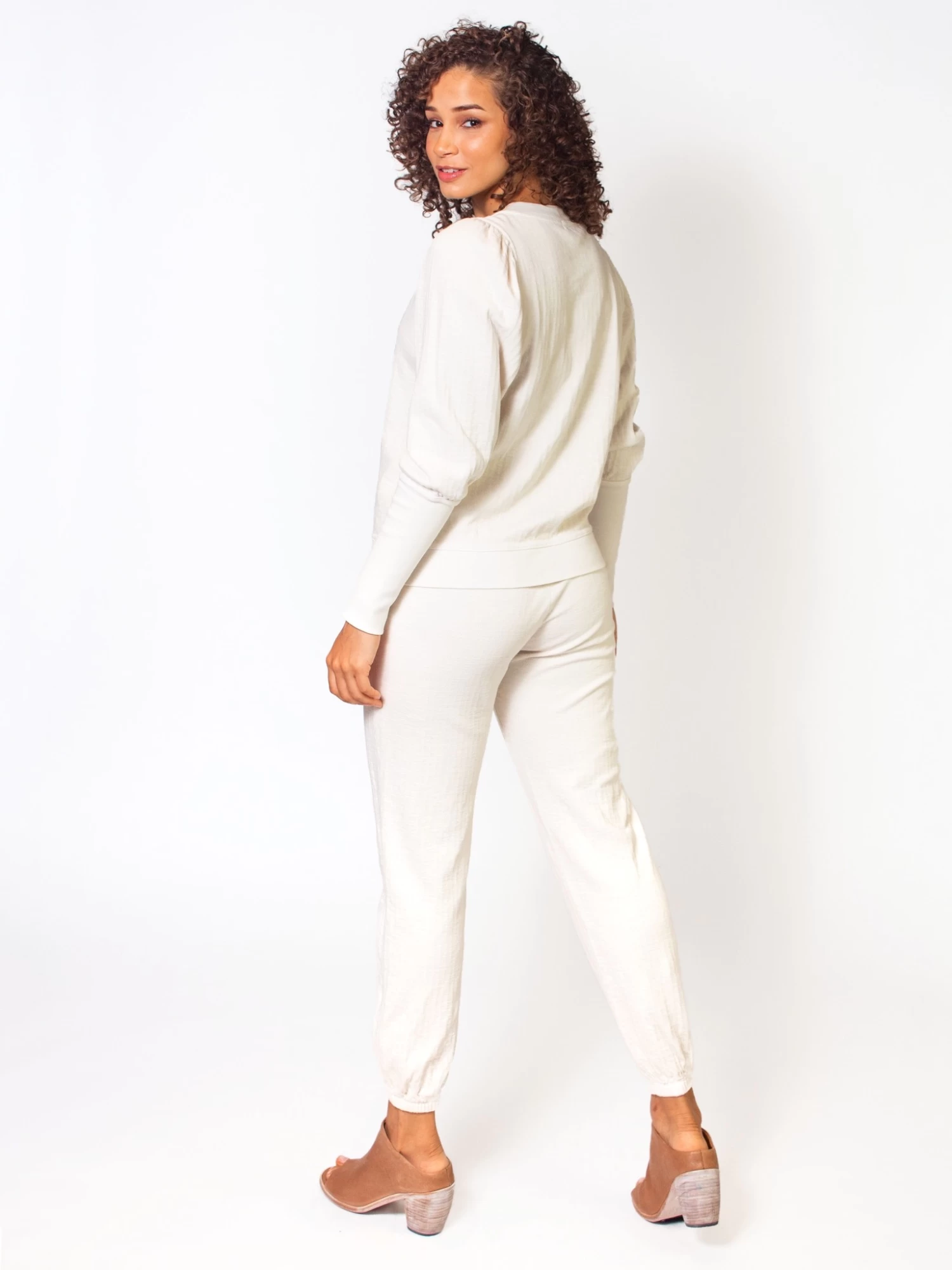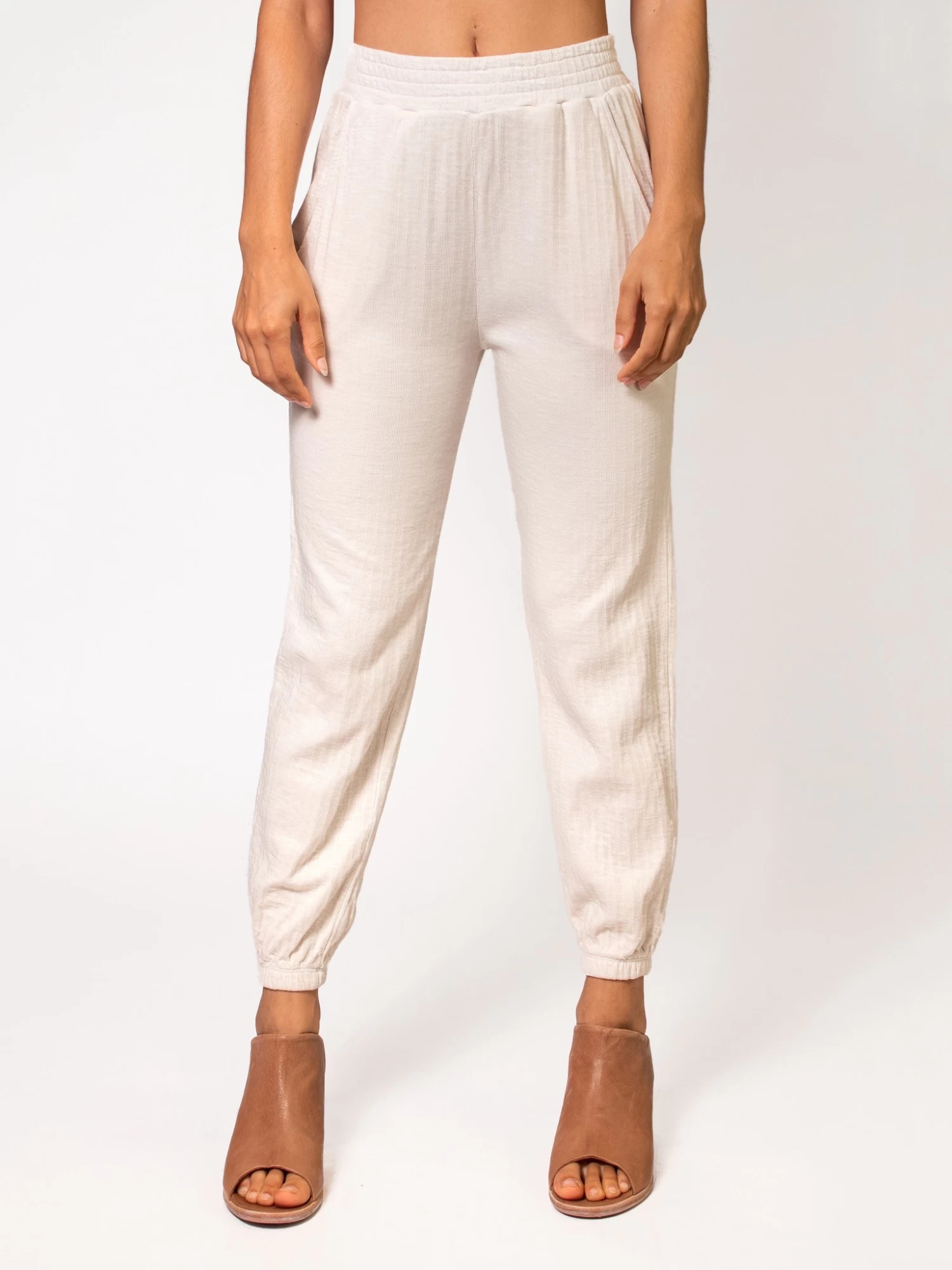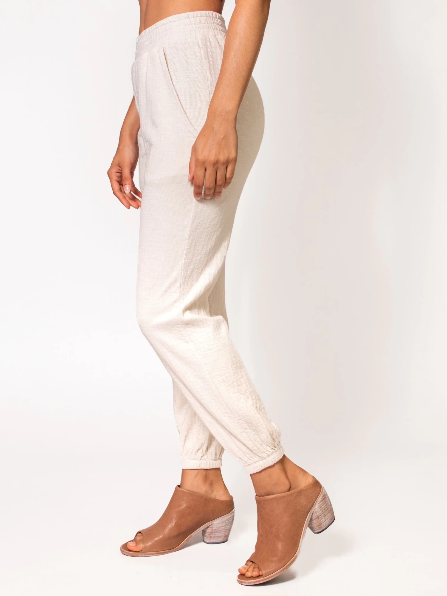 Classic jogger silhouette cut from an organic cotton in cream. Side pockets and an elasticated waistband add function and ease.