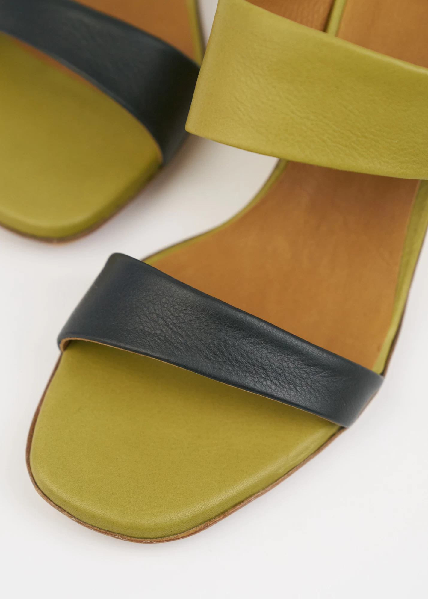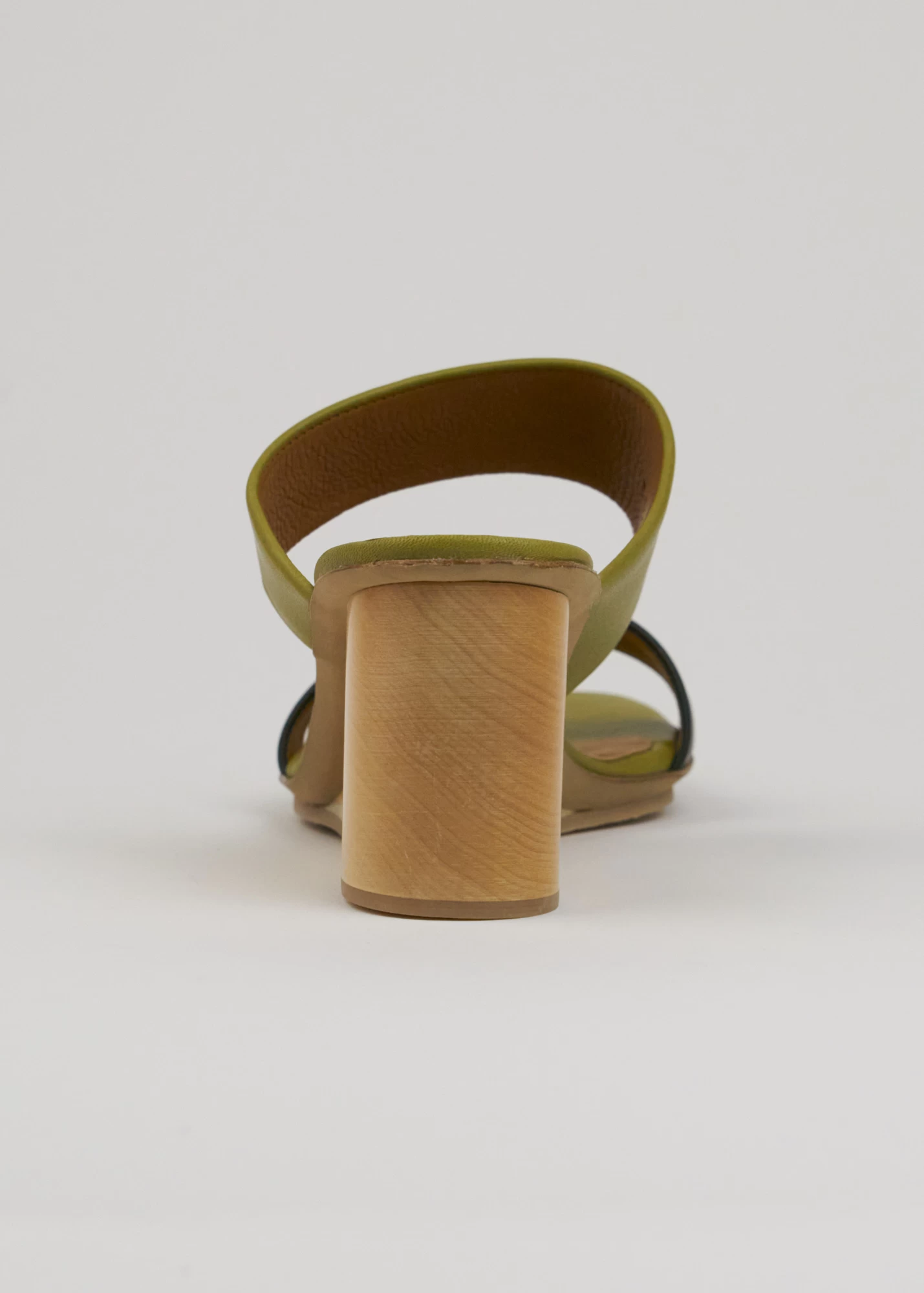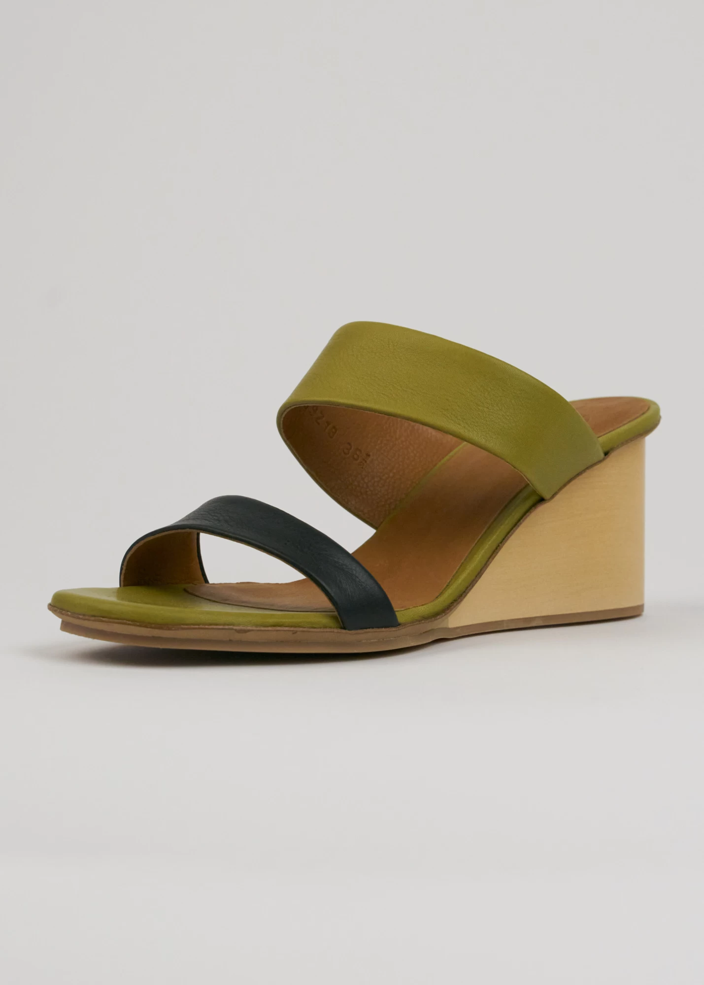 Refined look wedge features two-toned asymmetric straps and an elegantly inset, solid wood wedge.