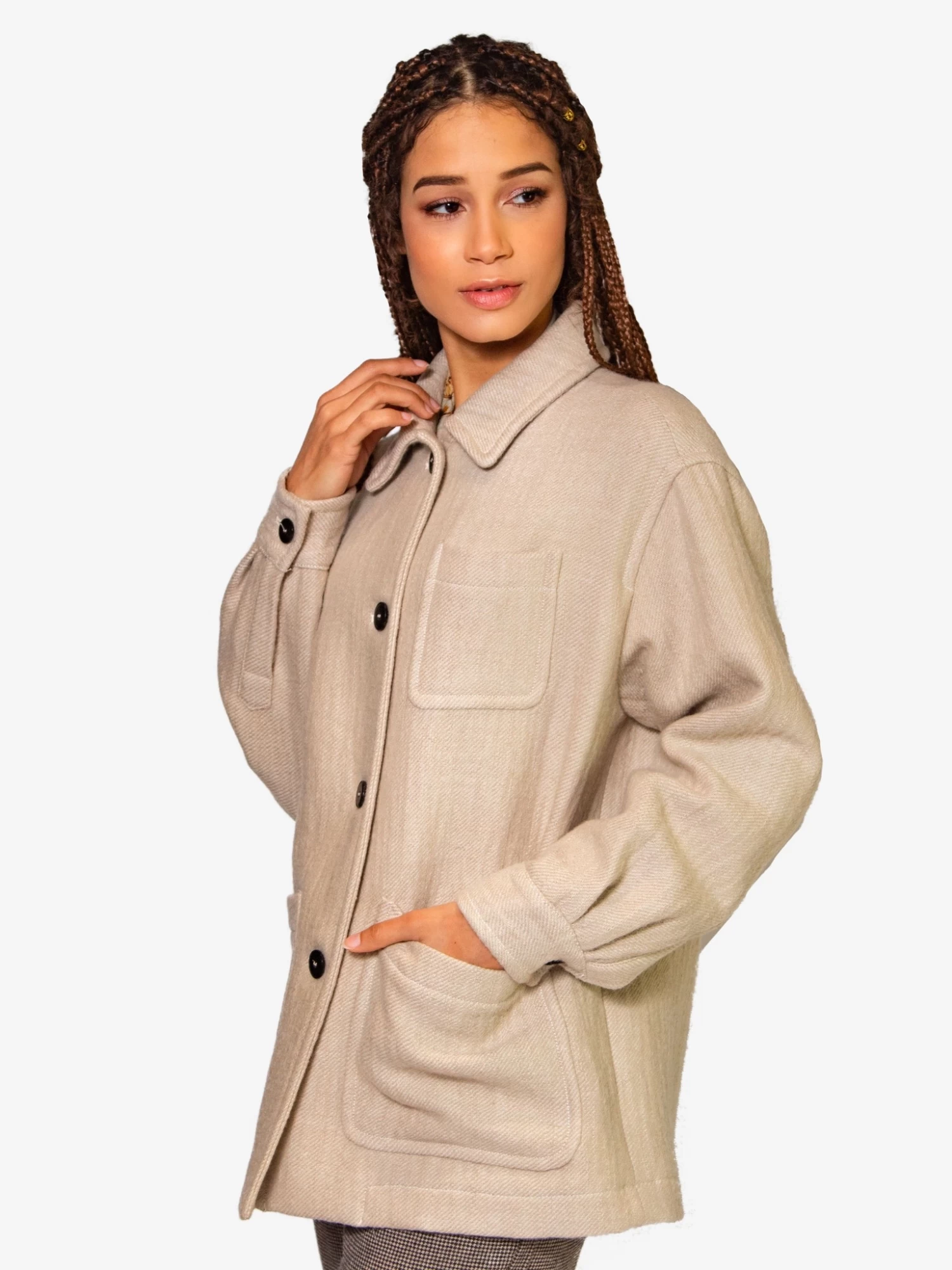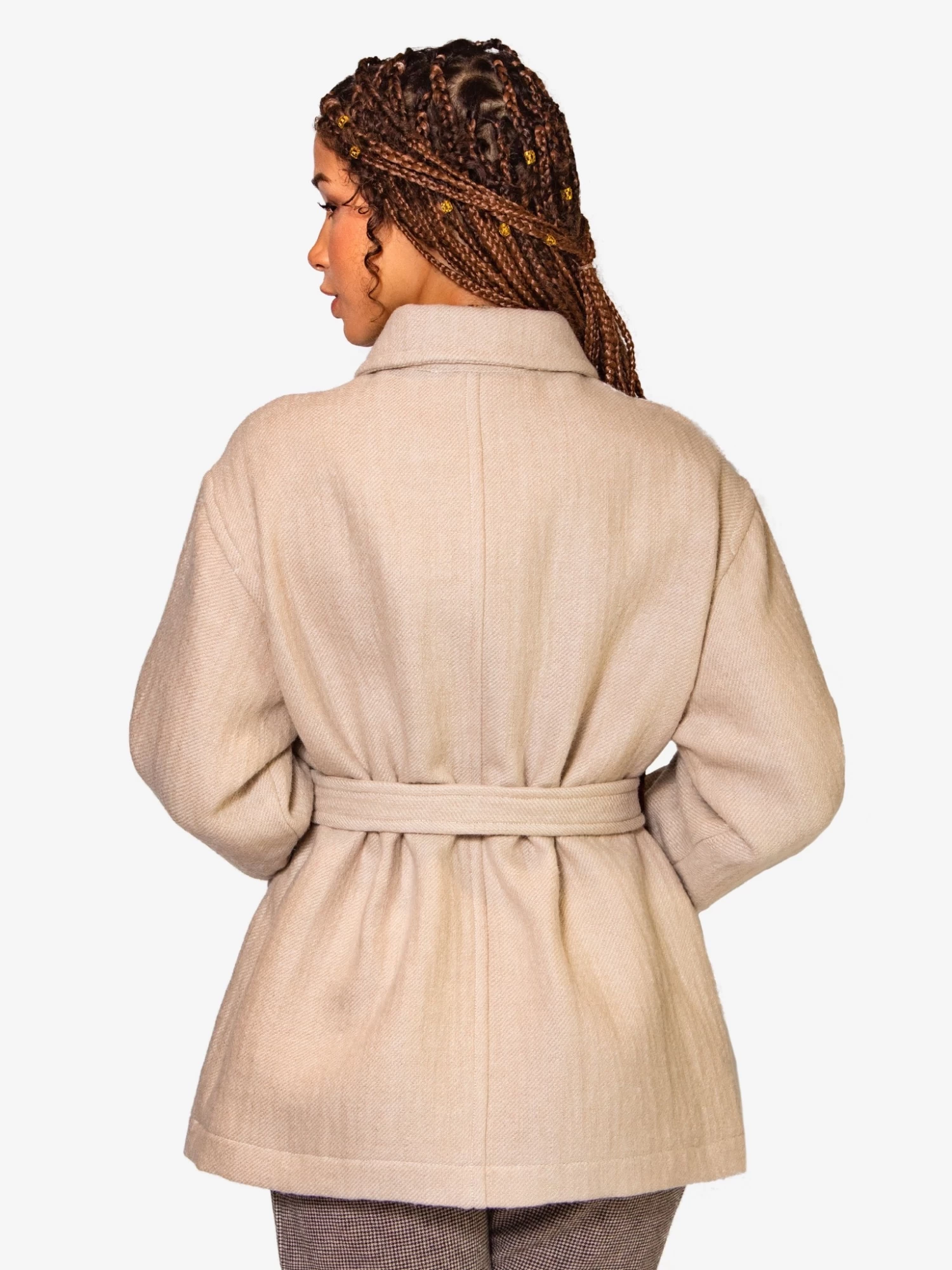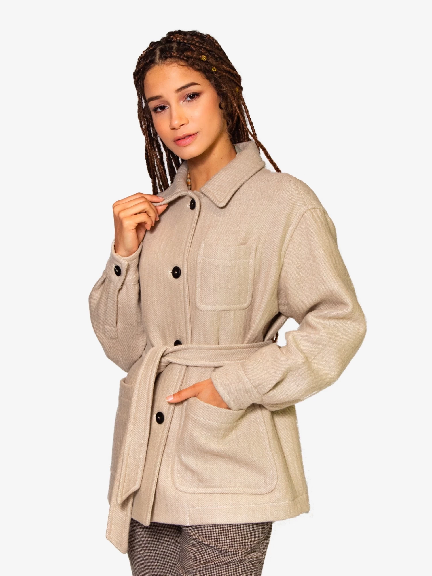Beautiful jacket with two front pockets, a single top left pocket, and button closure. Includes a belt for a tie waist look.