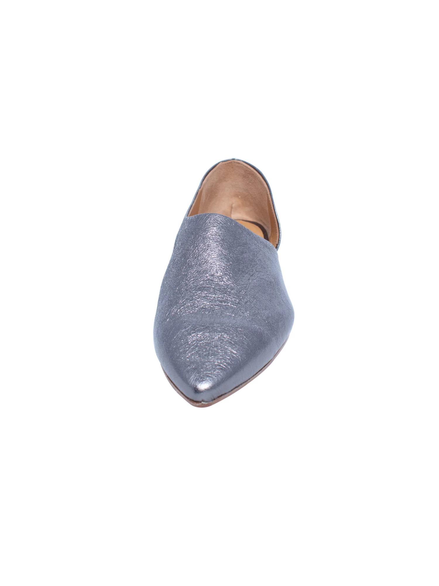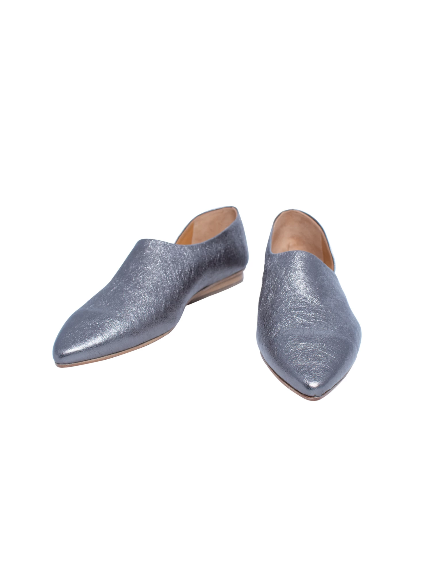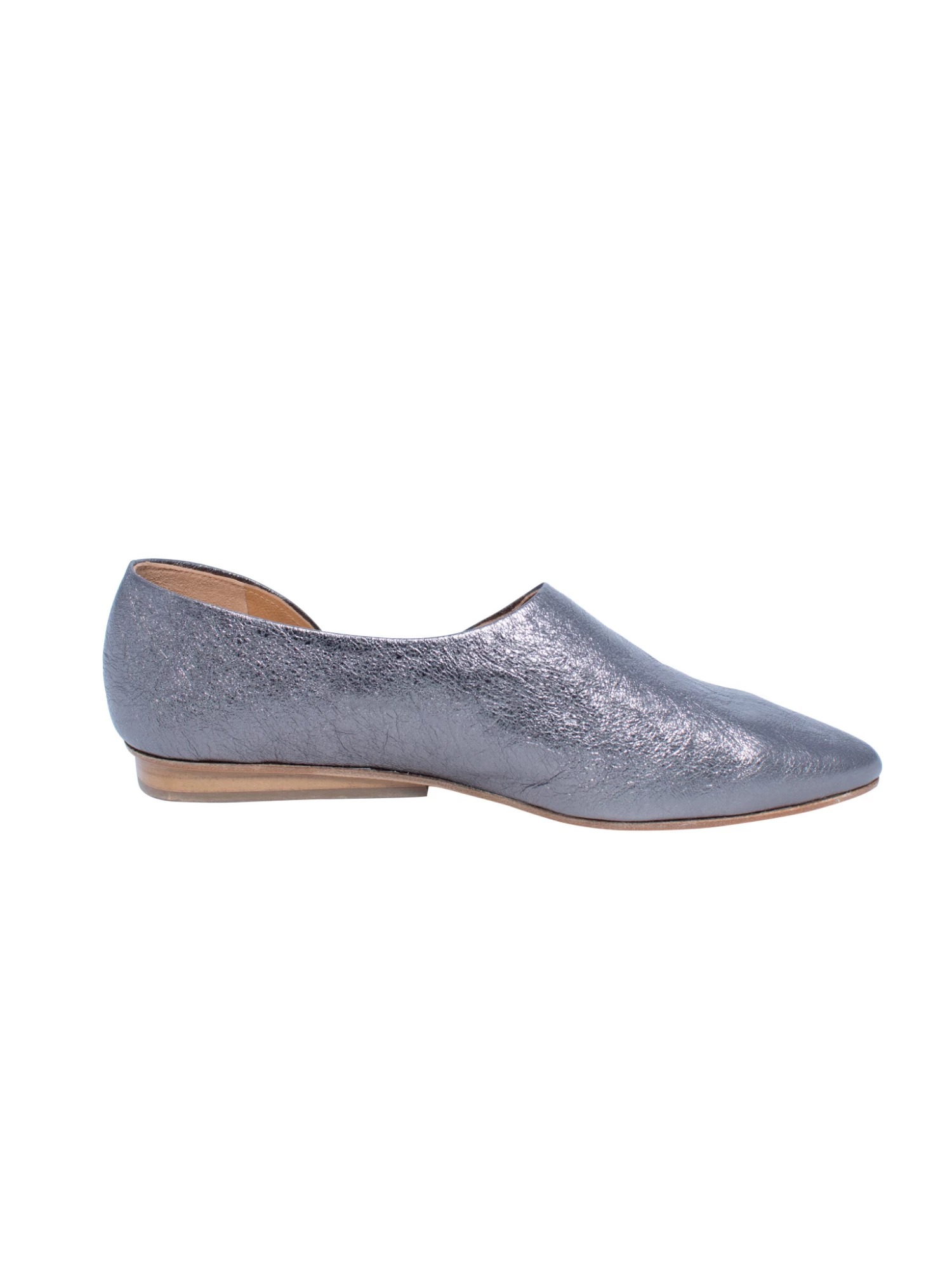A pointed demi d’Orsay flat shoe in a malleable, gunpowder metallic leather.