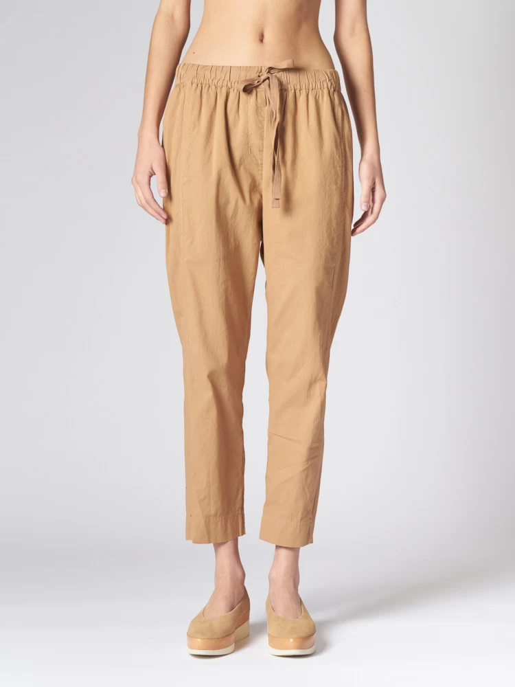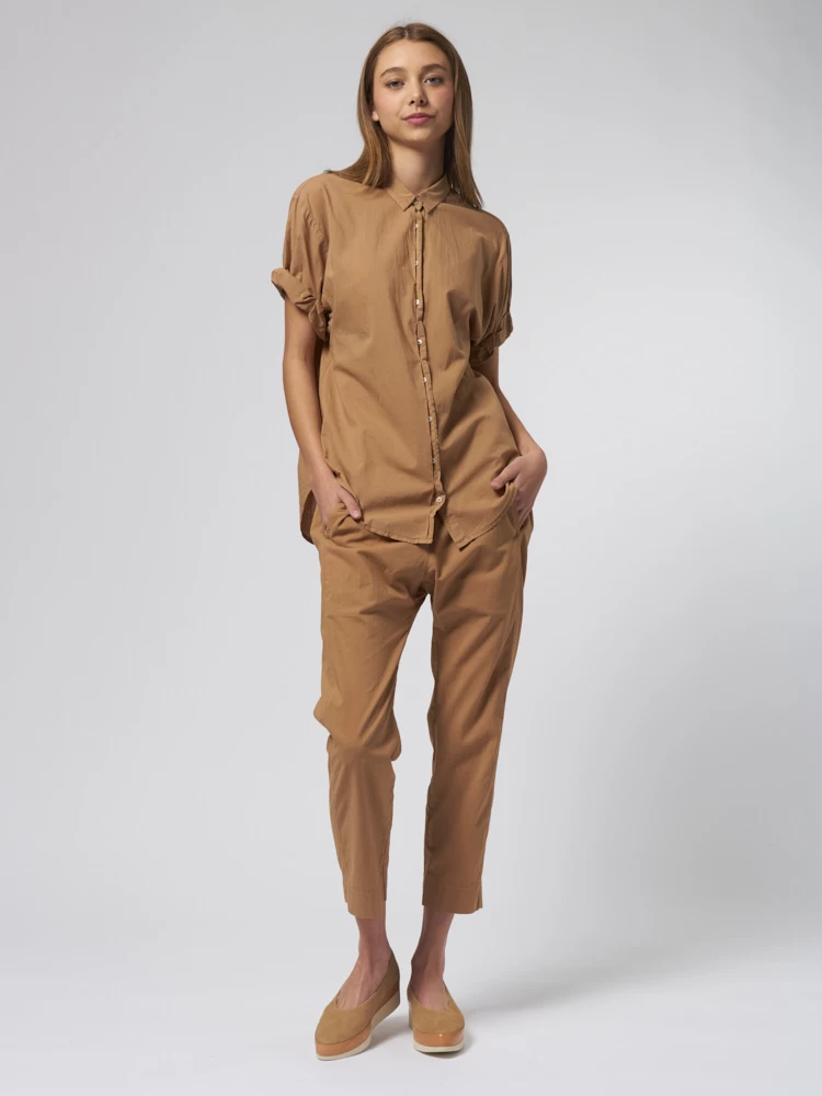 A pull-on pant cut with a slight drop rise in cotton poplin.