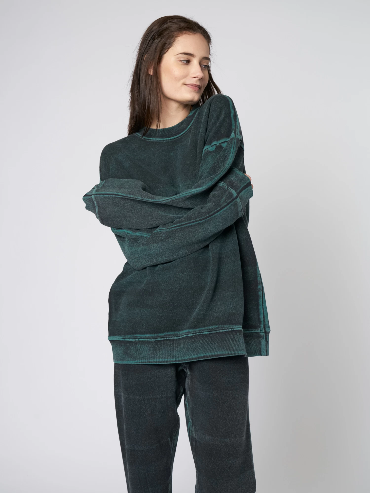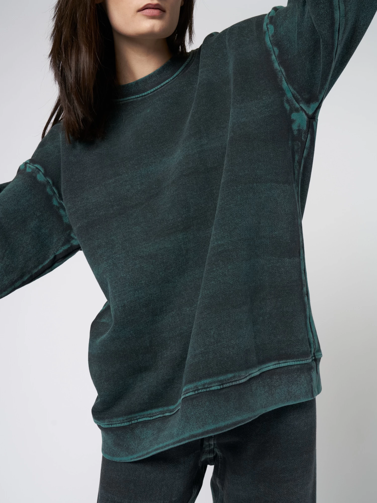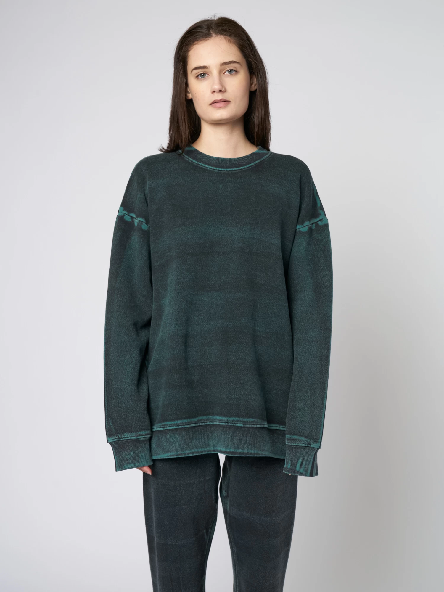 Baby rib sweatshirt individually is dyed, painted, and rough-washed with the dimensional hand-painted motif.
