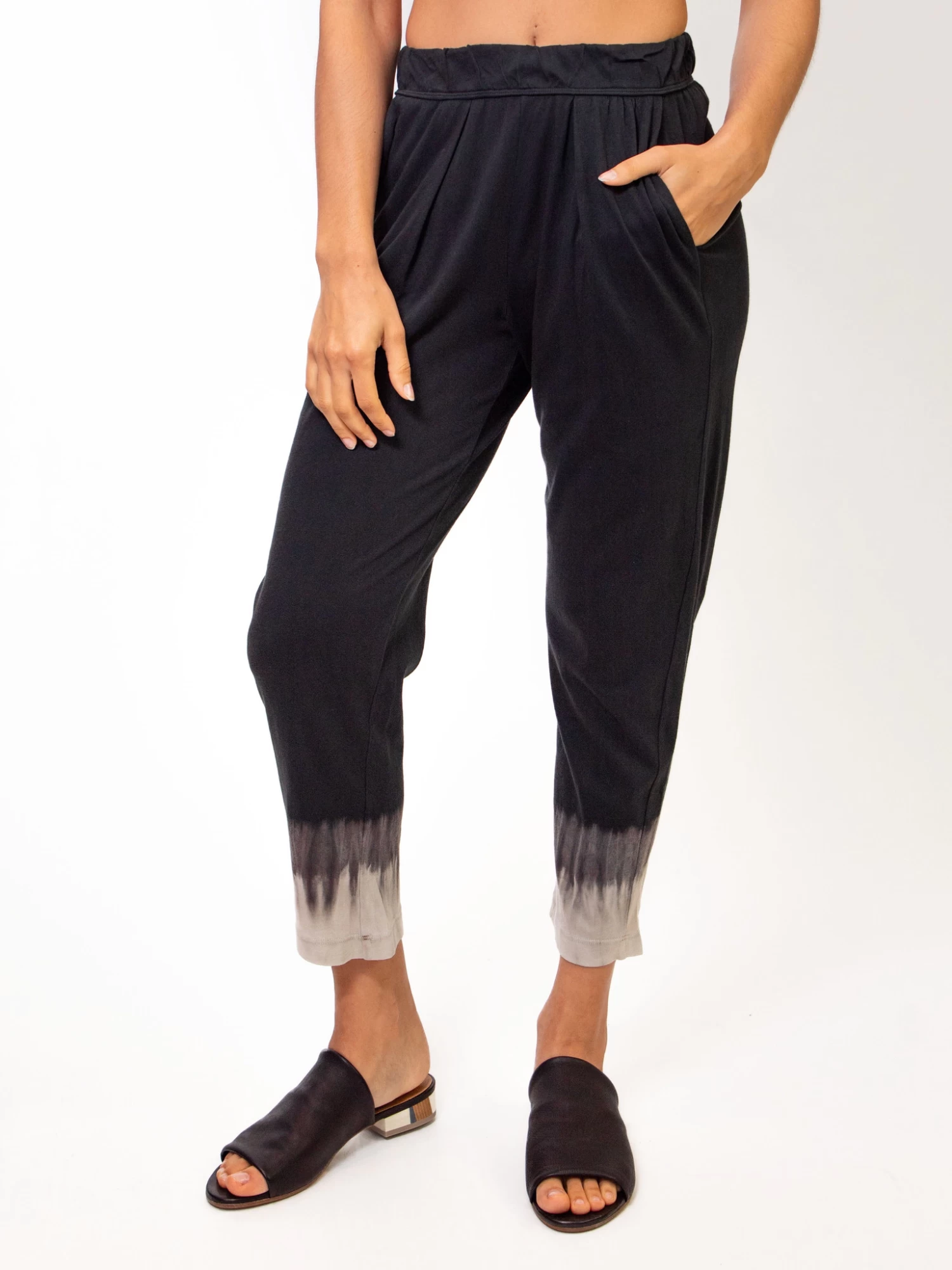 Classic jersey easy pant in a hand dyed black horizon tie dye. Elastic waist pull on pant, and two side pockets.
