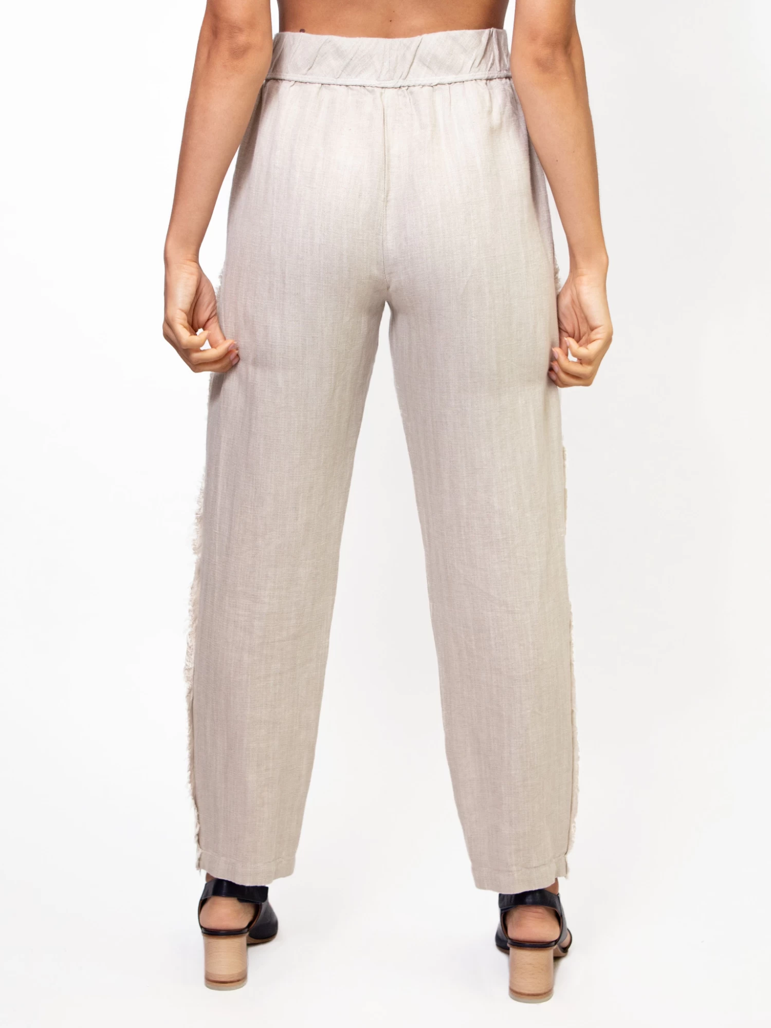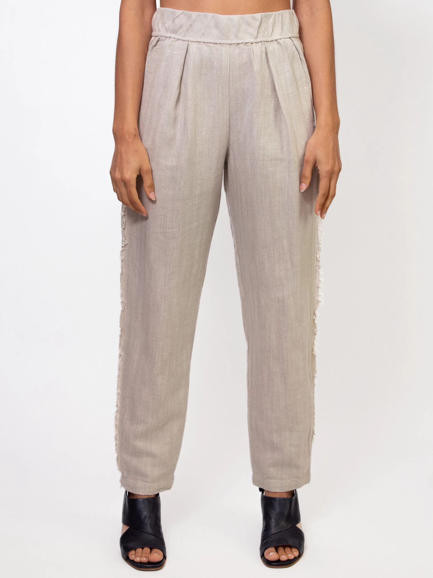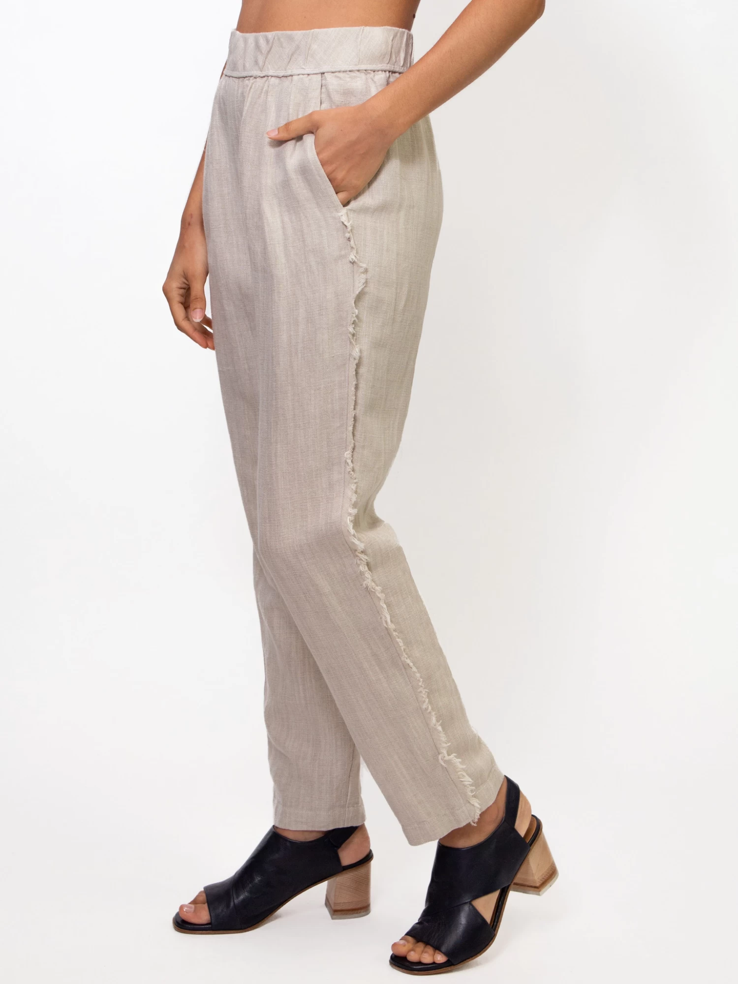 Classic easy pant in a cotton linen blend. Pull on elastic waist, side pockets, and frayed seam detailing along the side.