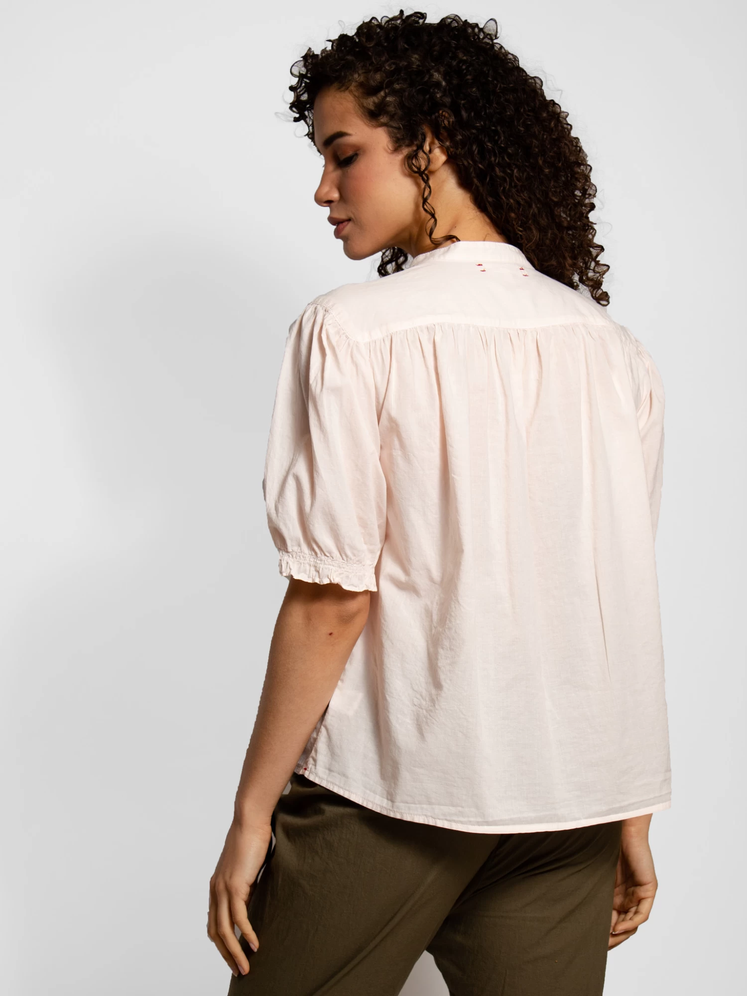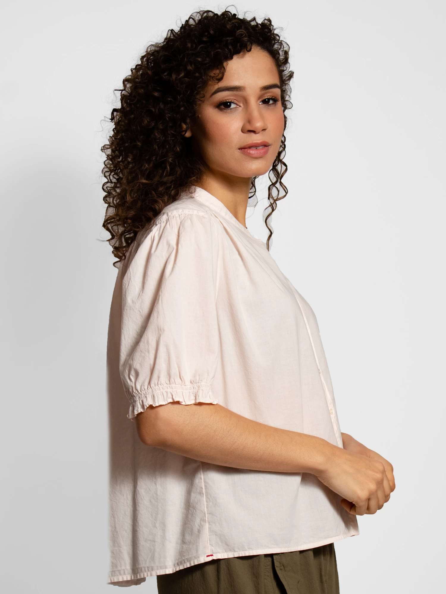 Cotton shirt in pink sands.Button up with a ruffle detail sleeve with soft elastic around the arm.